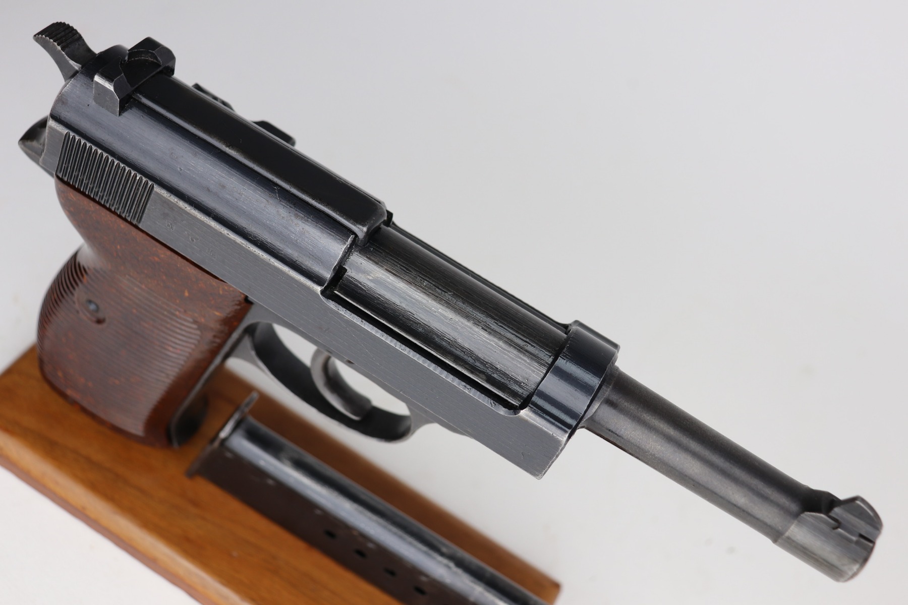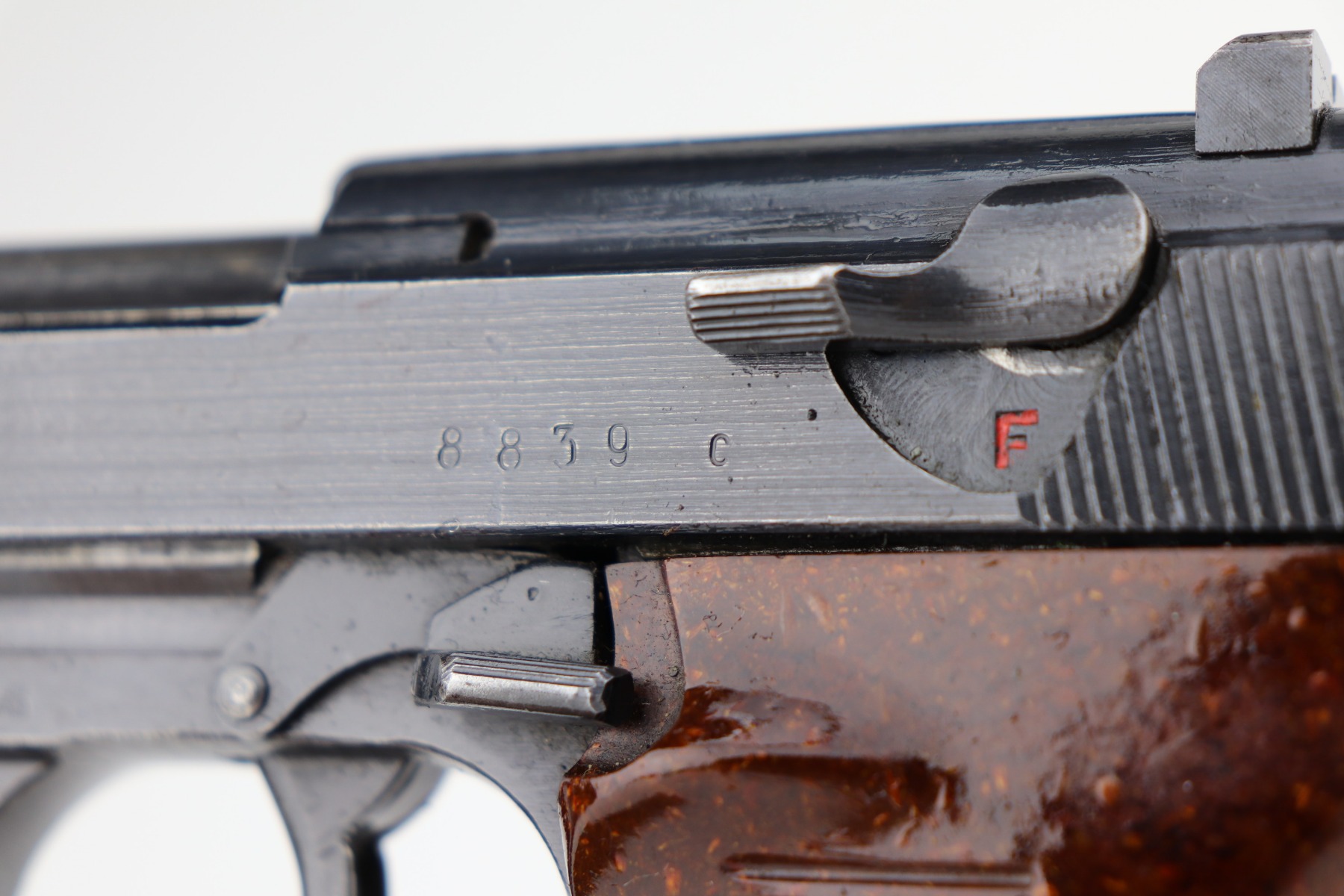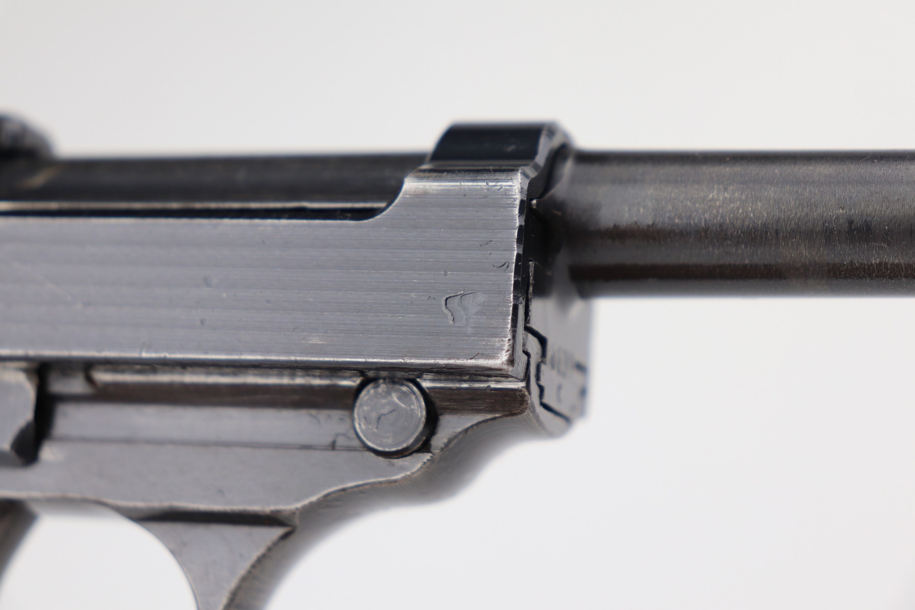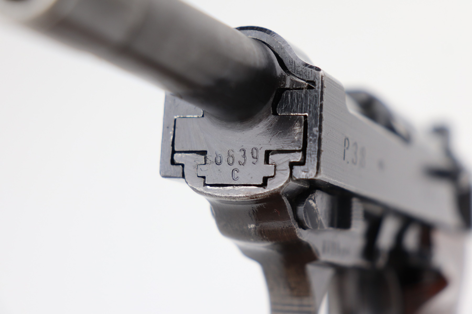 3/15/21 – This is a very nice example of a Spreewerk P.38 rig issued to the Nazi military in June of 1943. It is all matching and has the proper “Eagle 88” military proofs. The rig comes with a nice post-war P.38 holster and two wartime magazines. It has retained about 90% of its original finish. It has excellent profile views, but there is thinning and spotty oxidation on the front strap. Comes with excellent grips. The bore is mint. De-cocker is functional.