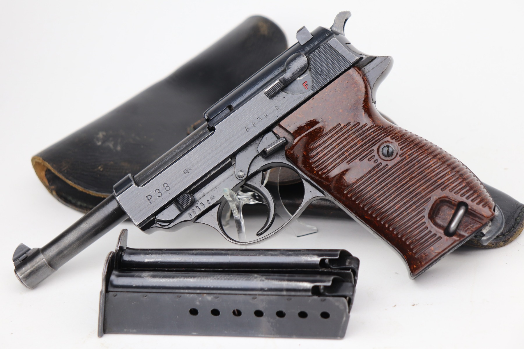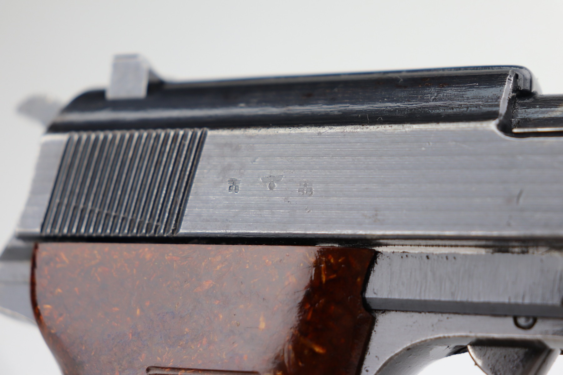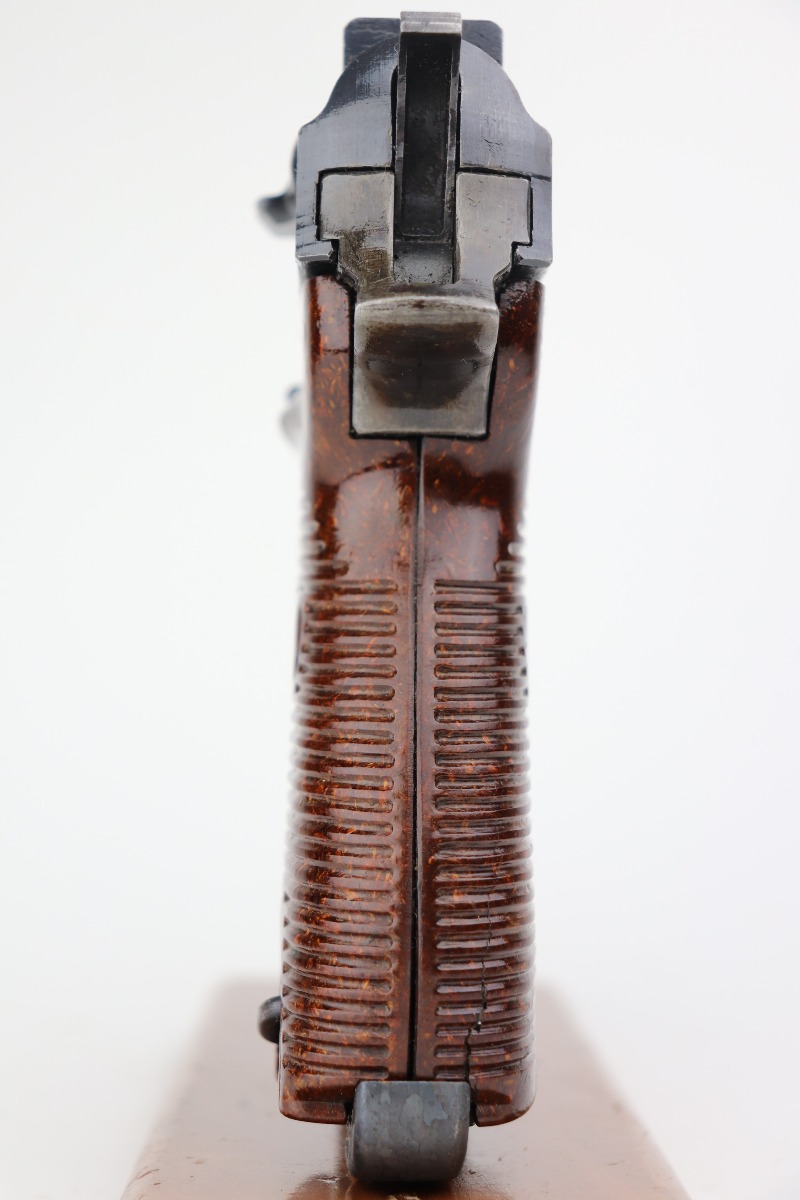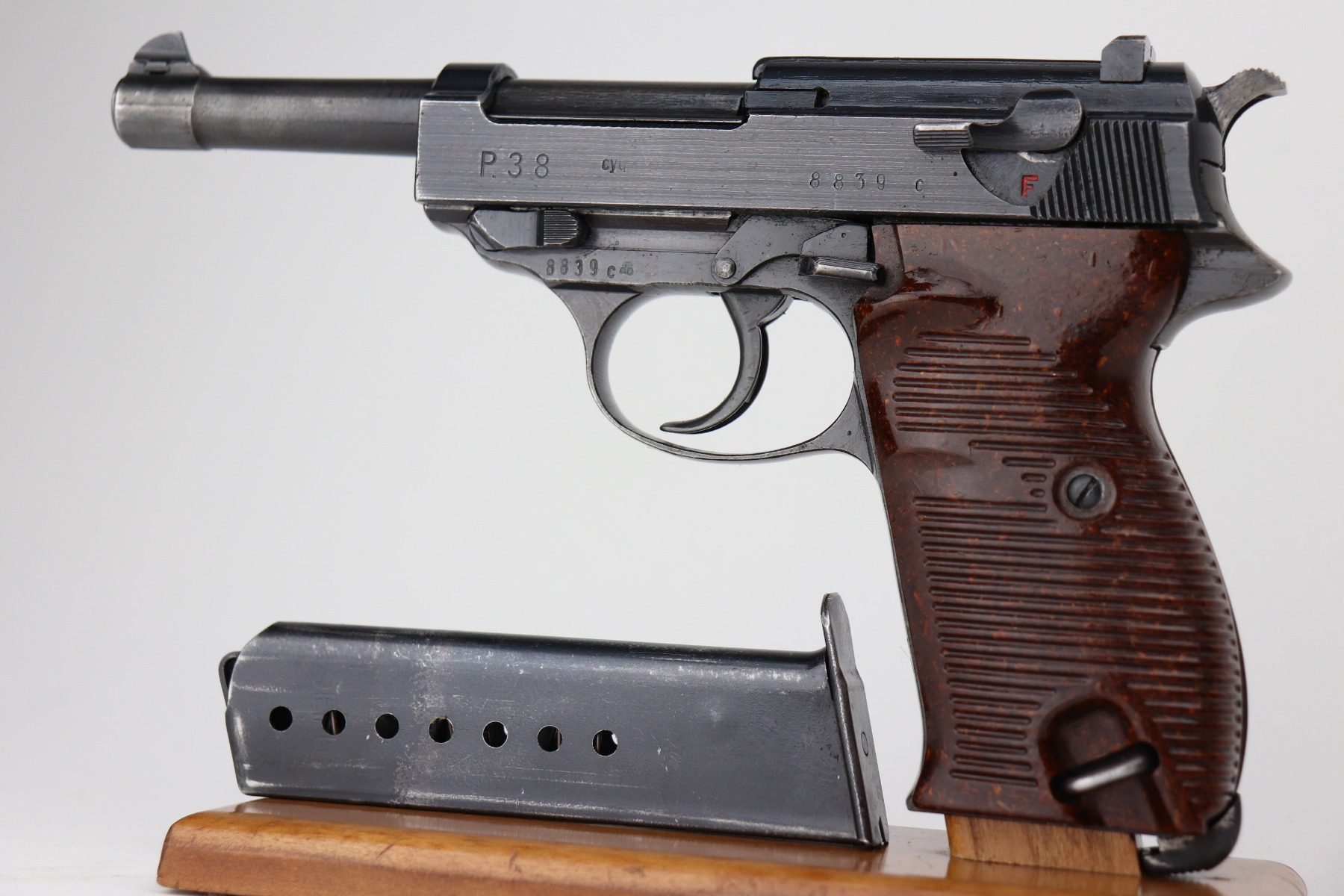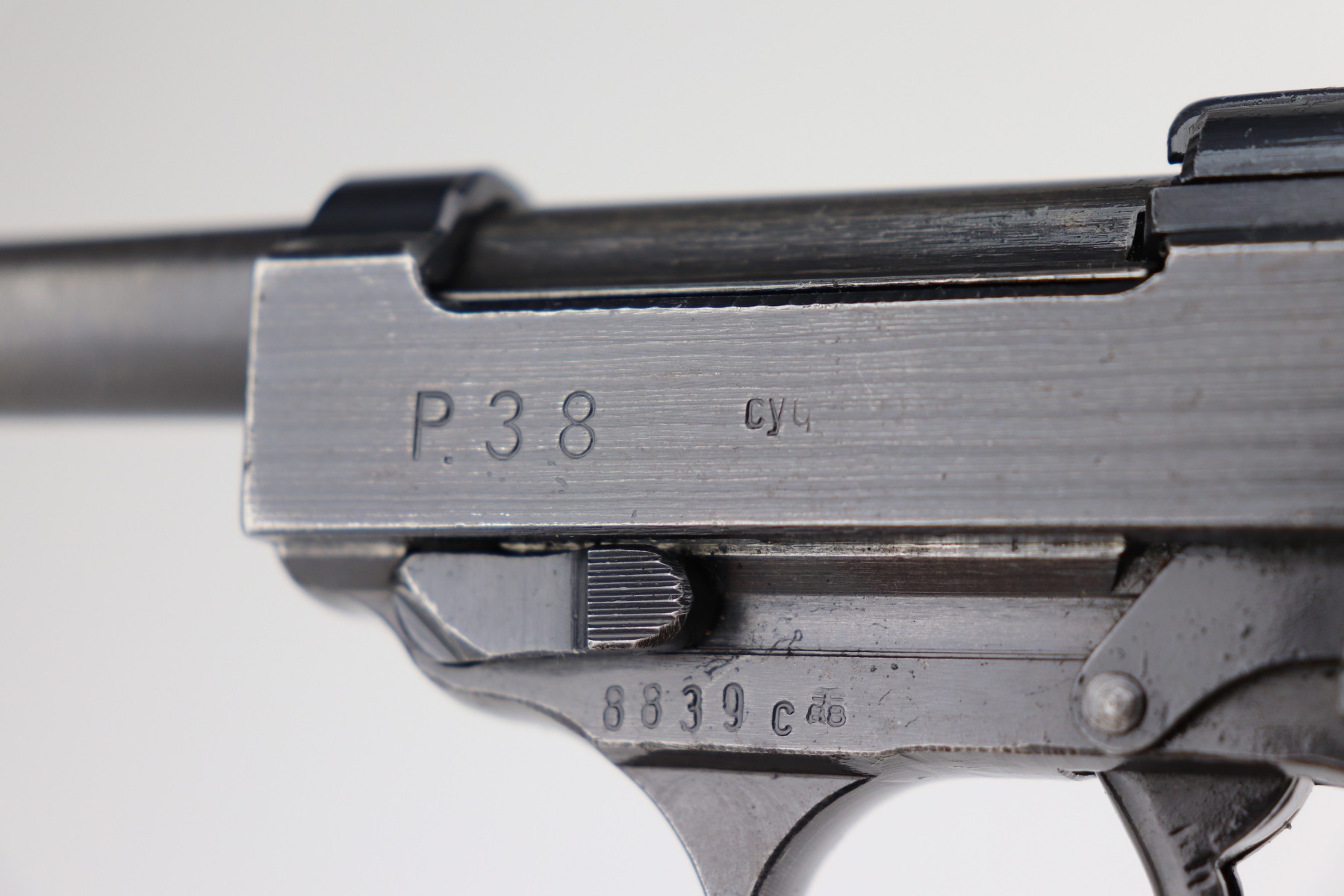 3/15/21 – This is a very nice example of a Spreewerk P.38 rig issued to the Nazi military in June of 1943. It is all matching and has the proper “Eagle 88” military proofs. The rig comes with a nice post-war P.38 holster and two wartime magazines. It has retained about 90% of its original finish. It has excellent profile views, but there is thinning and spotty oxidation on the front strap. Comes with excellent grips. The bore is mint. De-cocker is functional.