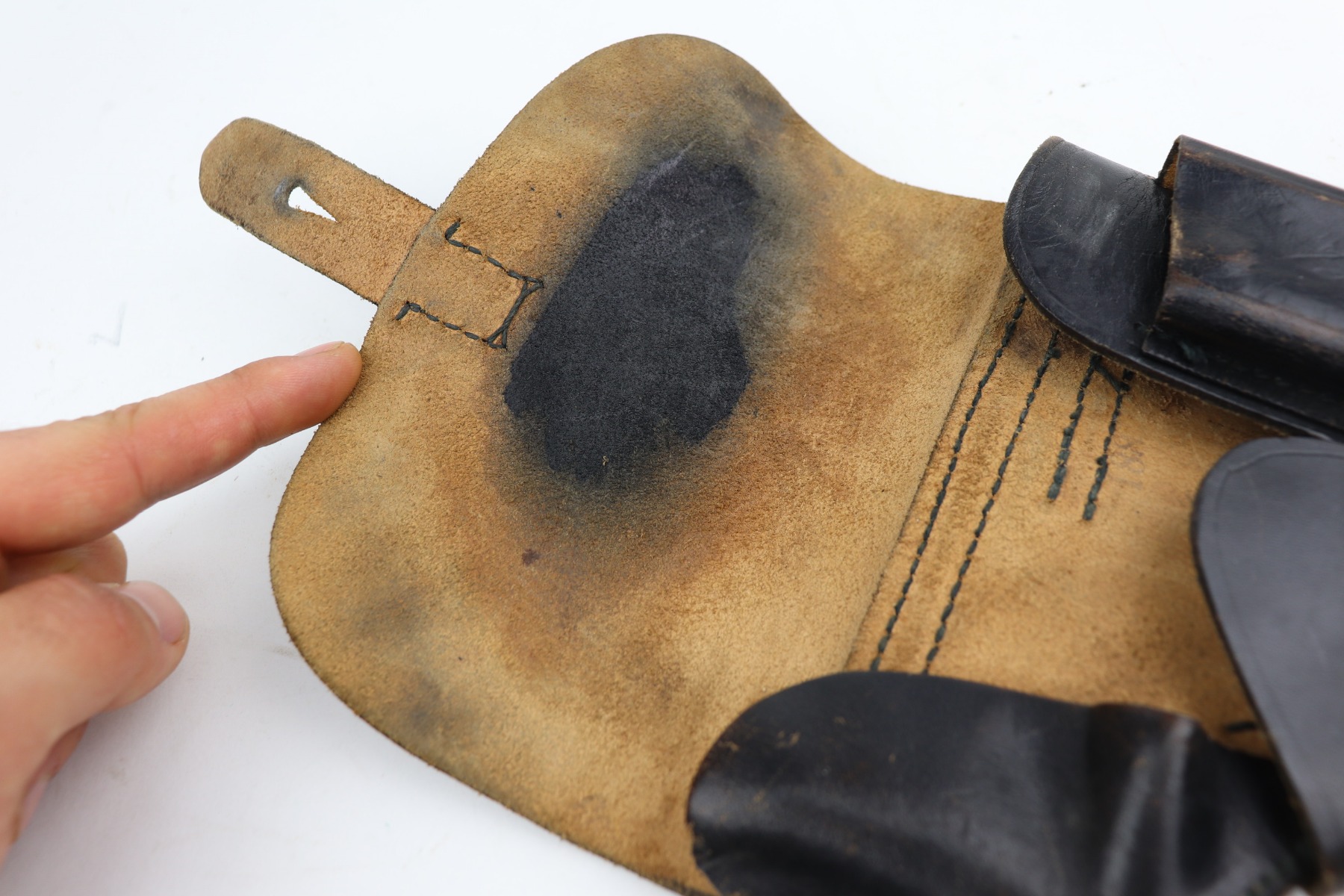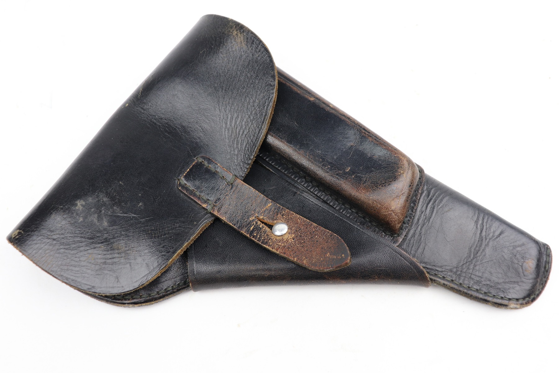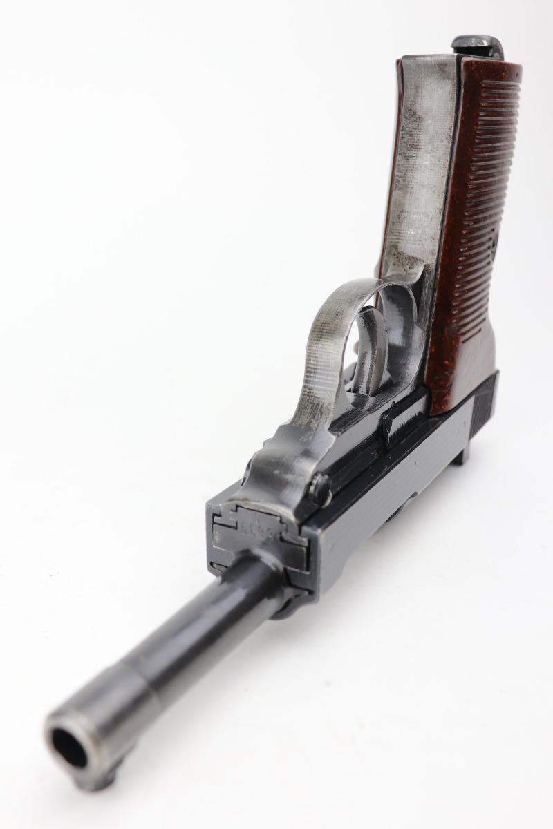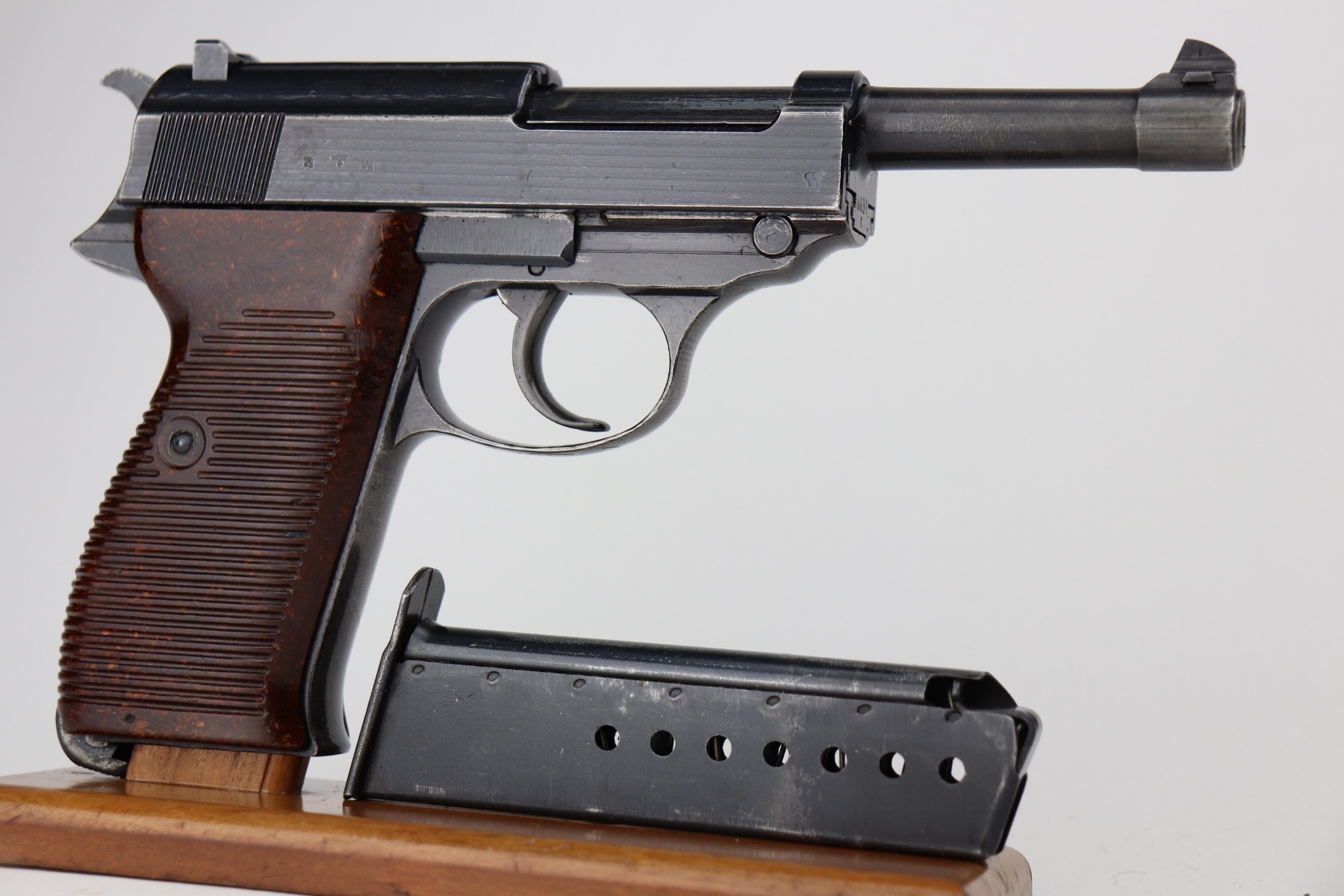3/15/21 – This is a very nice example of a Spreewerk P.38 rig issued to the Nazi military in June of 1943. It is all matching and has the proper “Eagle 88” military proofs. The rig comes with a nice post-war P.38 holster and two wartime magazines. It has retained about 90% of its original finish. It has excellent profile views, but there is thinning and spotty oxidation on the front strap. Comes with excellent grips. The bore is mint. De-cocker is functional.