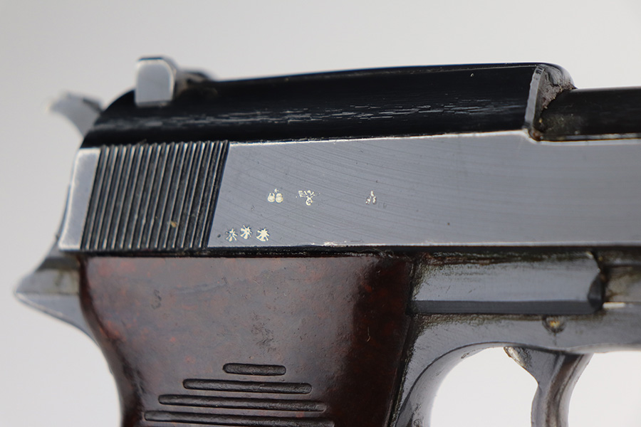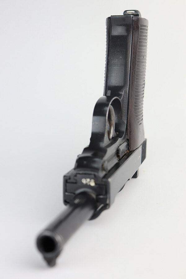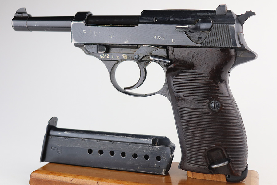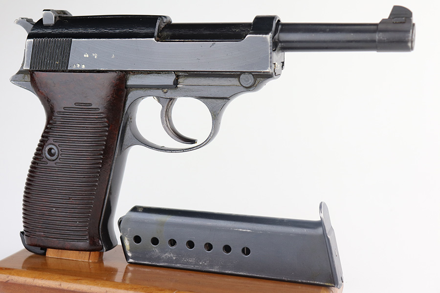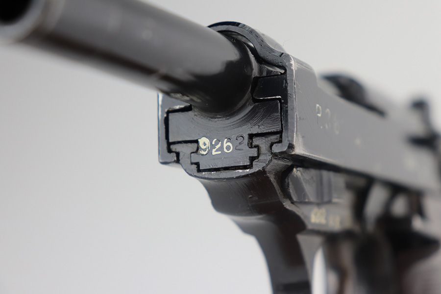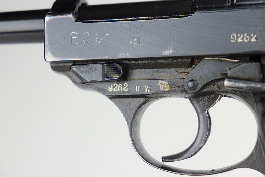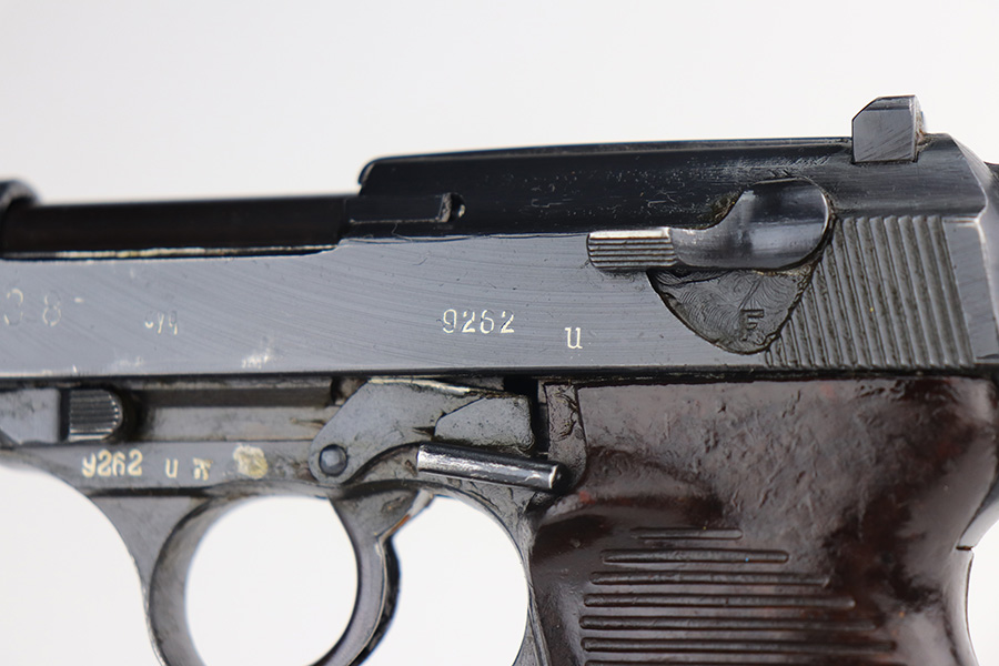 6/2/21 – This is an excellent example of a P.38 issued to the Nazi military in September of 1944. It is all matching and has the proper “Eagle 88” military proofs. One proof on the left side of the frame looks like it was peened. There are three asterisk proofs on the right side of the slide, indicating the gun failed inspection and was sent back to the factory for repairs. The barrel was replaced – it has a “Crown N” proof, and the barrel looks like it was numbered to match. Because of the replaced barrel and peened proof, we believe this is a police rework. It has retained about 95% of its bluing. There is minor wear on the front edges of the slide and around the muzzle. A few small spots of wear on the barrel and a few small dings on the front strap. Comes with excellent grips and a scarce “U’ marked magazine. De-cocker is functional. Minty bore. There is thick grease in all of the internals – could benefit from a good cleaning.