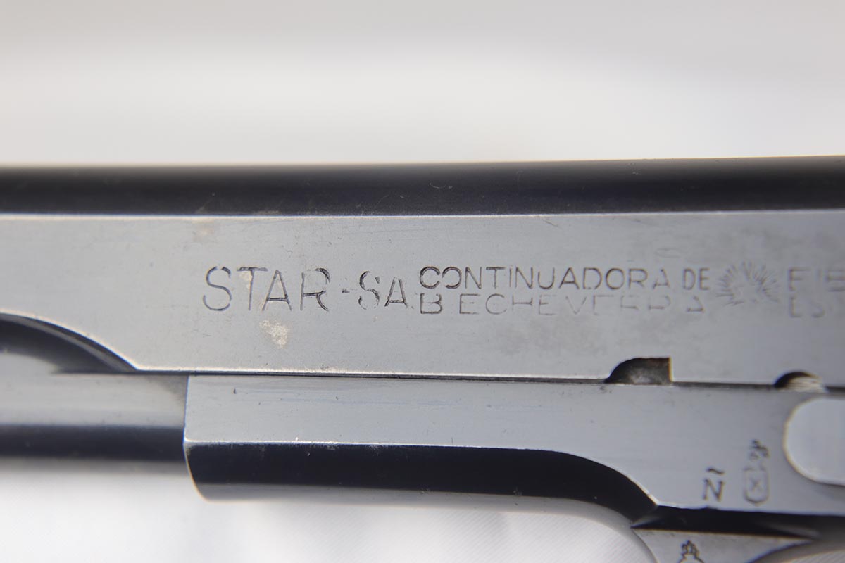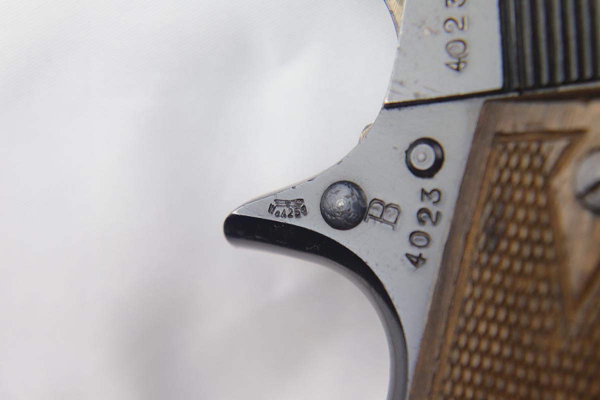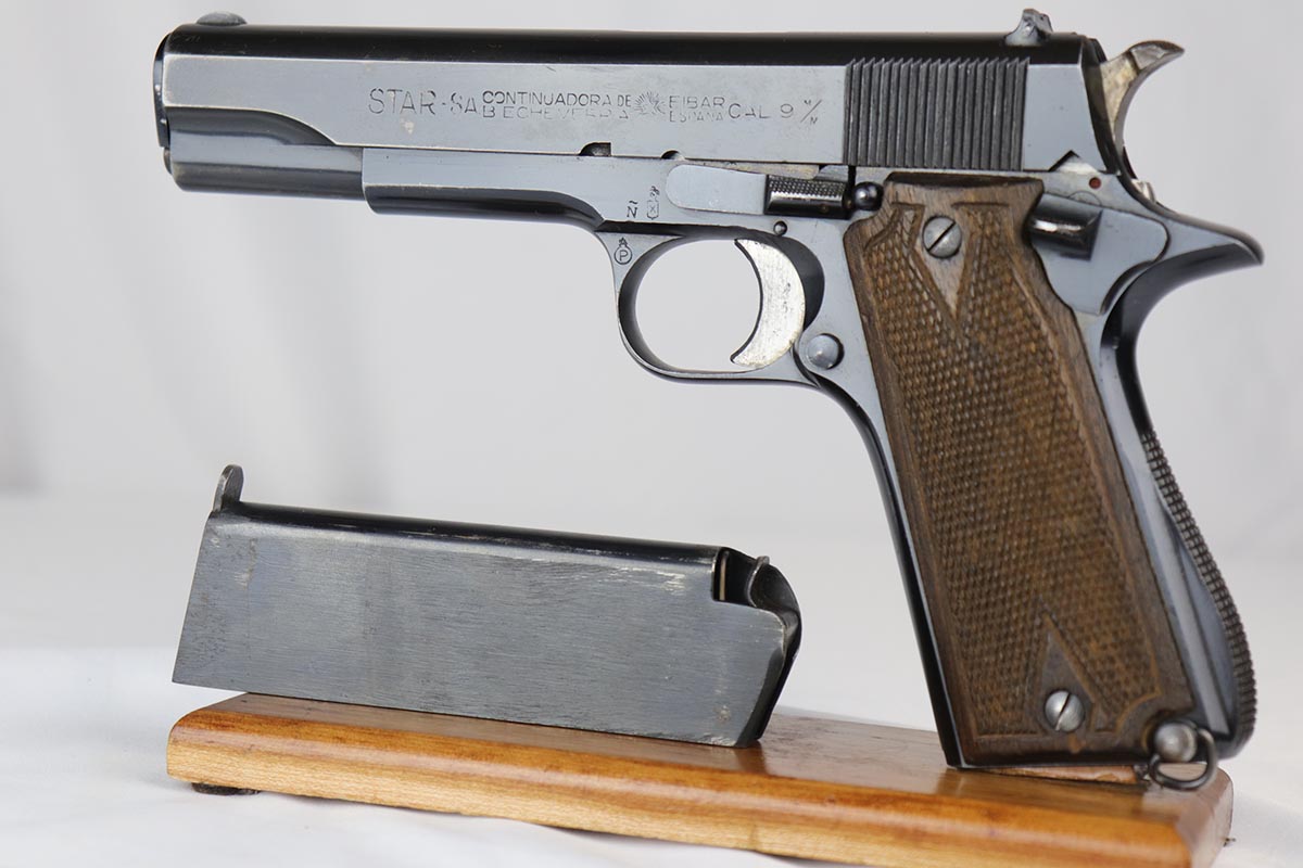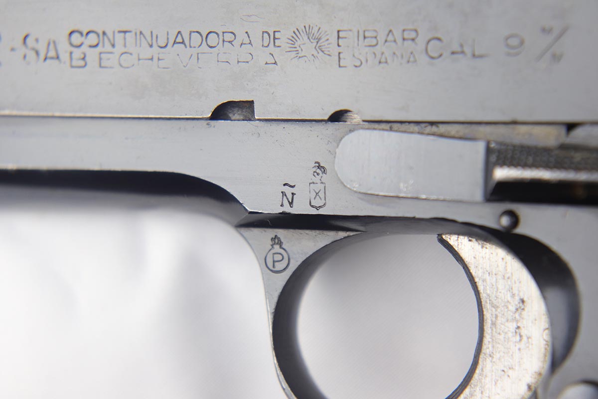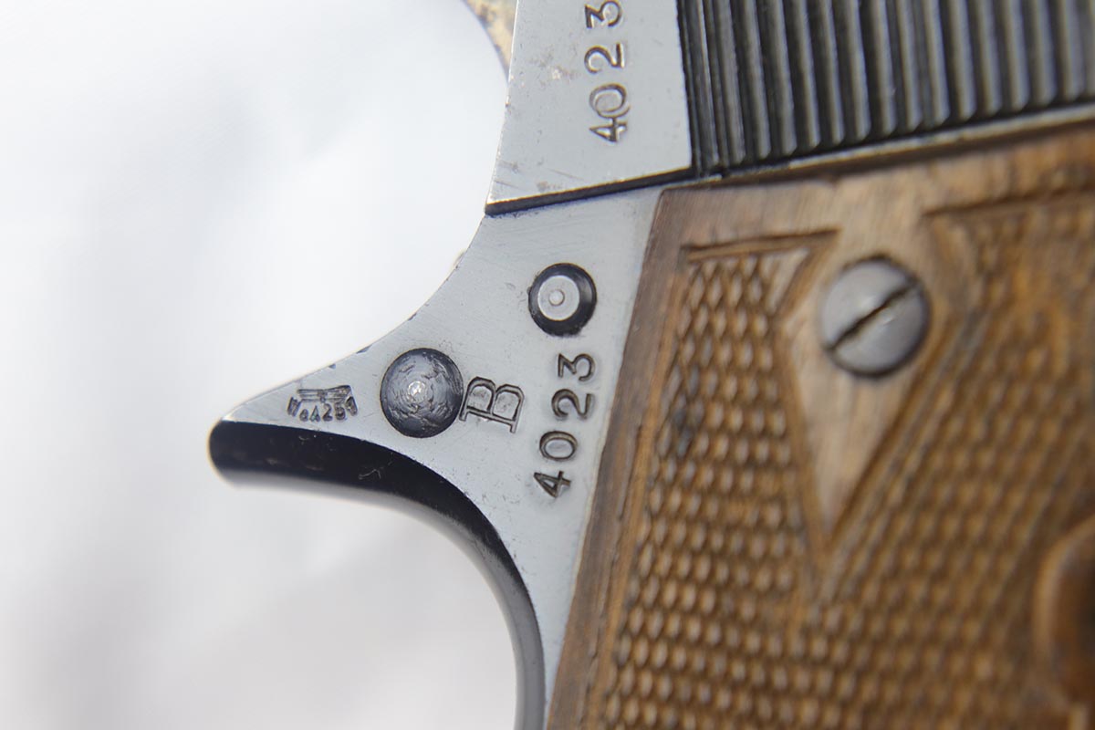 9/25/18 – This is a very nice, all original example of a Star Model B with Nazi proof on the right side tang. It is all original and correct with about 94% high-polish blue remaining. There is some high edge wear on both sides of the slide, as well as a few small areas of patina or thinning on the top and bottom of the slide. The firm of Star Bonifacio Echeverria SA, located in Eibar, Spain, originated in 1905 but the factory was destroyed during the Spanish Civil War (1936-1939). It was rebuilt adjacent to the original site, and during WW2 it supplied about 25,000 pistols to the German Army in France. There are two serial ranges for these contracts, with this pistol falling correctly into the second batch and given an E/WaA251 acceptance stamp. Only 10,000 were produced with this proof. The N with tilde denotes 1943 manufacture. The grips and magazine are all original and in very good to excellent condition. Excellent bore.