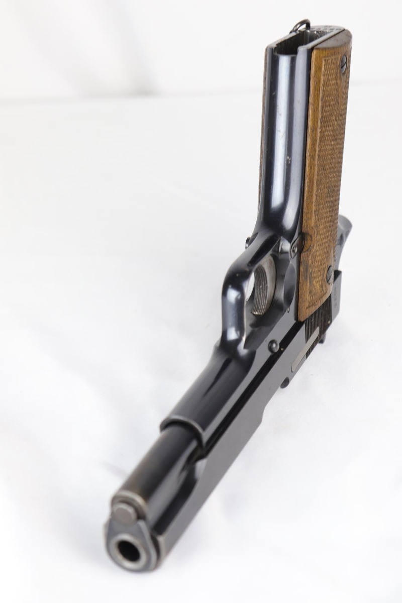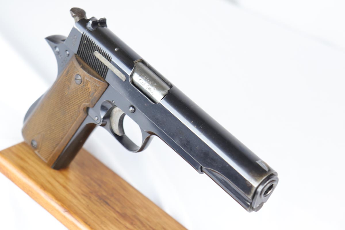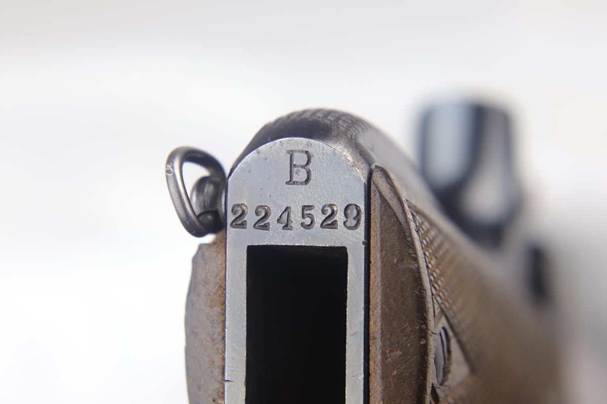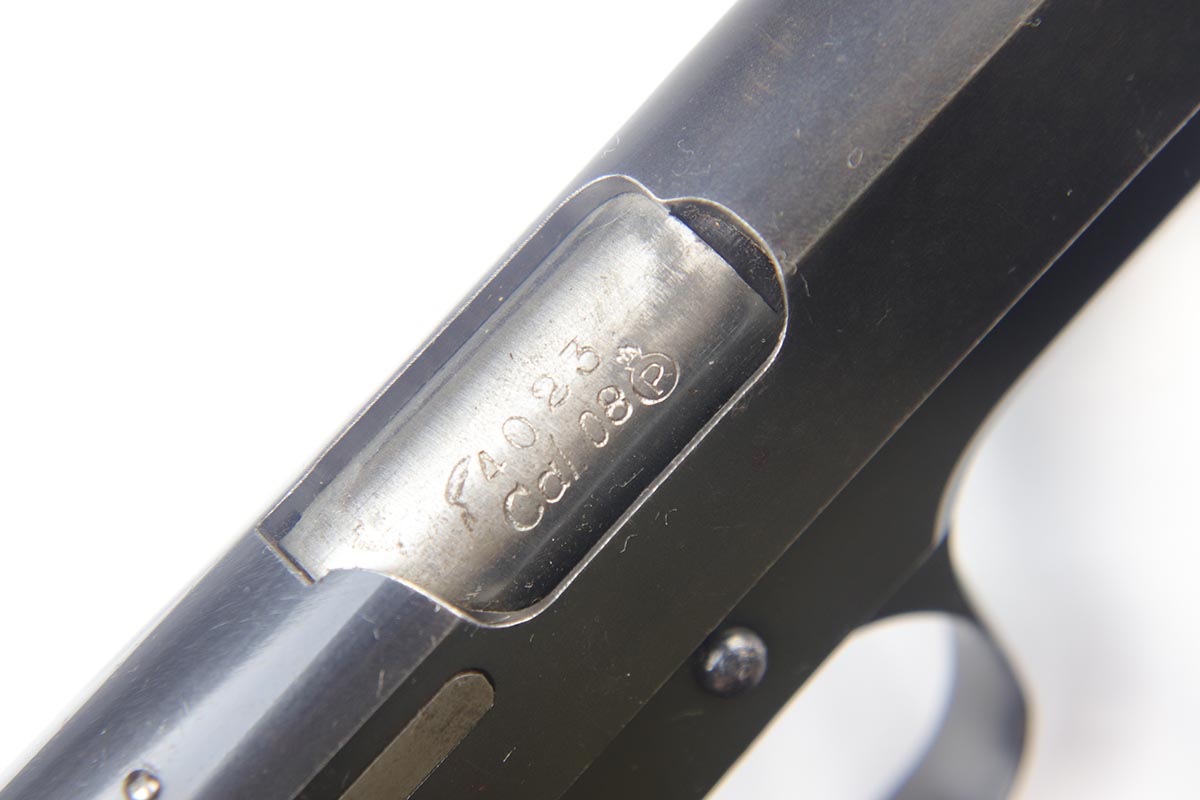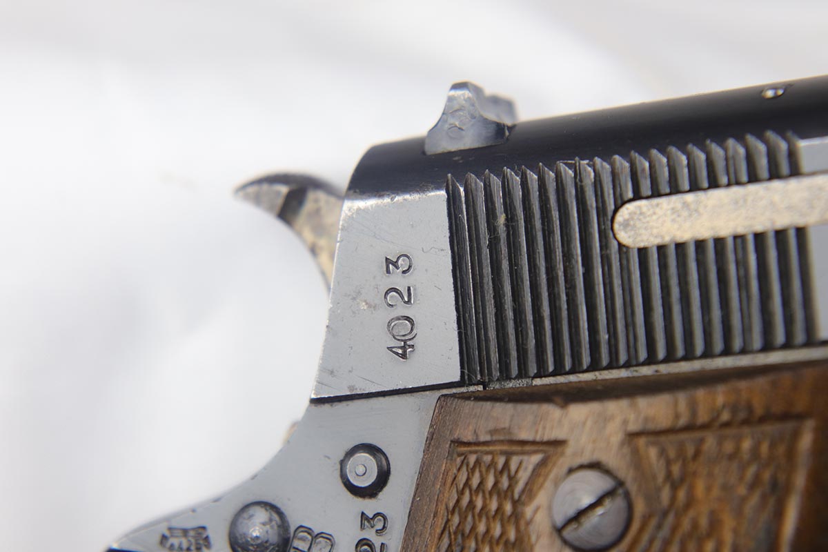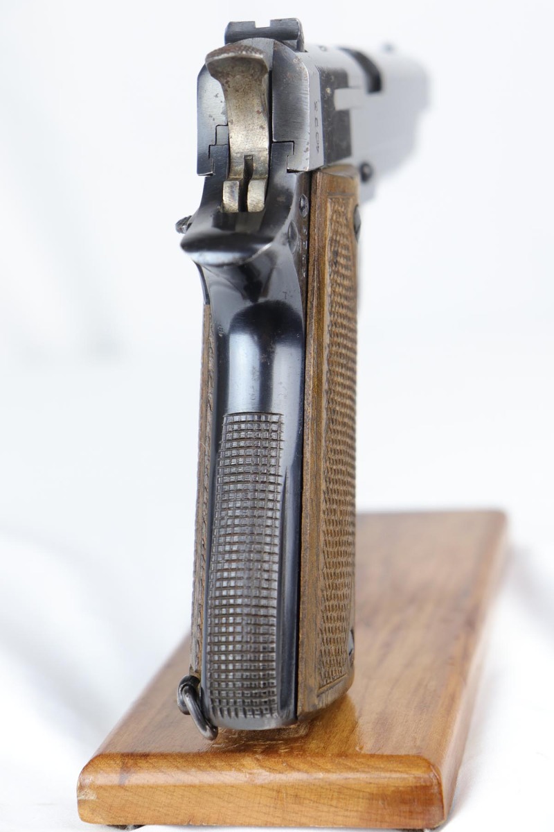 9/25/18 – This is a very nice, all original example of a Star Model B with Nazi proof on the right side tang. It is all original and correct with about 94% high-polish blue remaining. There is some high edge wear on both sides of the slide, as well as a few small areas of patina or thinning on the top and bottom of the slide. The firm of Star Bonifacio Echeverria SA, located in Eibar, Spain, originated in 1905 but the factory was destroyed during the Spanish Civil War (1936-1939). It was rebuilt adjacent to the original site, and during WW2 it supplied about 25,000 pistols to the German Army in France. There are two serial ranges for these contracts, with this pistol falling correctly into the second batch and given an E/WaA251 acceptance stamp. Only 10,000 were produced with this proof. The N with tilde denotes 1943 manufacture. The grips and magazine are all original and in very good to excellent condition. Excellent bore.
