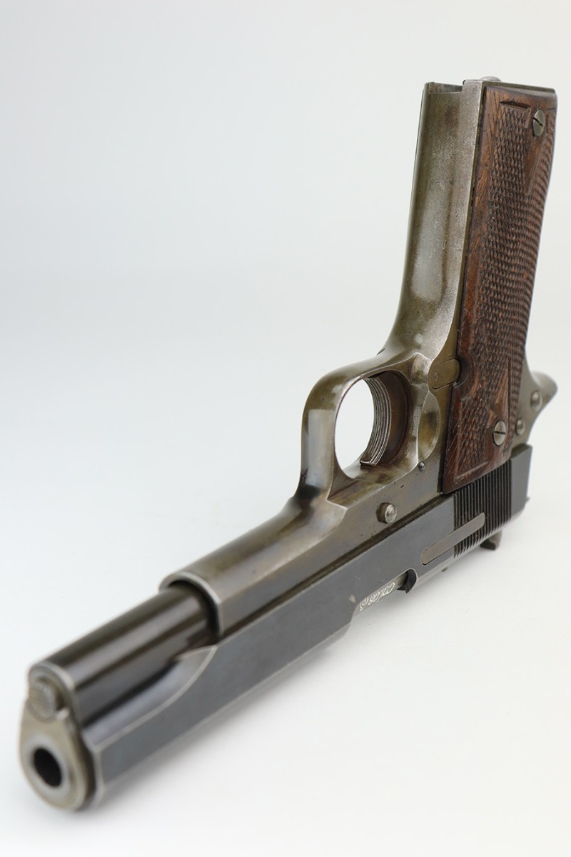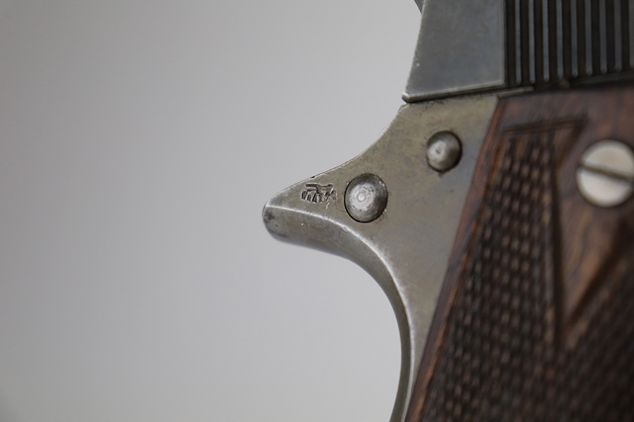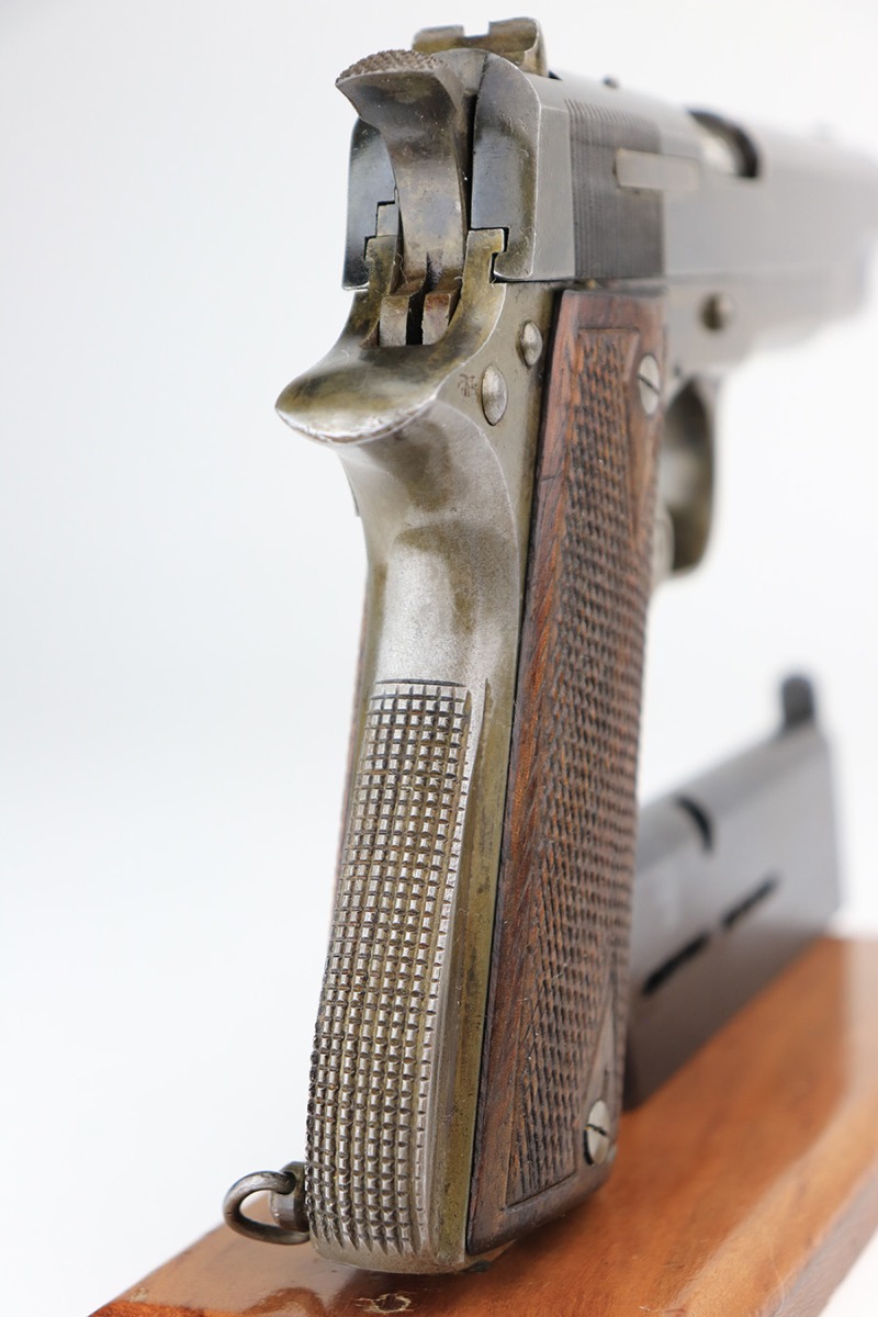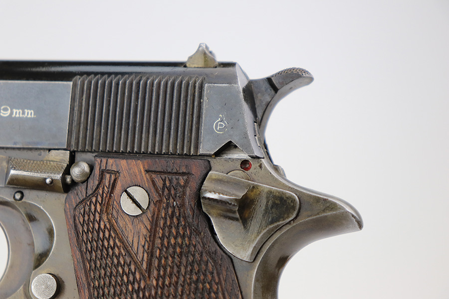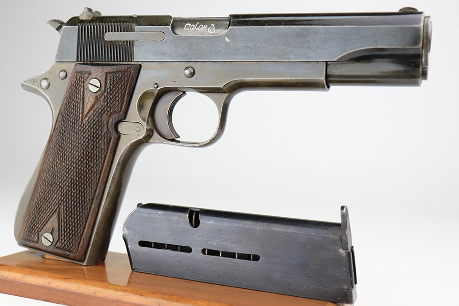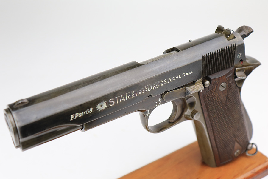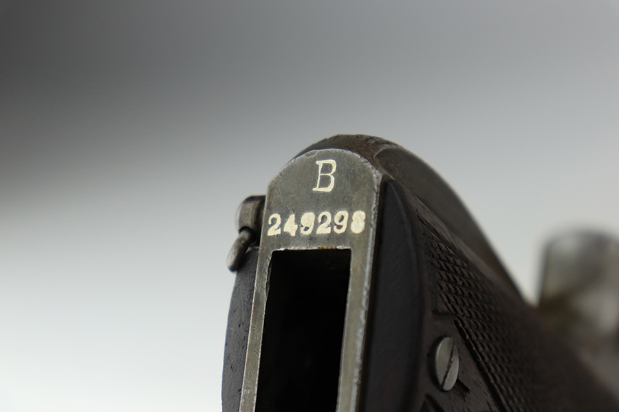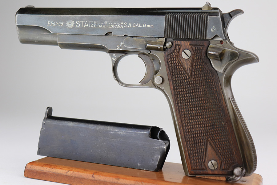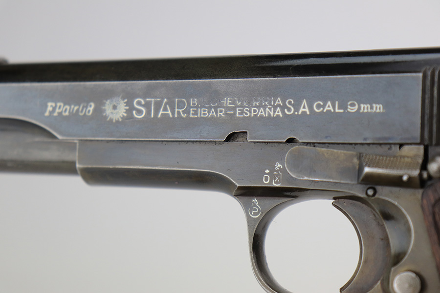 4/5/22 – This is a Spanish Star Model B issued to the Nazi military in 1944. It is all matching, has the proper Spanish proofs, and has a waffen military acceptance proof on the right side of the tang. The gun has retained roughly half its finish. We believe that most of the gun was touched up with cold or hot blue. As a result, there is noticeable splotchy discoloration throughout. Comes with slightly worn wood grips and a period-correct magazine. The bore has decent rifling, but there are tiny pits and spotty oxidation in the grooves.