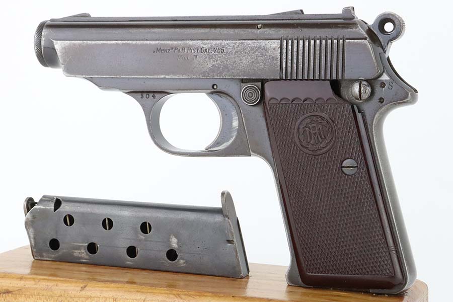 9/25/18 – This is a very nice, all original example of a Star Model B with Nazi proof on the right side tang. It is all original and correct with about 94% high-polish blue remaining. There is some high edge wear on both sides of the slide, as well as a few small areas of patina or thinning on the top and bottom of the slide. The firm of Star Bonifacio Echeverria SA, located in Eibar, Spain, originated in 1905 but the factory was destroyed during the Spanish Civil War (1936-1939). It was rebuilt adjacent to the original site, and during WW2 it supplied about 25,000 pistols to the German Army in France. There are two serial ranges for these contracts, with this pistol falling correctly into the second batch and given an E/WaA251 acceptance stamp. Only 10,000 were produced with this proof. The N with tilde denotes 1943 manufacture. The grips and magazine are all original and in very good to excellent condition. Excellent bore.