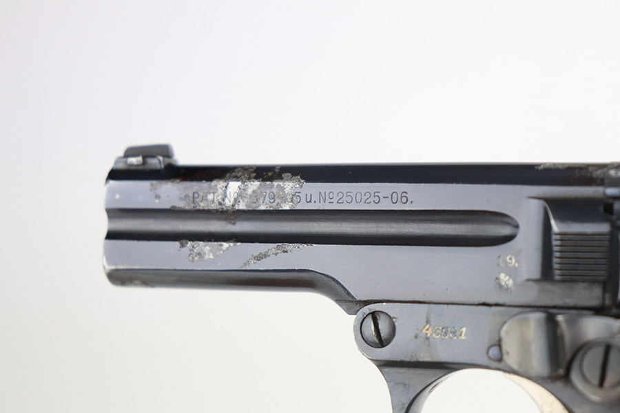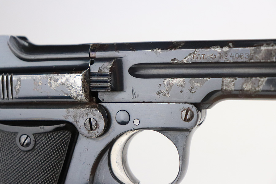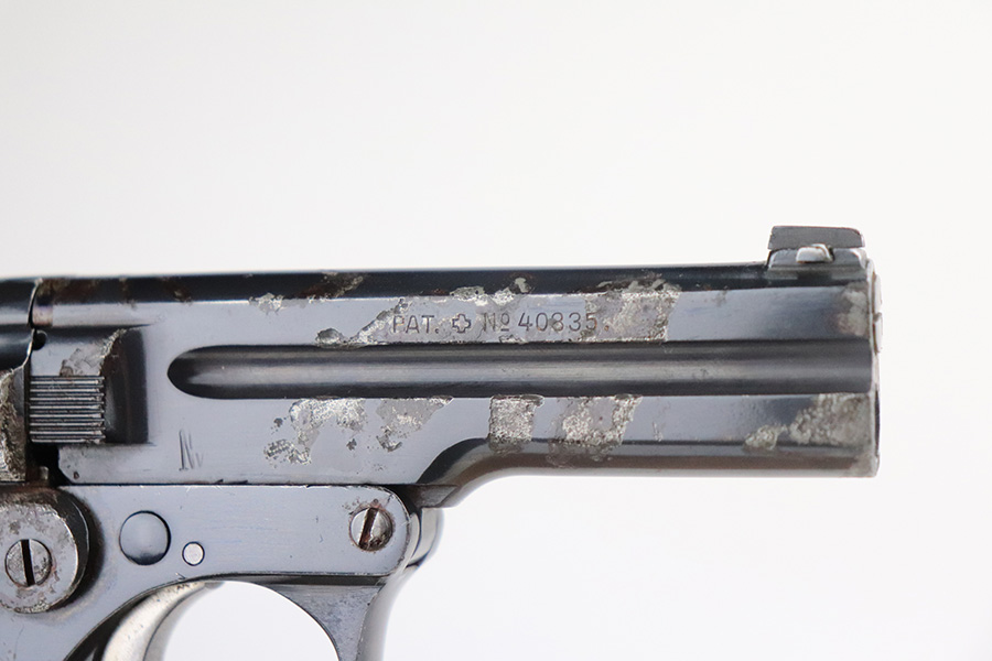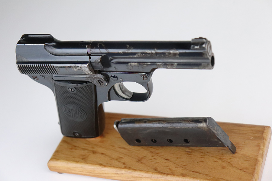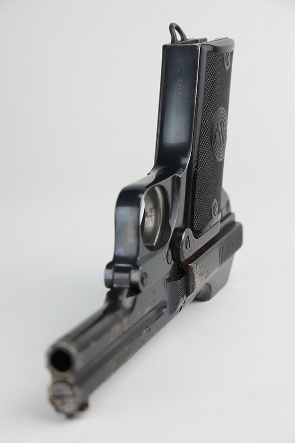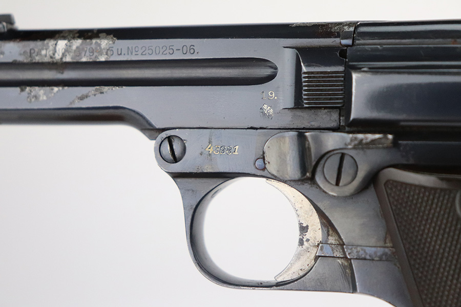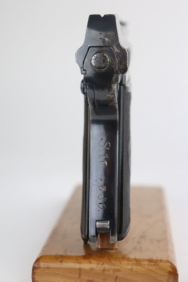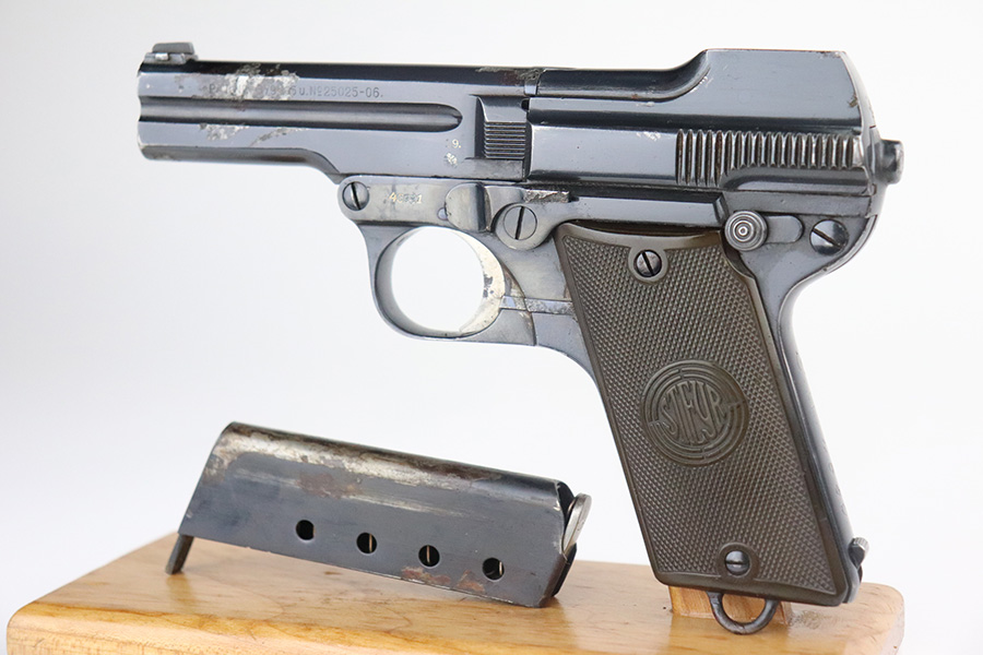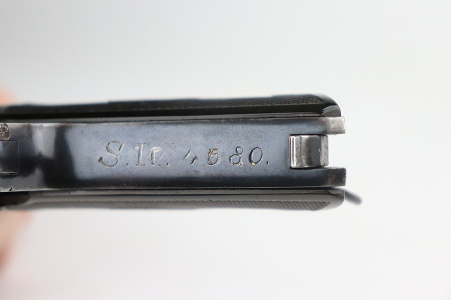 8/3/21 – This is a nice example of a Steyr Model 1908/34 that is listed by serial number on page 247 of Jan Still’s Axis Pistols. An excerpt that page: “In 1934, the Austrian Police had a number of 1908 Steyr pistols reworked for police issue. Some of these have ‘S.W.’ grip strap markings indicating issue to the Austrian State Security Service. After the 1938 Anschluss, Austria became part of Greater Germany and its police force was integrated into the Nazi National Police System”. This one is all matching and has an “S.W. 4580” marking on the back strap. It comes with a matching unit-numbered magazine. It has retained roughly 70% of its finish. There is heavy pitting on the whole right side of the gun and on the left side of the barrel. Comes with nice bakelite grips. The bore is nice with good rifling.