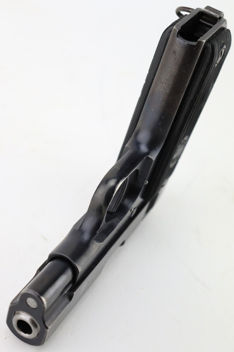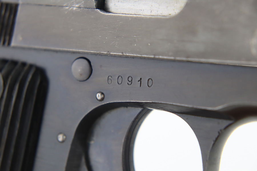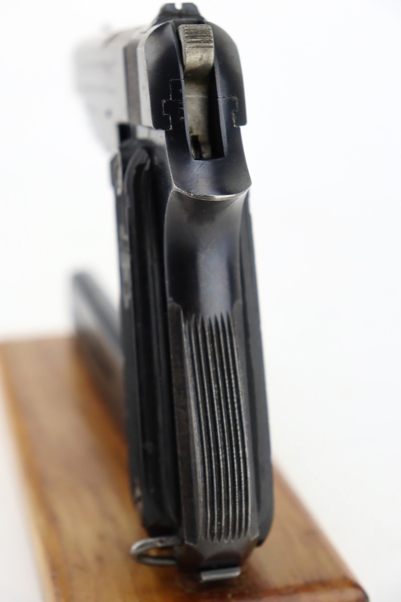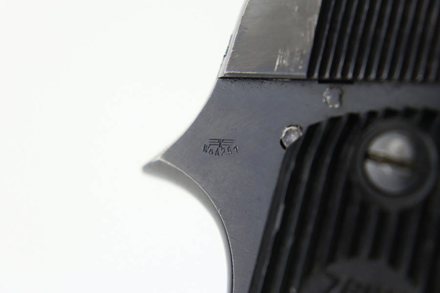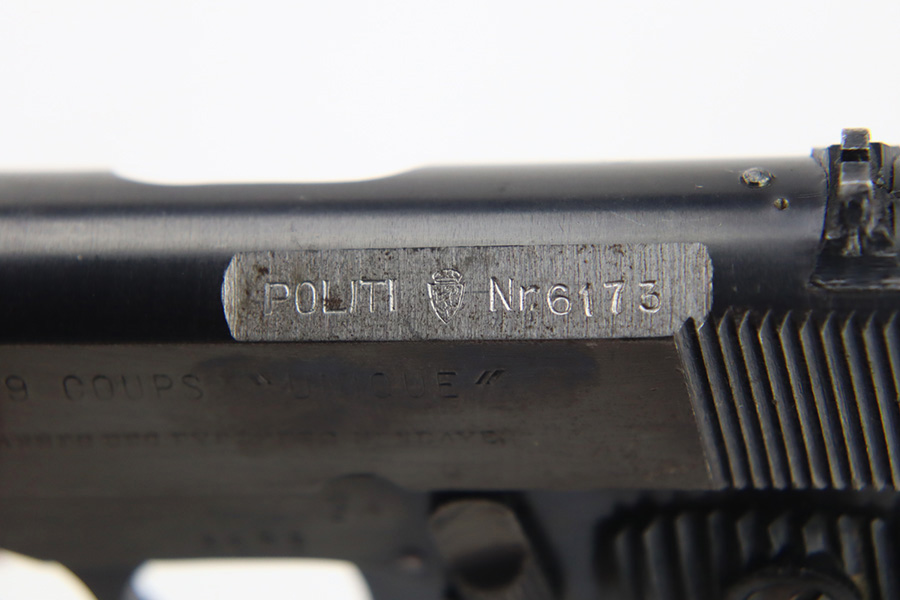 4/5/24 – This is a very nice example of a Unique Kriegsmodell issued to the Nazi military during WW2. It is all matching with the proper “Waffen 251” military acceptance proof on the tang. The slide is milled with a “Politi Nr. 6173” marking, indicating it went to the Norwegian Police after the war. It has retained about 92% of its original finish. There is general high edge wear, wear around the muzzle, and a few small dots of discoloration on the right side of the slide. Fitted with period-correct black bakelite grips and comes with one proper magazine. Minty bore.