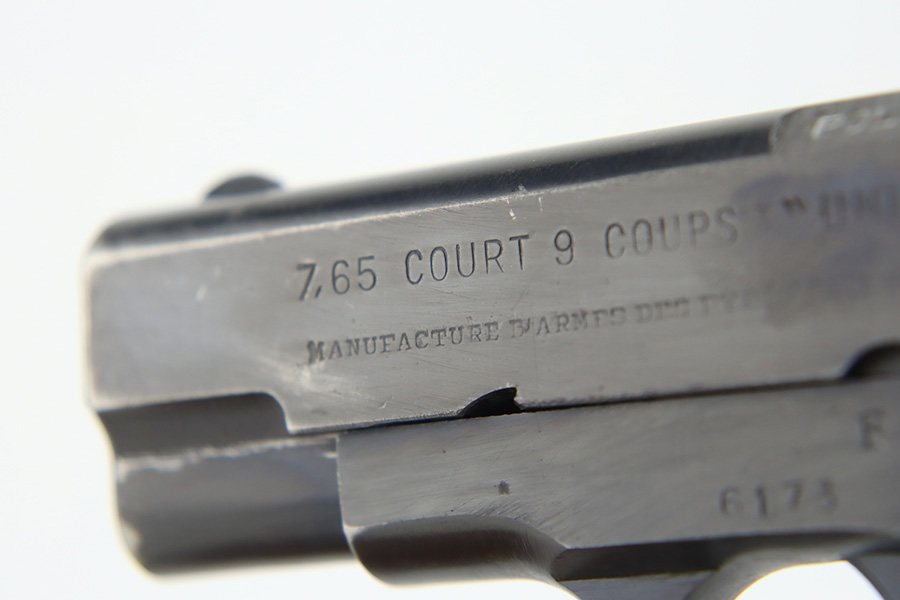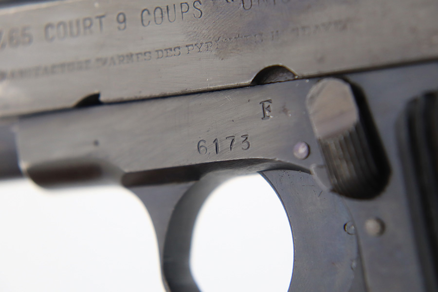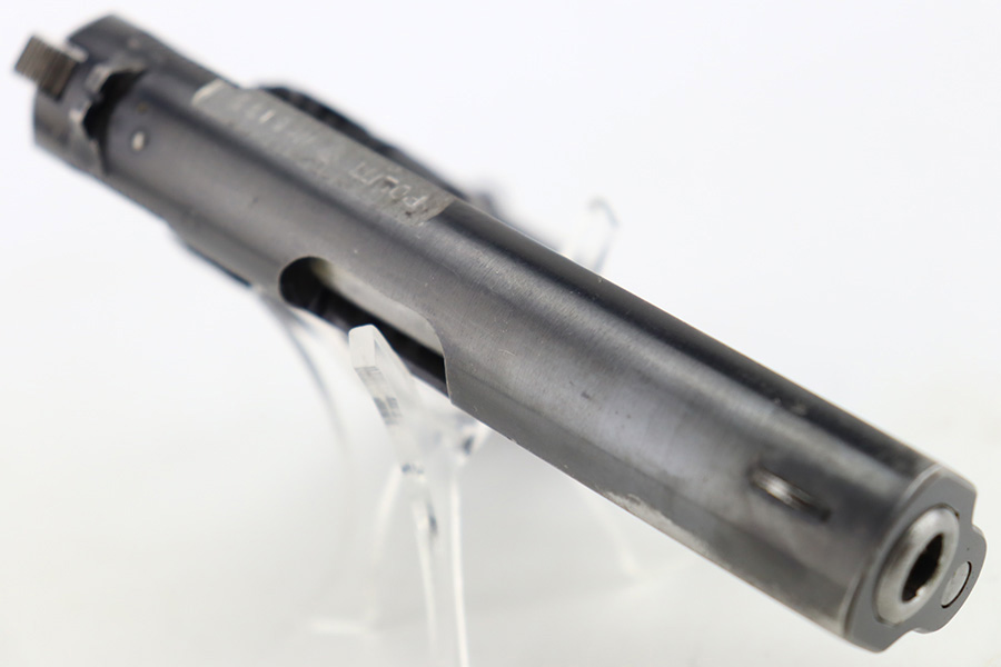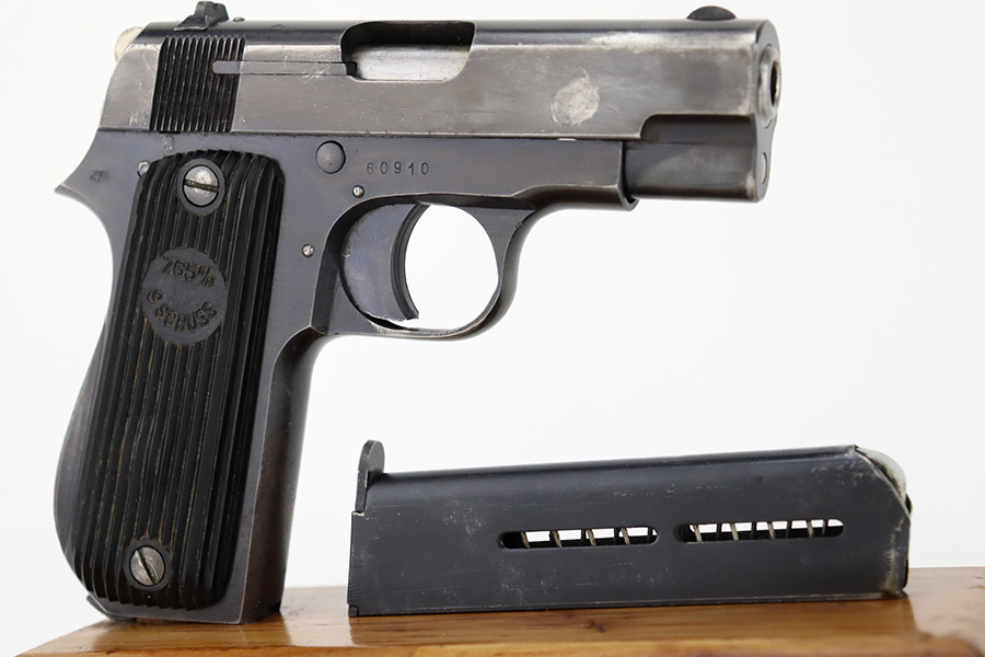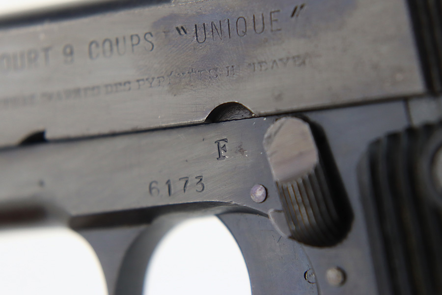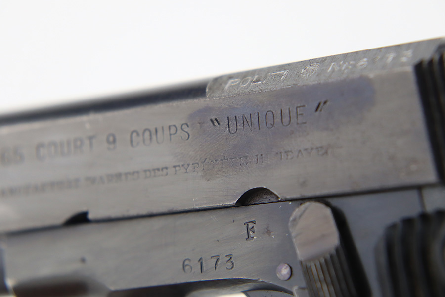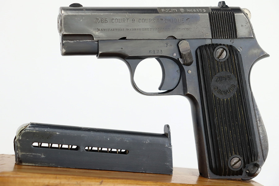 4/5/24 – This is a very nice example of a Unique Kriegsmodell issued to the Nazi military during WW2. It is all matching with the proper “Waffen 251” military acceptance proof on the tang. The slide is milled with a “Politi Nr. 6173” marking, indicating it went to the Norwegian Police after the war. It has retained about 92% of its original finish. There is general high edge wear, wear around the muzzle, and a few small dots of discoloration on the right side of the slide. Fitted with period-correct black bakelite grips and comes with one proper magazine. Minty bore.