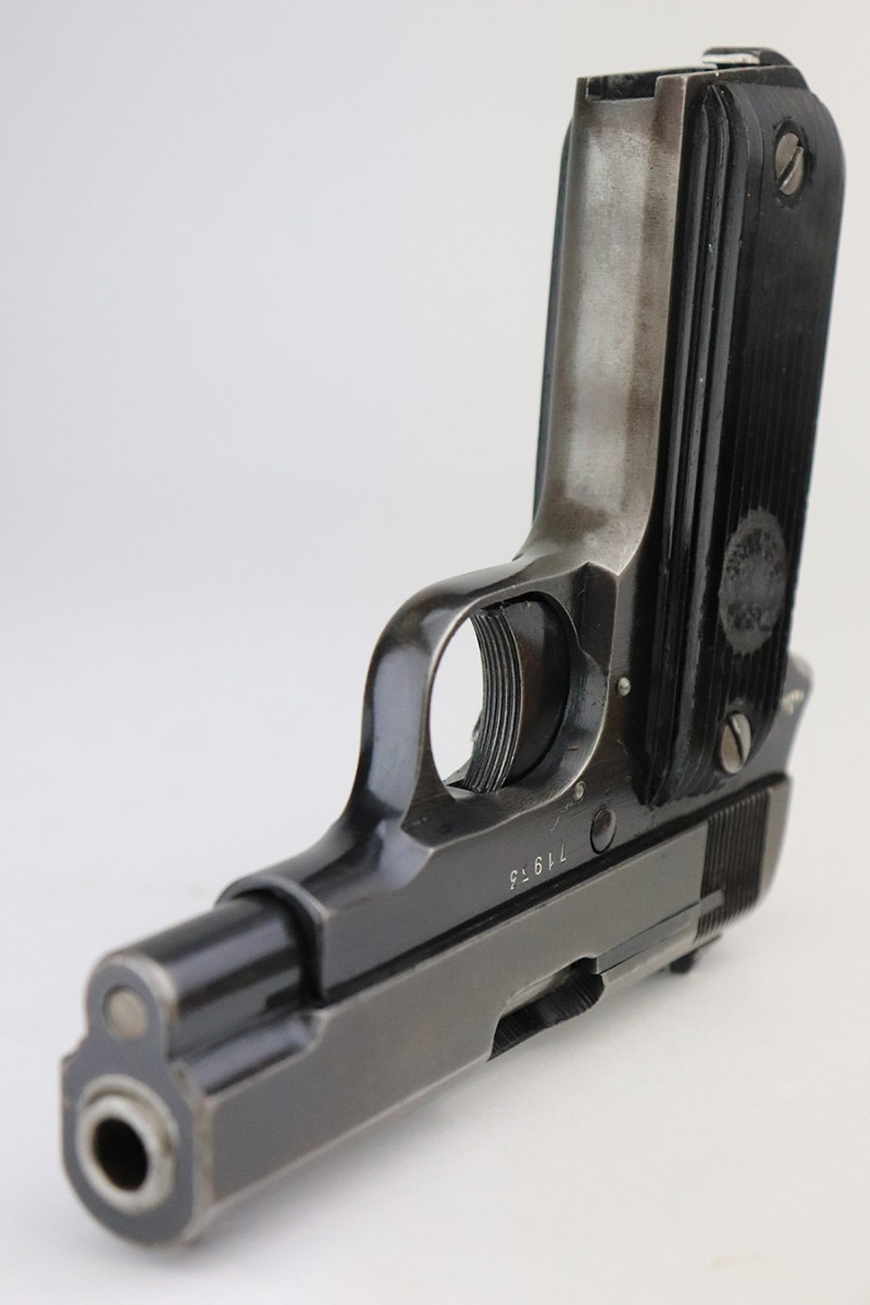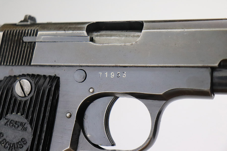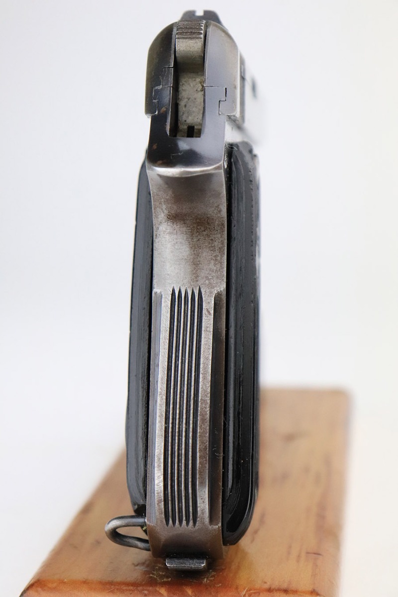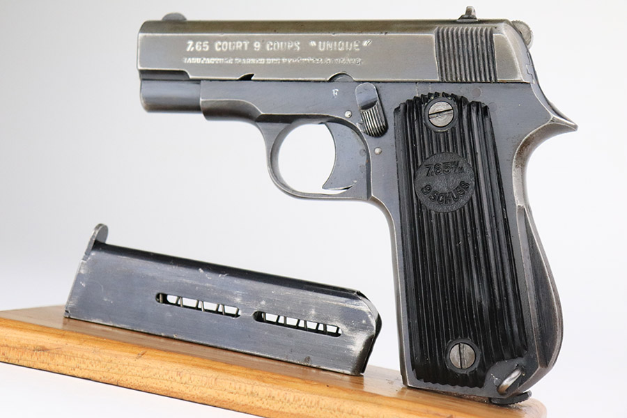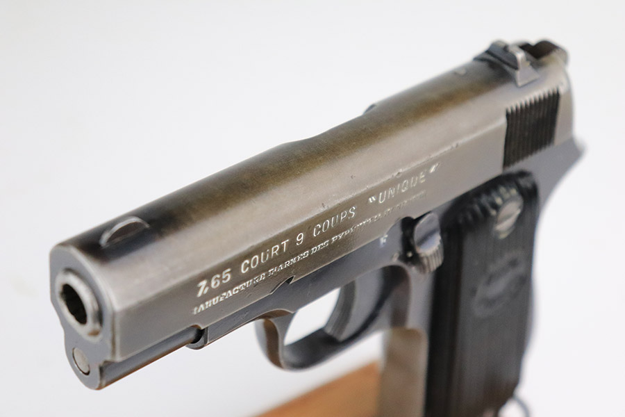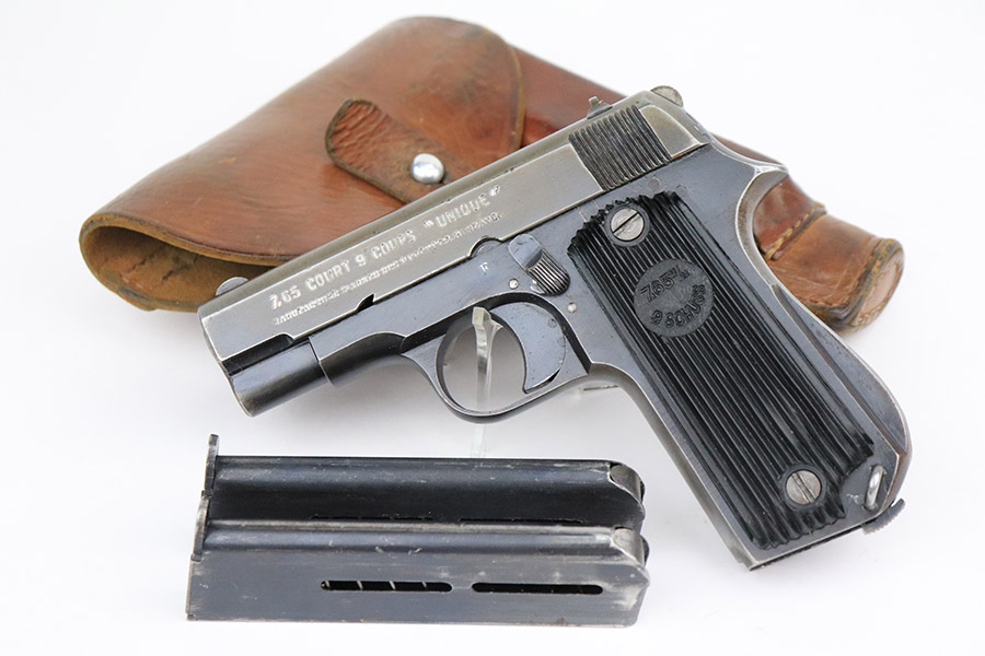 10/31/22 – This is a nice example of a French Unique Kriegsmodell issued to the Nazi military during WW2. It is all matching and has the proper “Waffen D20” Nazi military acceptance proof on the right side of the tang. It comes as a rig with two proper magazines and a very nice waffen-proofed tan leather holster. The gun itself has retained roughly 60% of its wartime finish. The most obvious finish loss is on the whole slide and on both grip straps. Some very light brown patina in the same areas. Comes with very nice period-correct black bakelite grips – one small textured “bubble” on the left side. Mint bore.