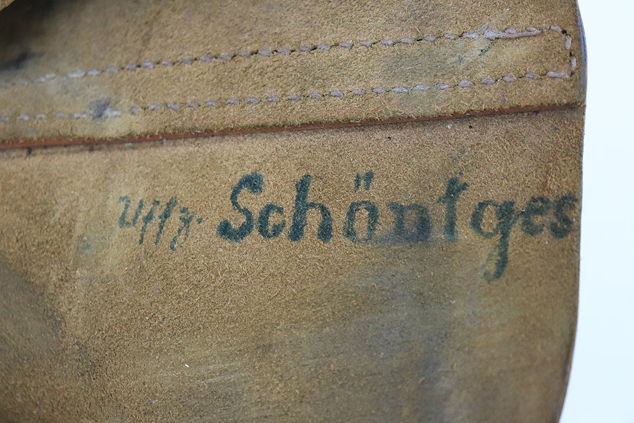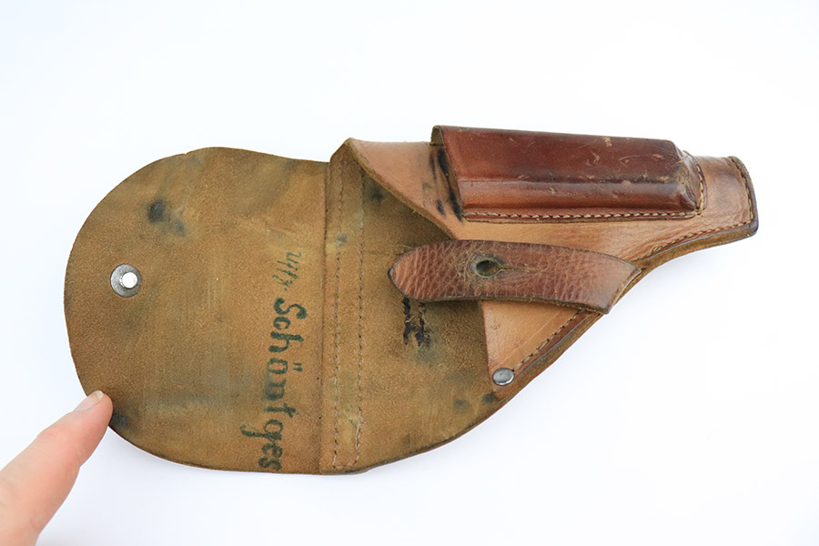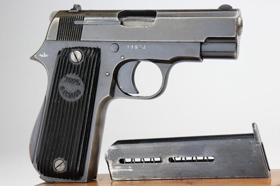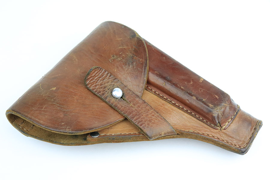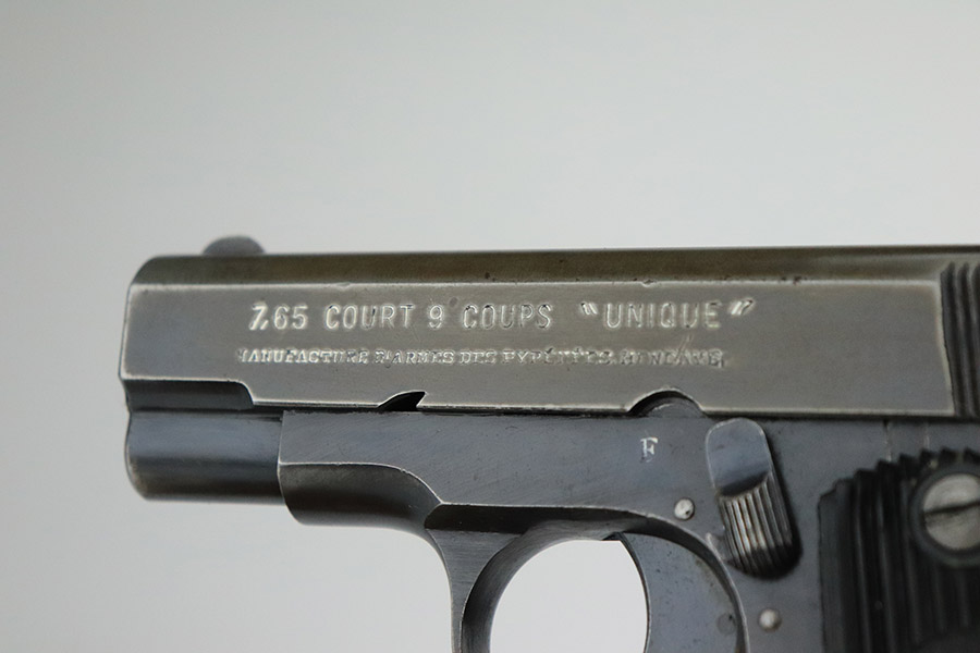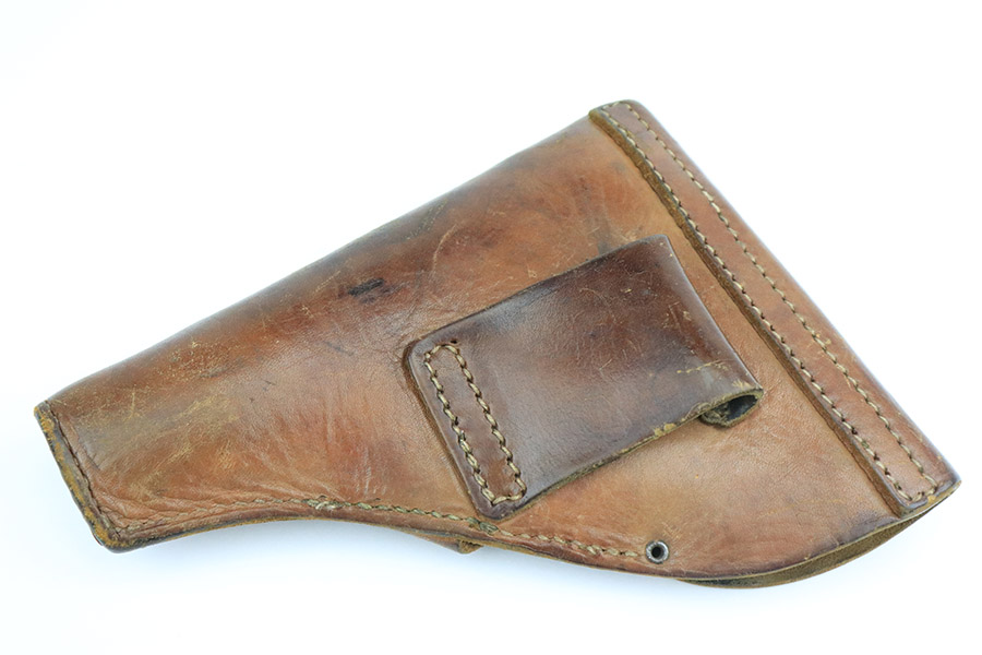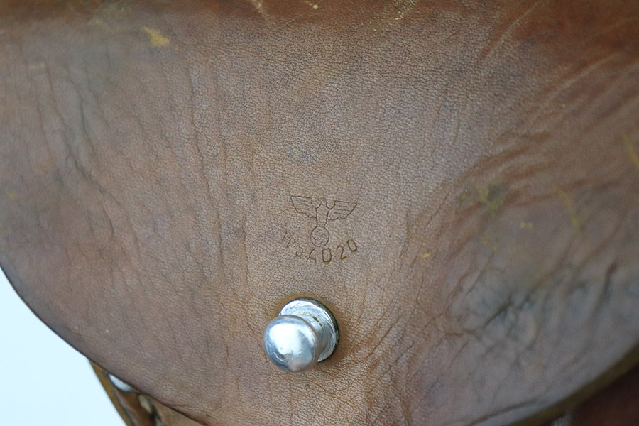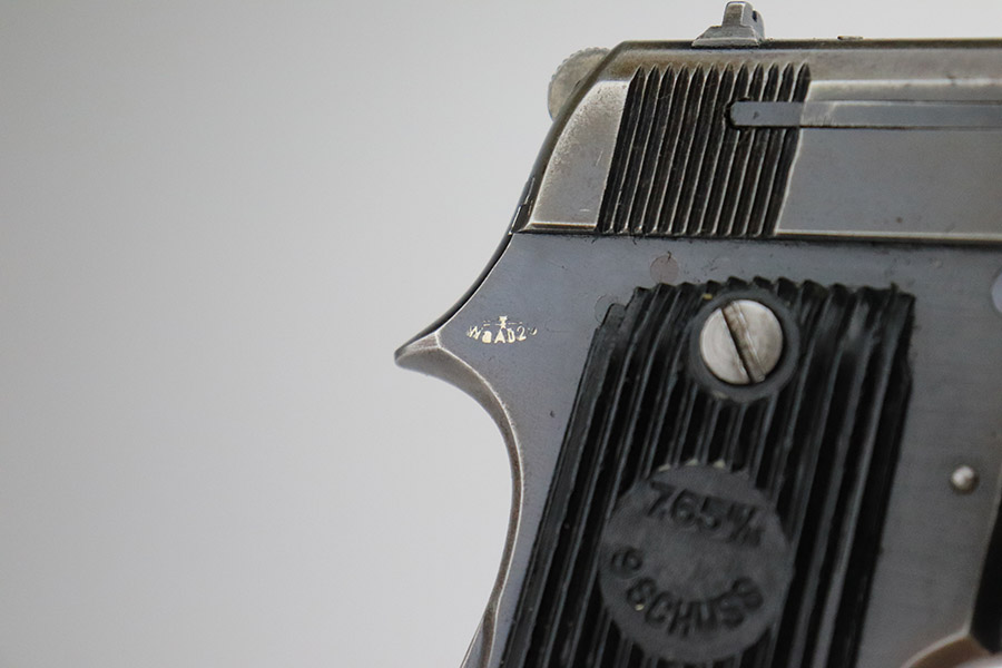 10/31/22 – This is a nice example of a French Unique Kriegsmodell issued to the Nazi military during WW2. It is all matching and has the proper “Waffen D20” Nazi military acceptance proof on the right side of the tang. It comes as a rig with two proper magazines and a very nice waffen-proofed tan leather holster. The gun itself has retained roughly 60% of its wartime finish. The most obvious finish loss is on the whole slide and on both grip straps. Some very light brown patina in the same areas. Comes with very nice period-correct black bakelite grips – one small textured “bubble” on the left side. Mint bore.