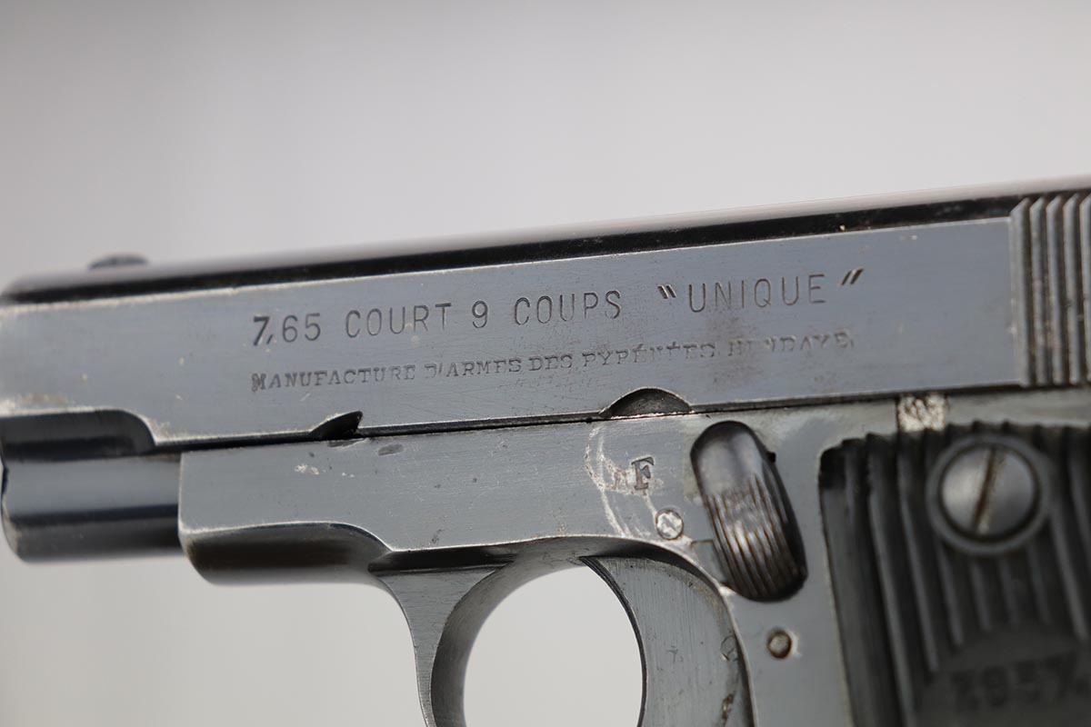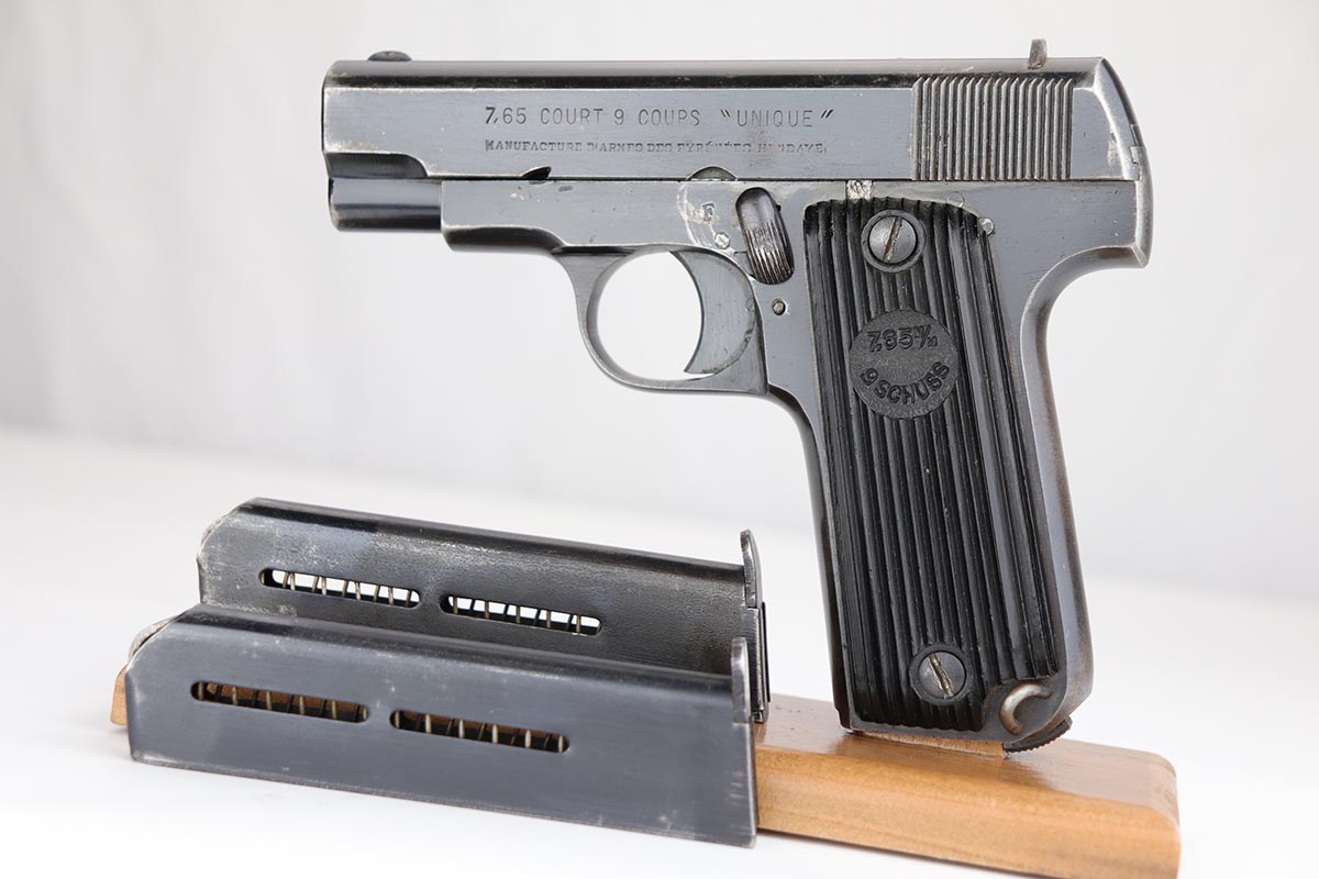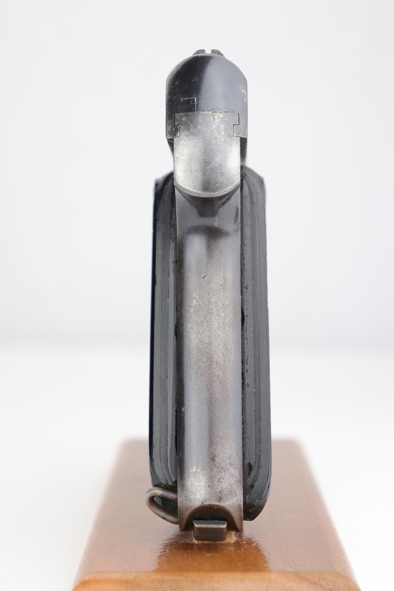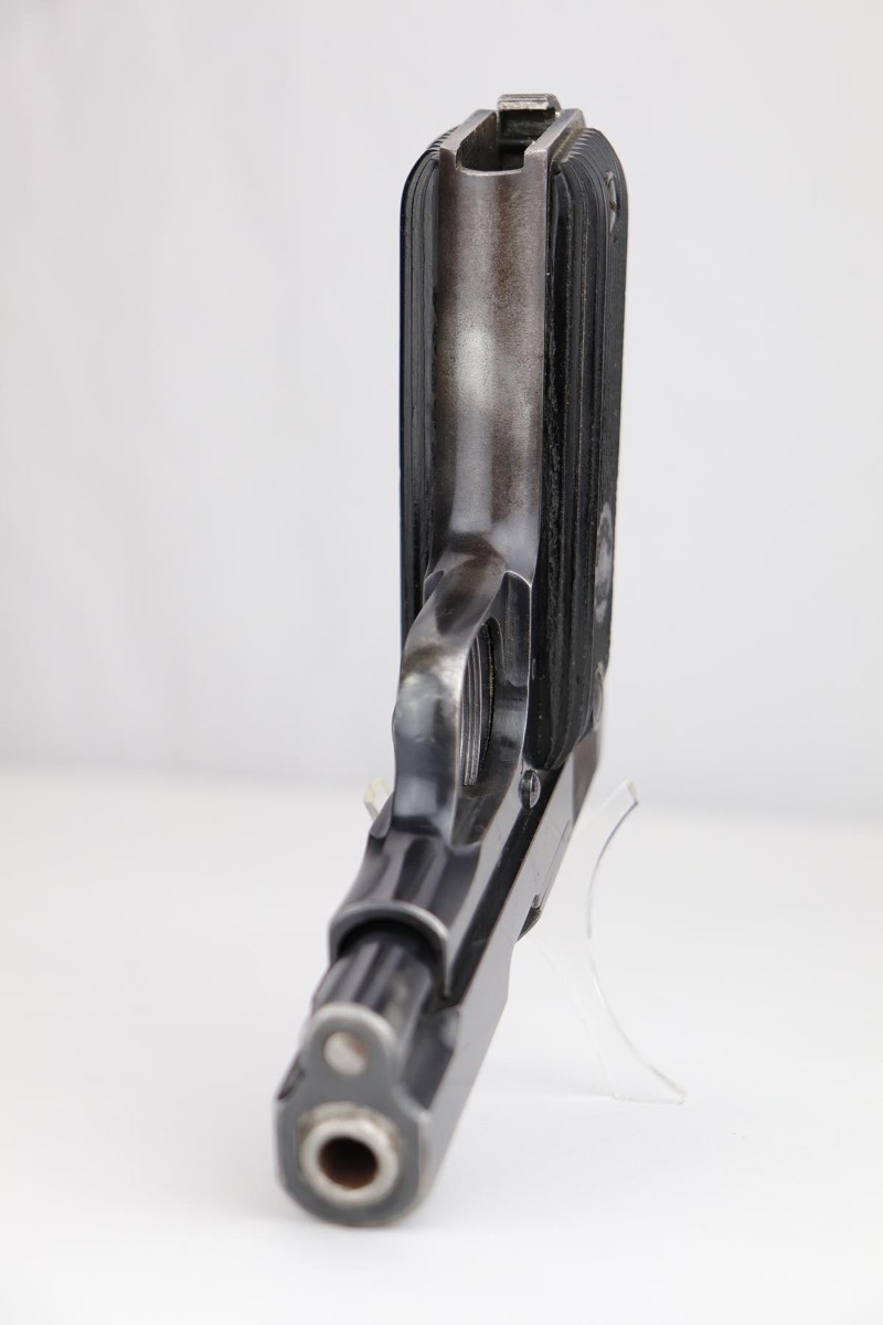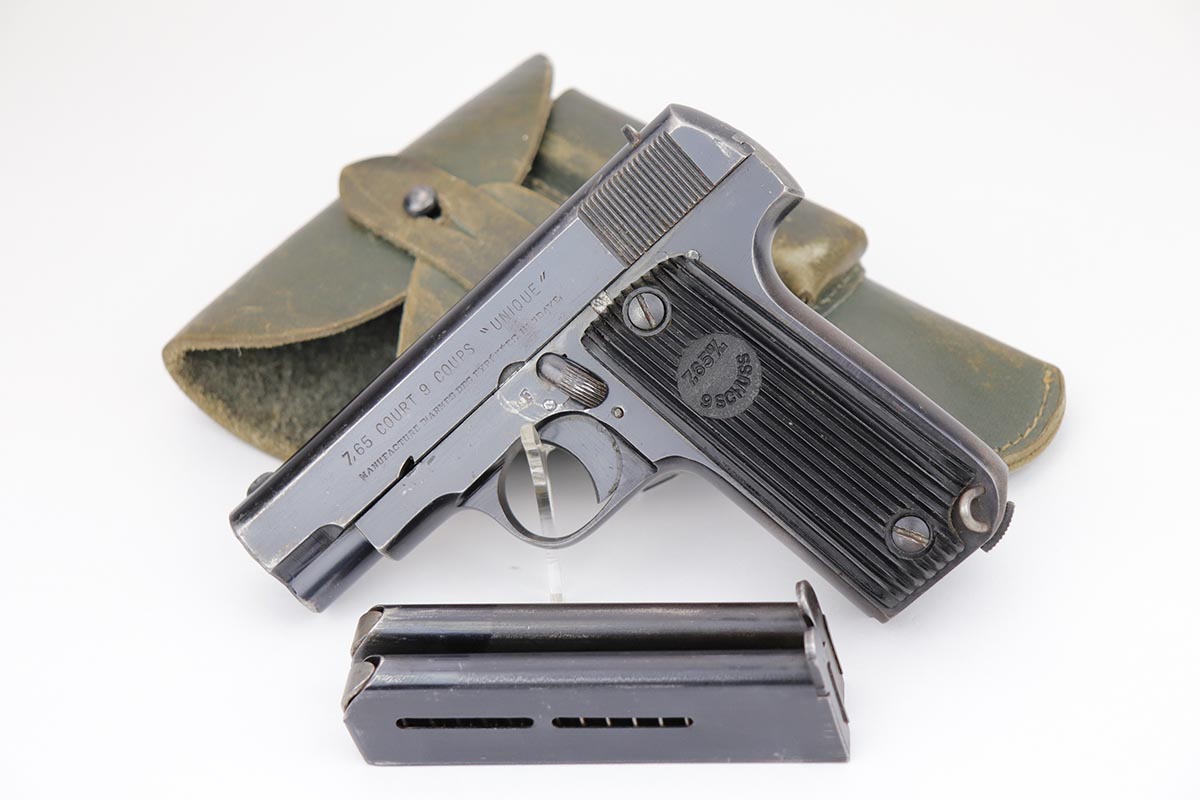 11/1/19 – This is a Nazi marked French Unique 17 rig, one of about 30,000 produced. The Unique 17 was produced by Manufacture D’Armes Des Pyrenees for the German army after the June 1940 occupation of France. The pistol is all original and correct with about 80-85% blue remaining. The profile shows minor thinning but is in very good condition, but there is considerable thinning on the straps. The pistol comes with a nice, unmarked holster. Two original magazines. Bore is shiny with decent rifling but does have some freckling throughout.