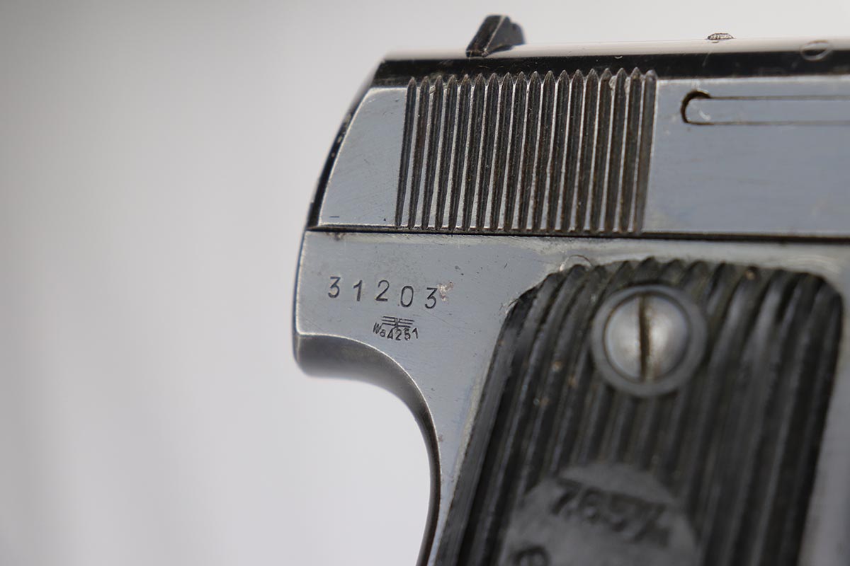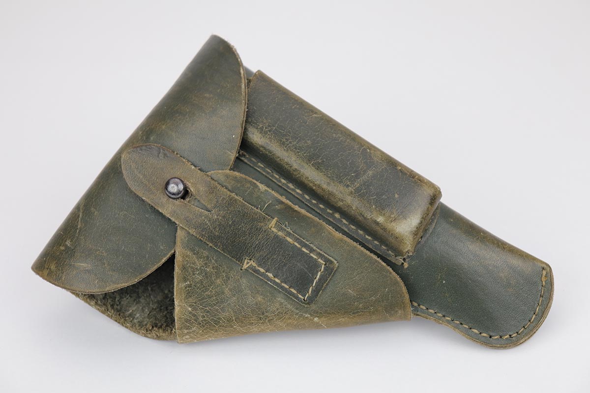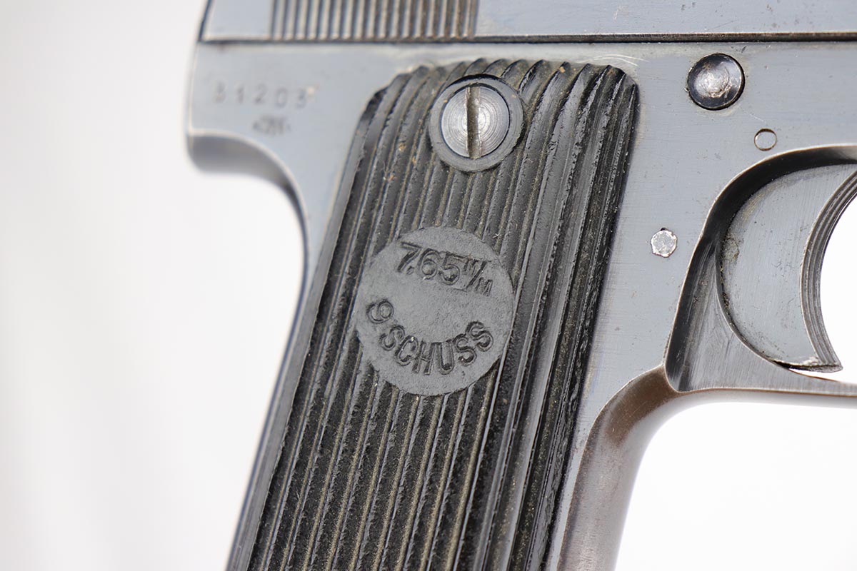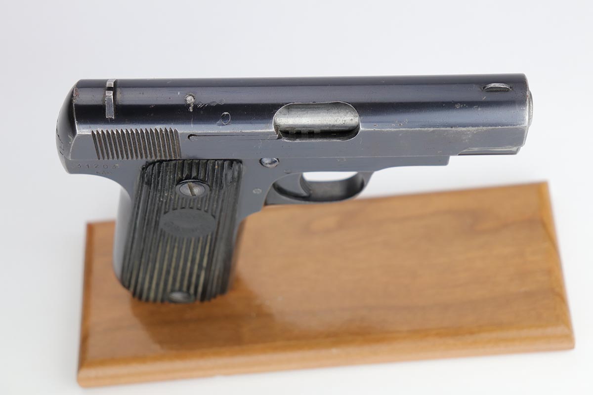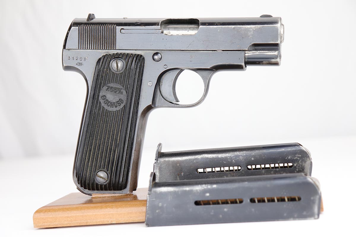 11/1/19 – This is a Nazi marked French Unique 17 rig, one of about 30,000 produced. The Unique 17 was produced by Manufacture D’Armes Des Pyrenees for the German army after the June 1940 occupation of France. The pistol is all original and correct with about 80-85% blue remaining. The profile shows minor thinning but is in very good condition, but there is considerable thinning on the straps. The pistol comes with a nice, unmarked holster. Two original magazines. Bore is shiny with decent rifling but does have some freckling throughout.