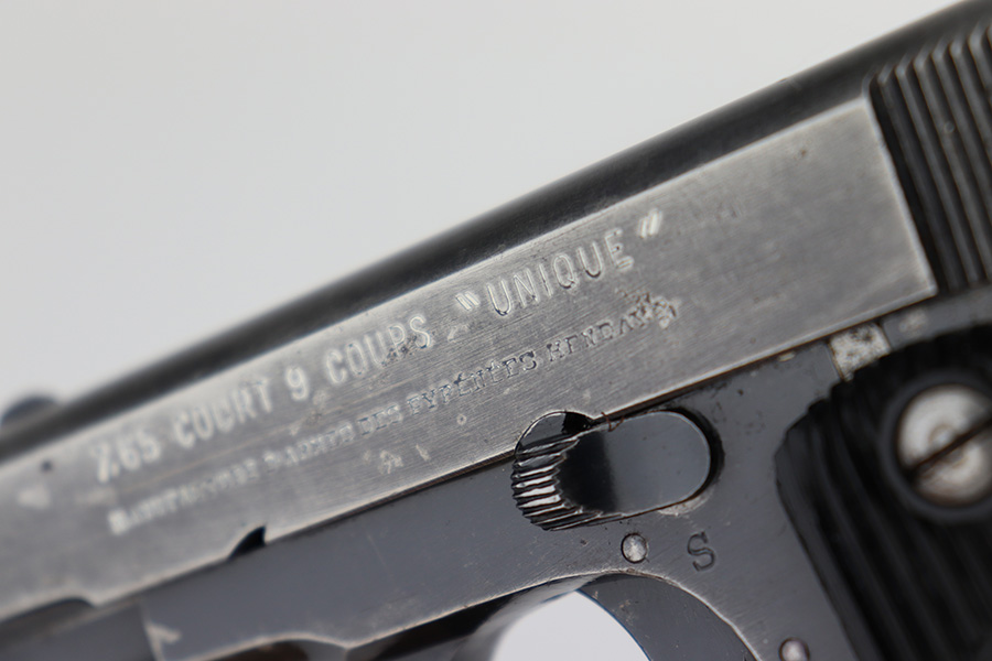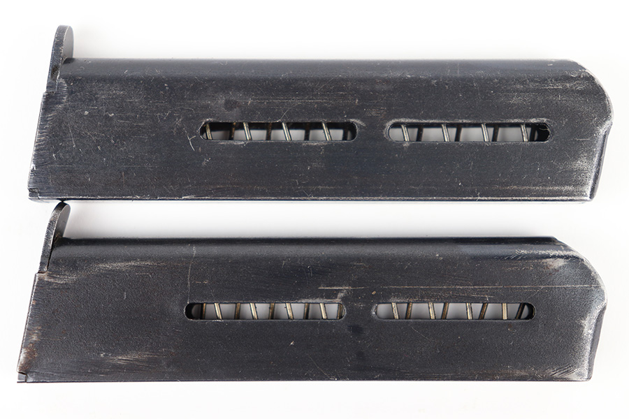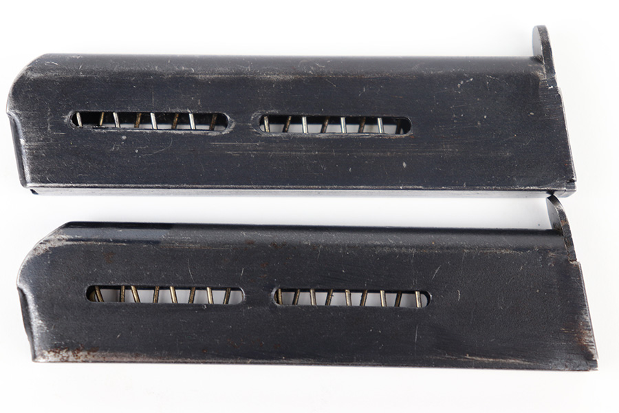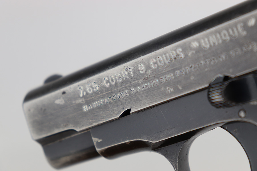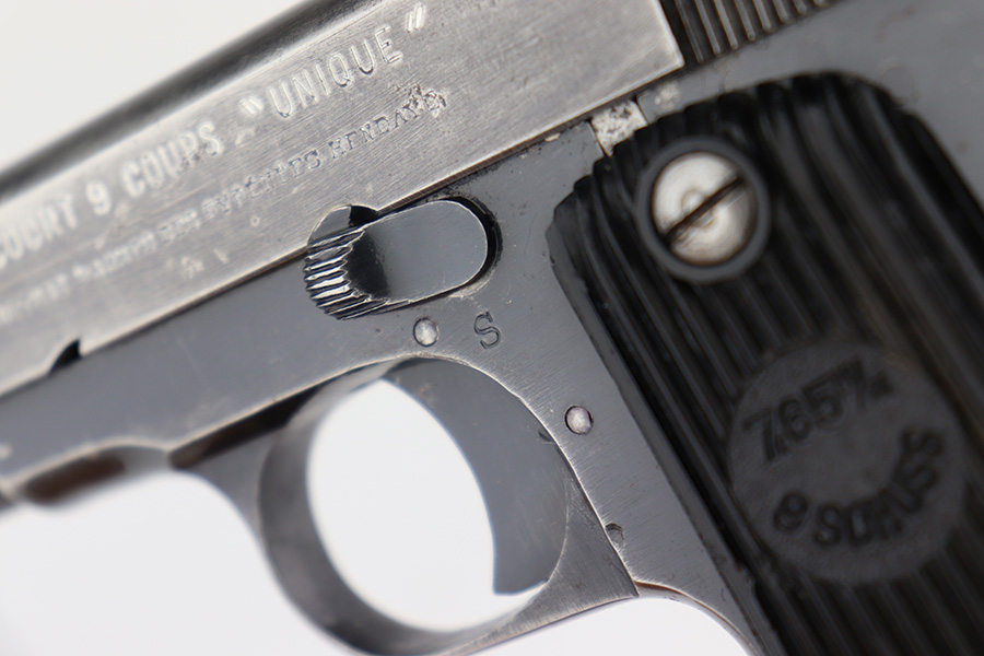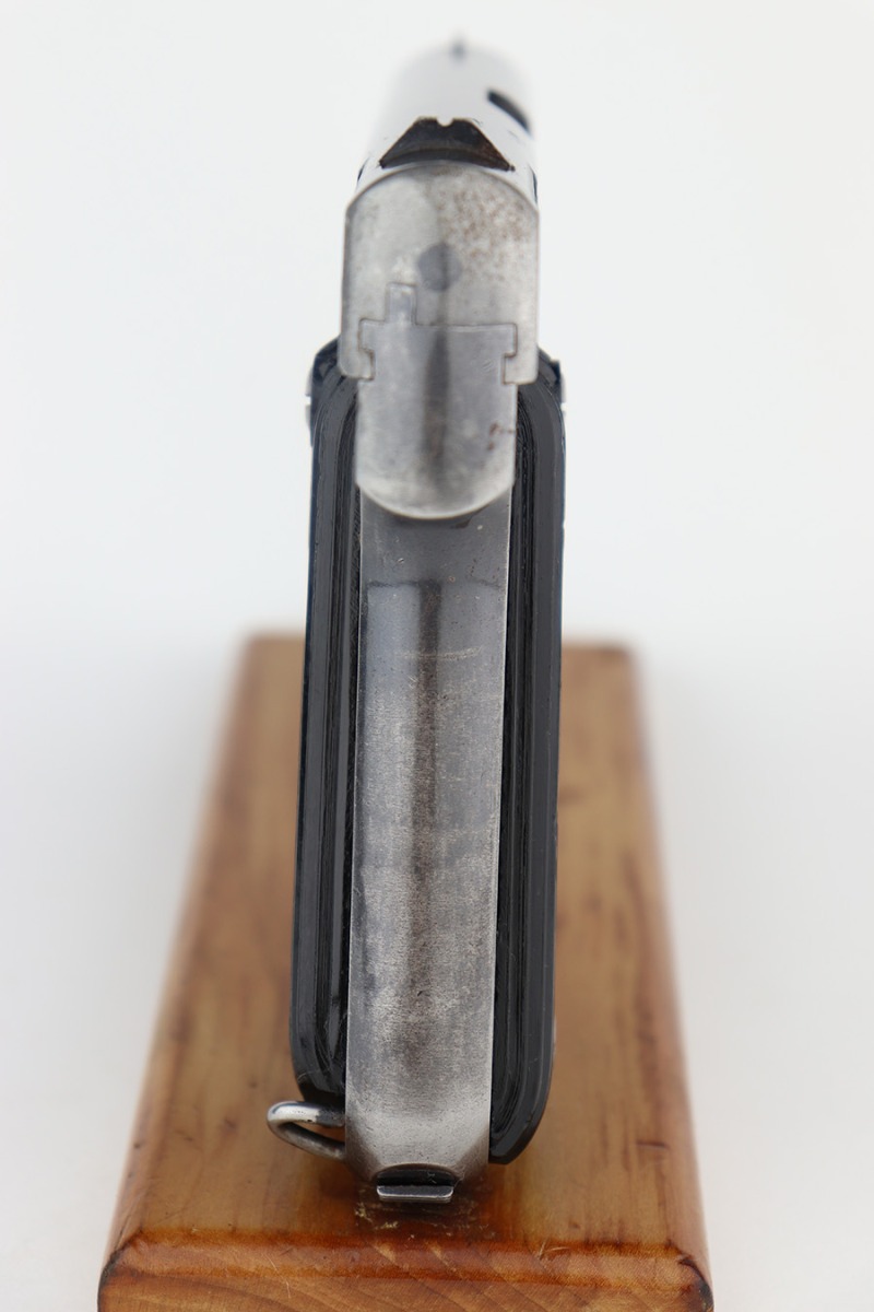 12/1/22 – This is a nice example of a French Unique Model 17 issued to the Nazi military during WW2. It is all matching and has the proper “Waffen 251” Nazi military acceptance proof on the right side of the frame. It comes as a rig with two period-correct magazines and a rare “Waffen 251” proofed tan leather military-issued holster. The gun itself has retained roughly half of its original finish. There is obvious thinning and finish loss along the whole slide and on both grip straps. A few tiny dots of discoloration here and there. Comes with very nice period-correct black plastic grips. Mint bore.