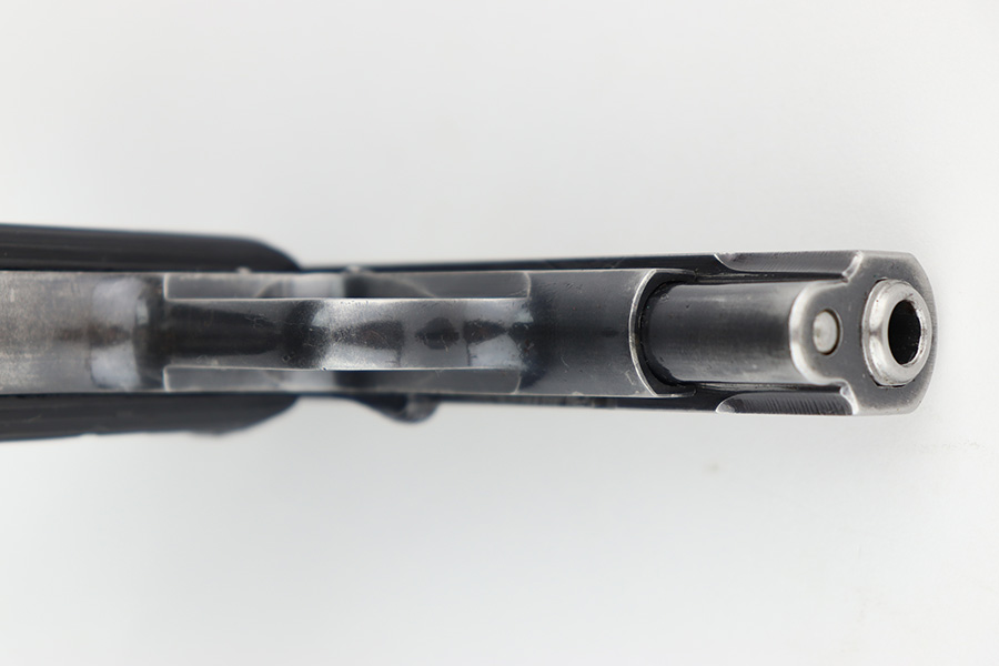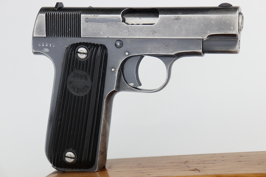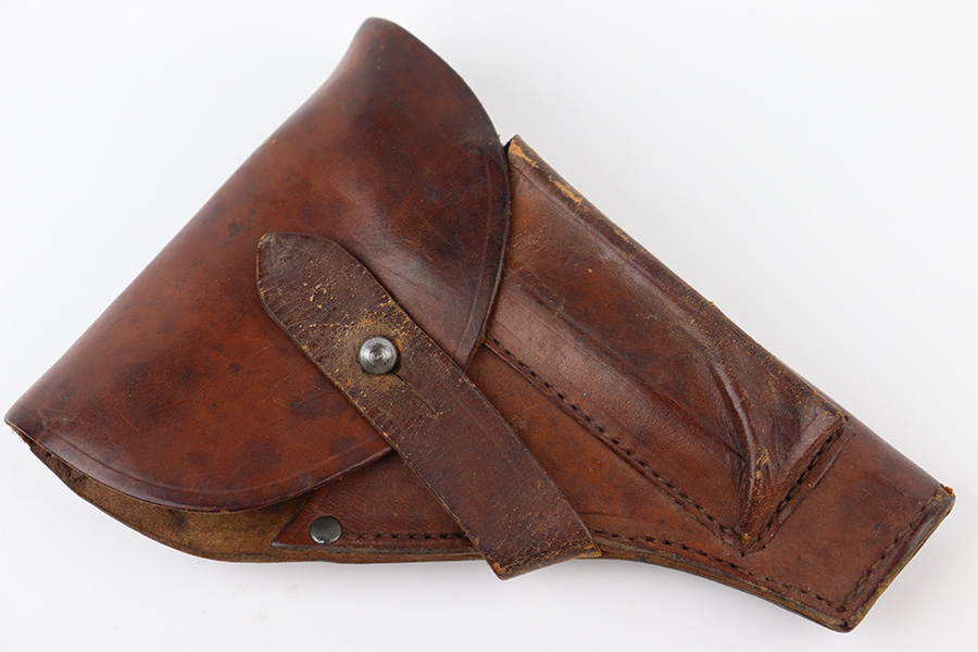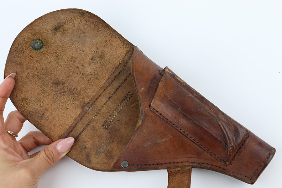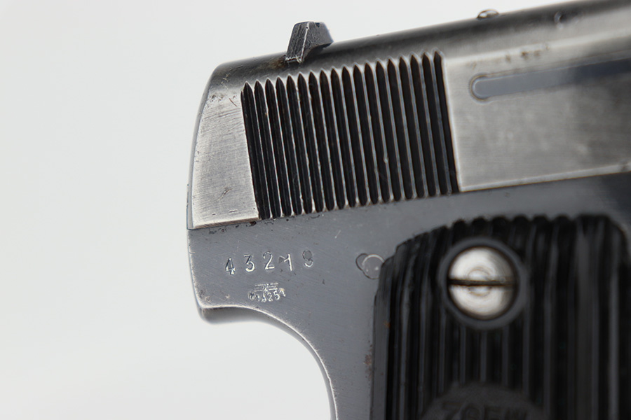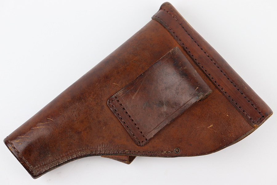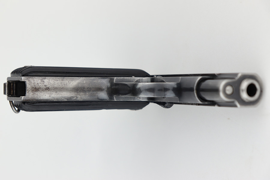 12/1/22 – This is a nice example of a French Unique Model 17 issued to the Nazi military during WW2. It is all matching and has the proper “Waffen 251” Nazi military acceptance proof on the right side of the frame. It comes as a rig with two period-correct magazines and a rare “Waffen 251” proofed tan leather military-issued holster. The gun itself has retained roughly half of its original finish. There is obvious thinning and finish loss along the whole slide and on both grip straps. A few tiny dots of discoloration here and there. Comes with very nice period-correct black plastic grips. Mint bore.
