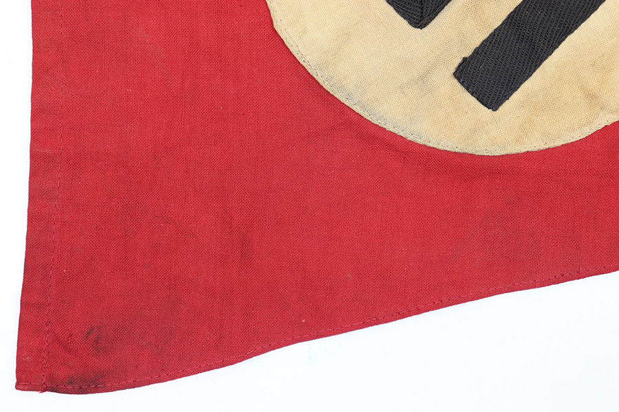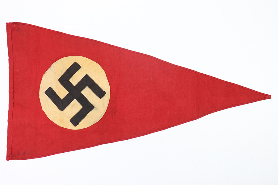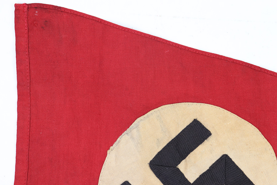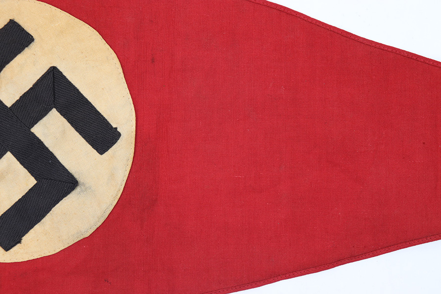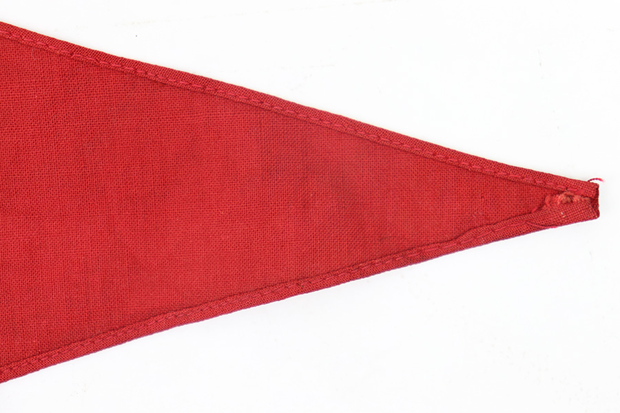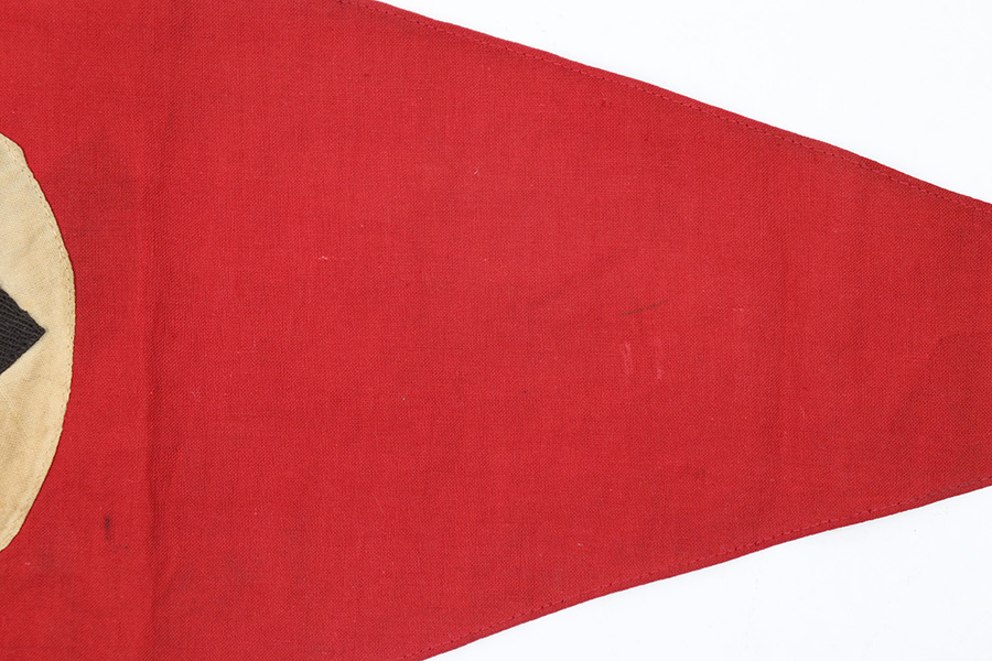 10/14/22 – This is an original WW2 German Vehicle Pennant flag. The flag is double sided with a sewn-on white circle and sewn-on swastika. Great condition with some natural wear but no major stains or issues. Excellent stitching throughout. Measures about 20 inches long.