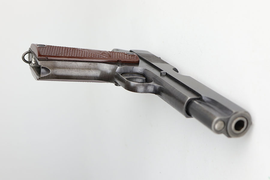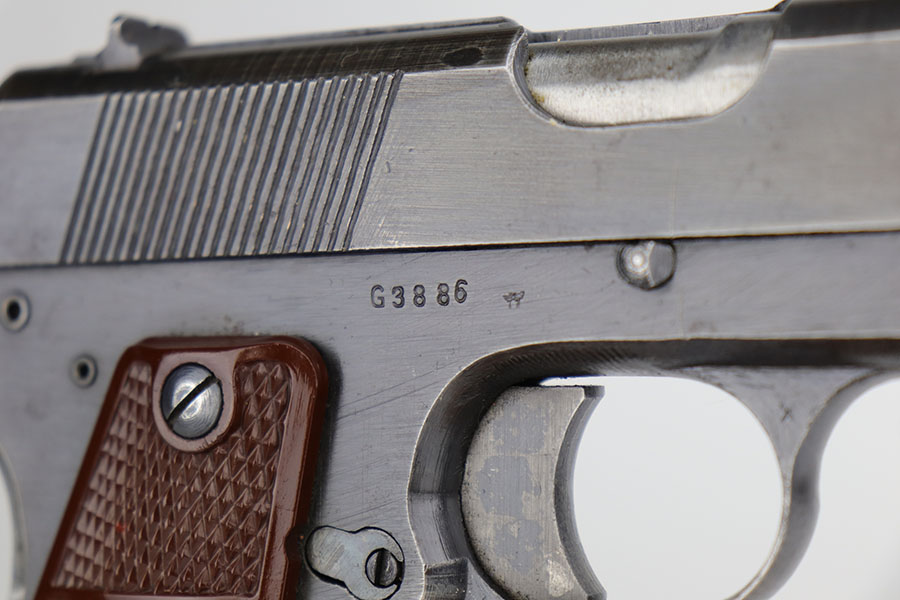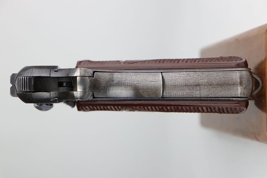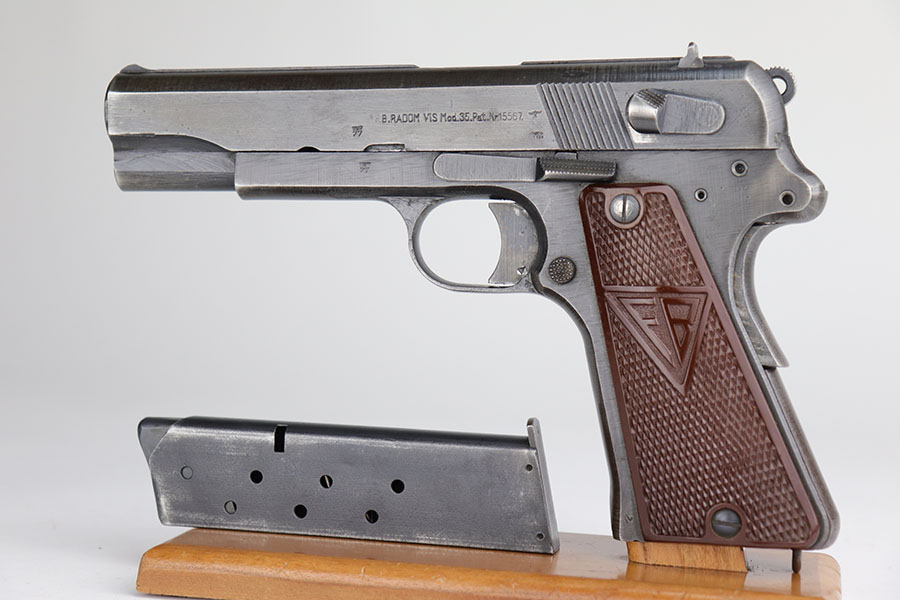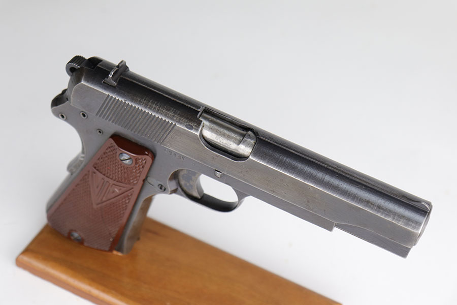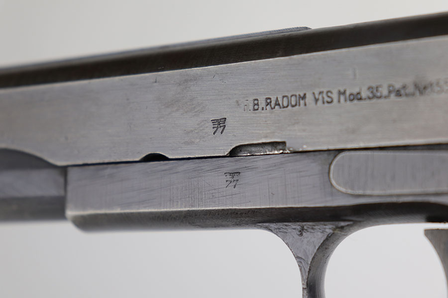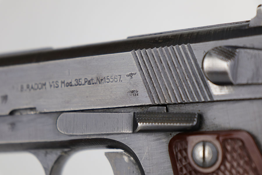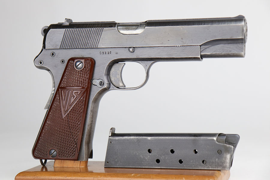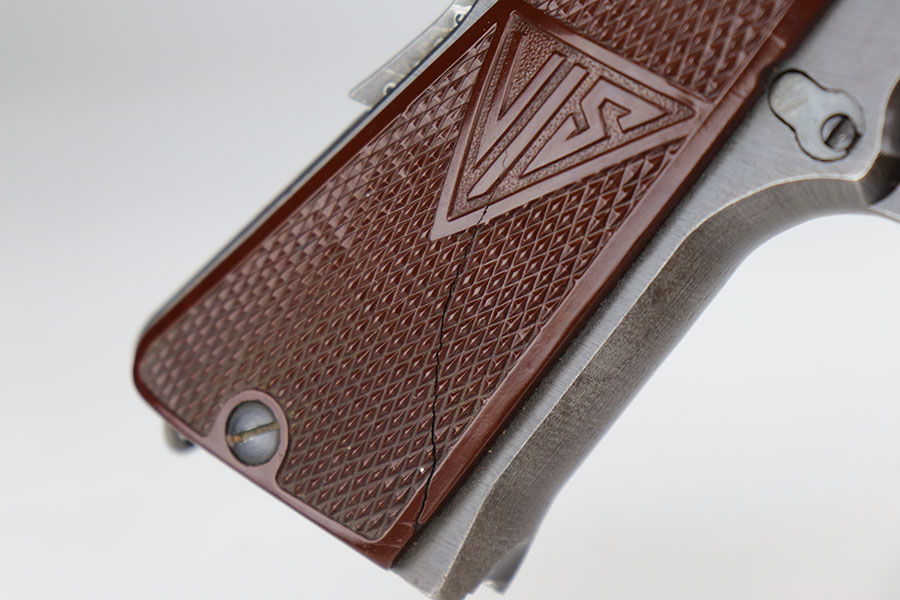 9/30/20 – This is a Nazi VIS Model 35 with two-lever frame design from mid-late war. The pistol has all matching numbers with original blue. The profile doesn’t show much actual finish loss aside from the muzzle area, but it has definitely dulled over time. Most of the wear is on the grip straps. Bore is shiny with strong rifling but some freckling in the grooves. Excellent red plastic grips aside from a crack in the right panel. Waffenamt on base of magazine.