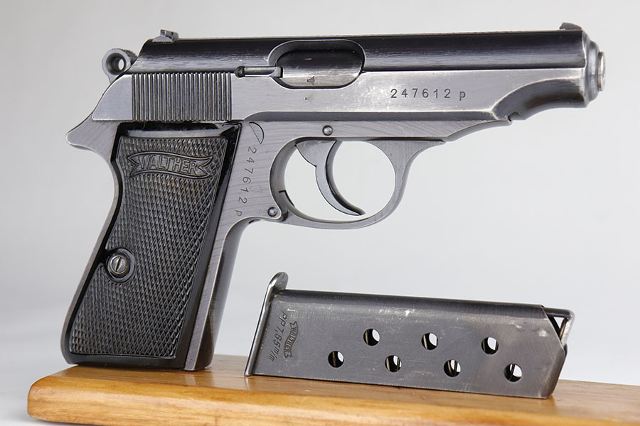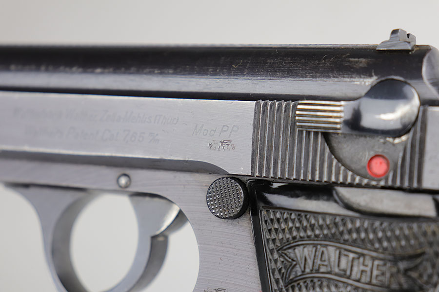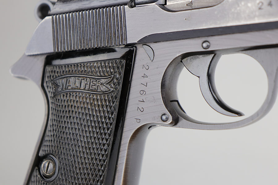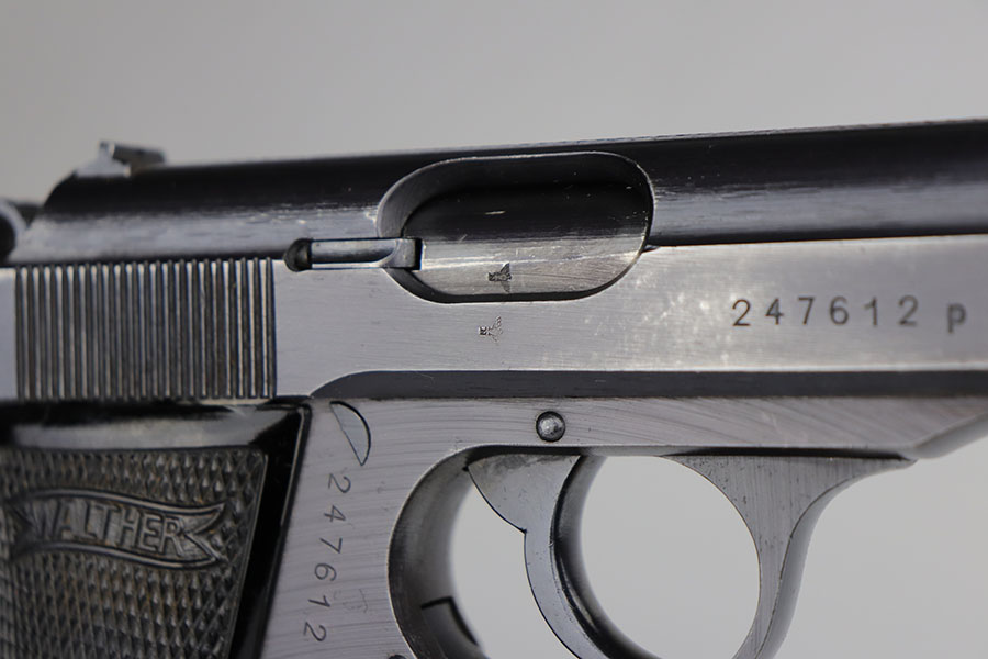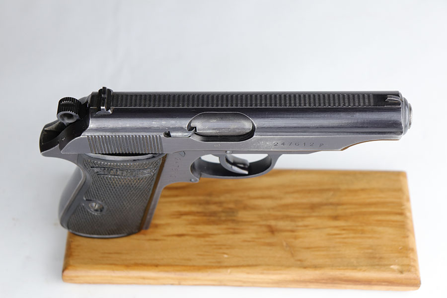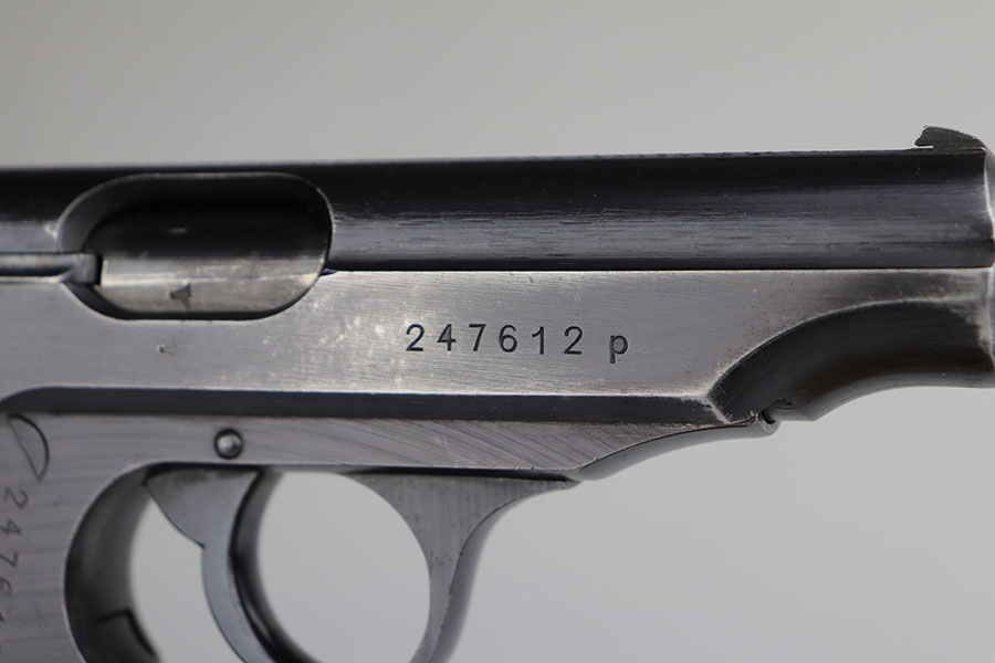 4/24/20 – This is an original Nazi Army Walther PP pistol, manufactured in 1943. The left side of the frame and slide are “Eagle 359” waffenamt. The gun is excellent condition. The original bluing rates about 92%. There is some thinning on the back strap, a mark on the front strap, wear on the high edges, and a few marks on the left and right side of the slide. The grips are original and excellent. It comes with a period-correct, wartime Walther magazine. The bore is minty – shiny with strong rifling.