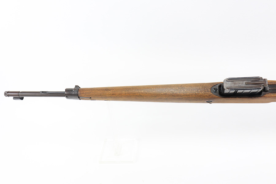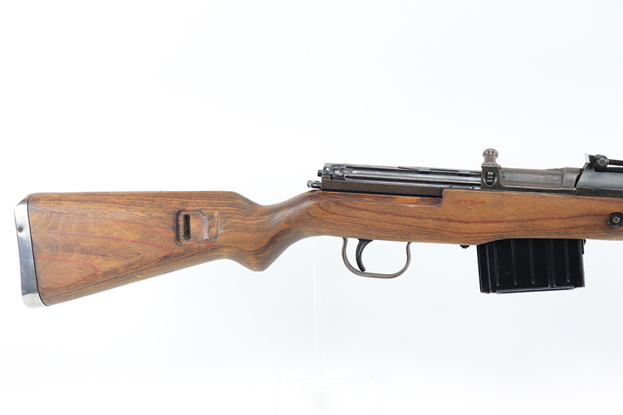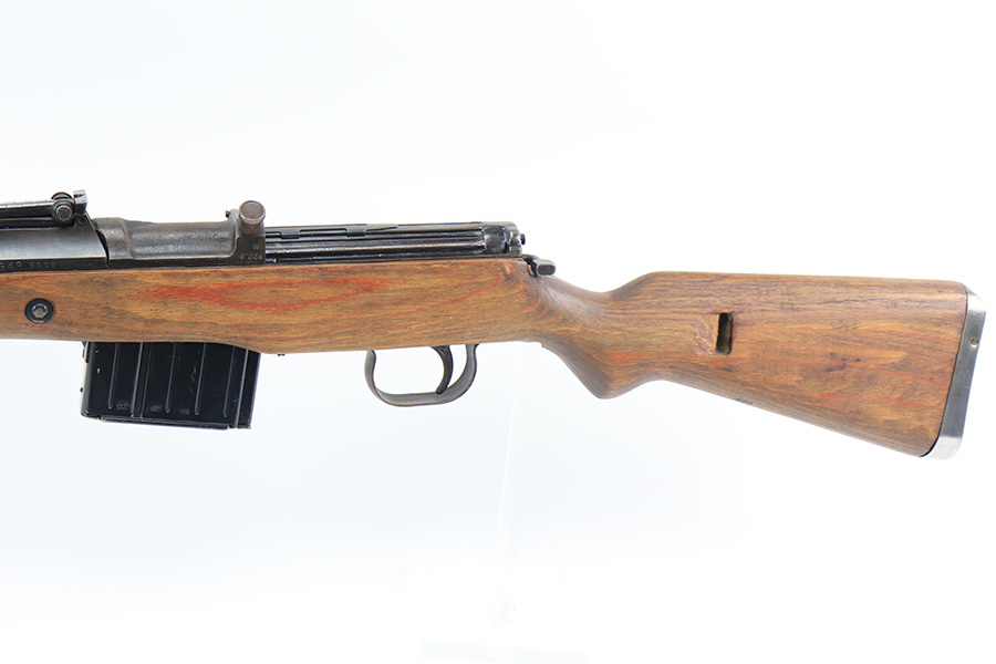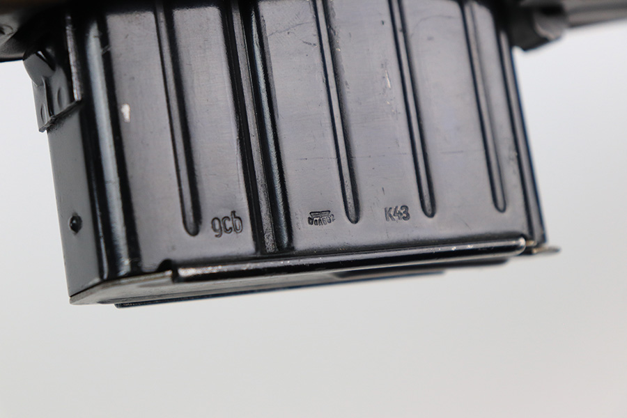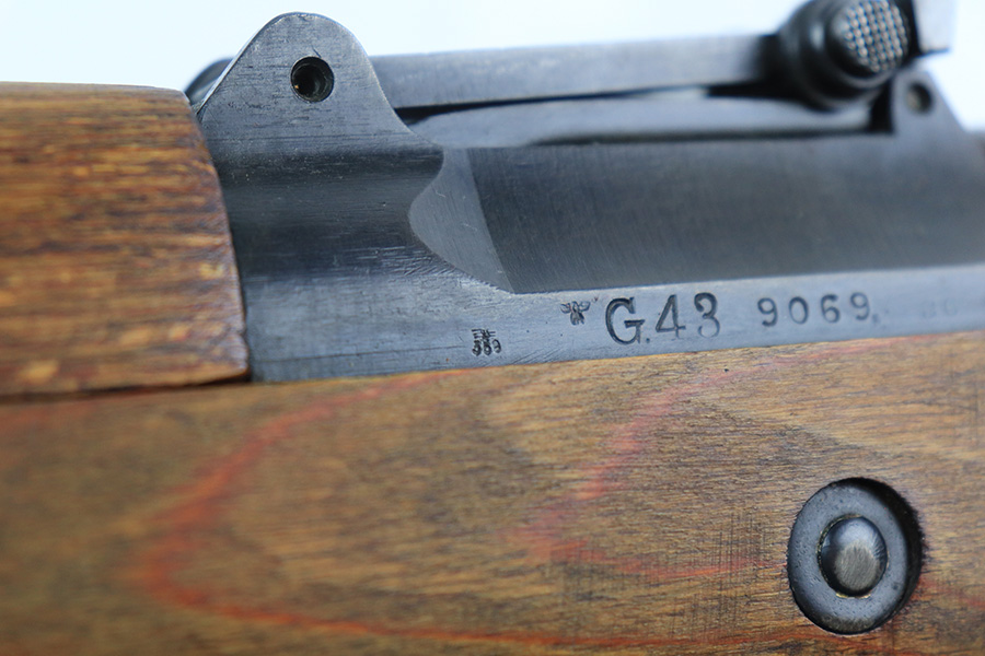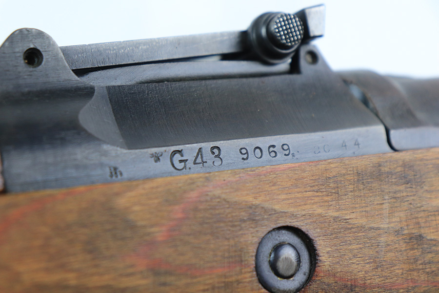 12/9/21 – This is an all matching and original Nazi G.43 rifle that was made in 1944 at the Walther factory. These are getting harder to find in all original configuration, and are one of our more highly requested rifles. Matching serials on bolt, receiver and stock. Waffenamt on right side of stock, though it is faint and may indicate the stock was sanded at some point. Nice finish on the metal parts throughout, but patina on the bolt, barrel and trigger guard. Original but painted magazine that is ‘gcb’ maker marked. Comes with cleaning rod and sight hood. Stock is in excellent condition. Strong, shiny bore.