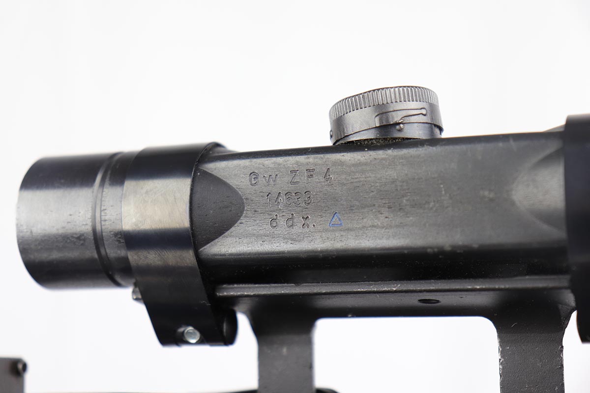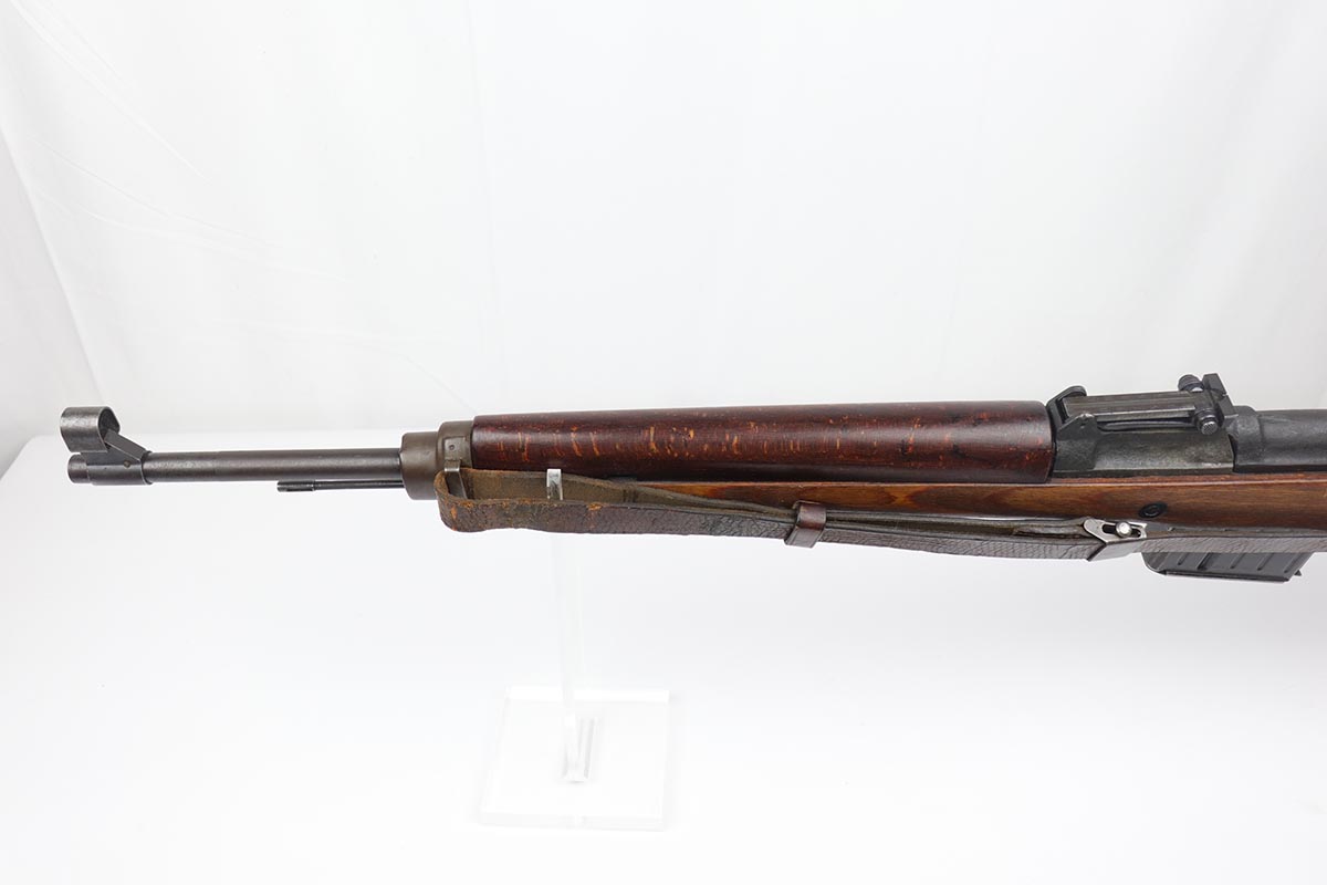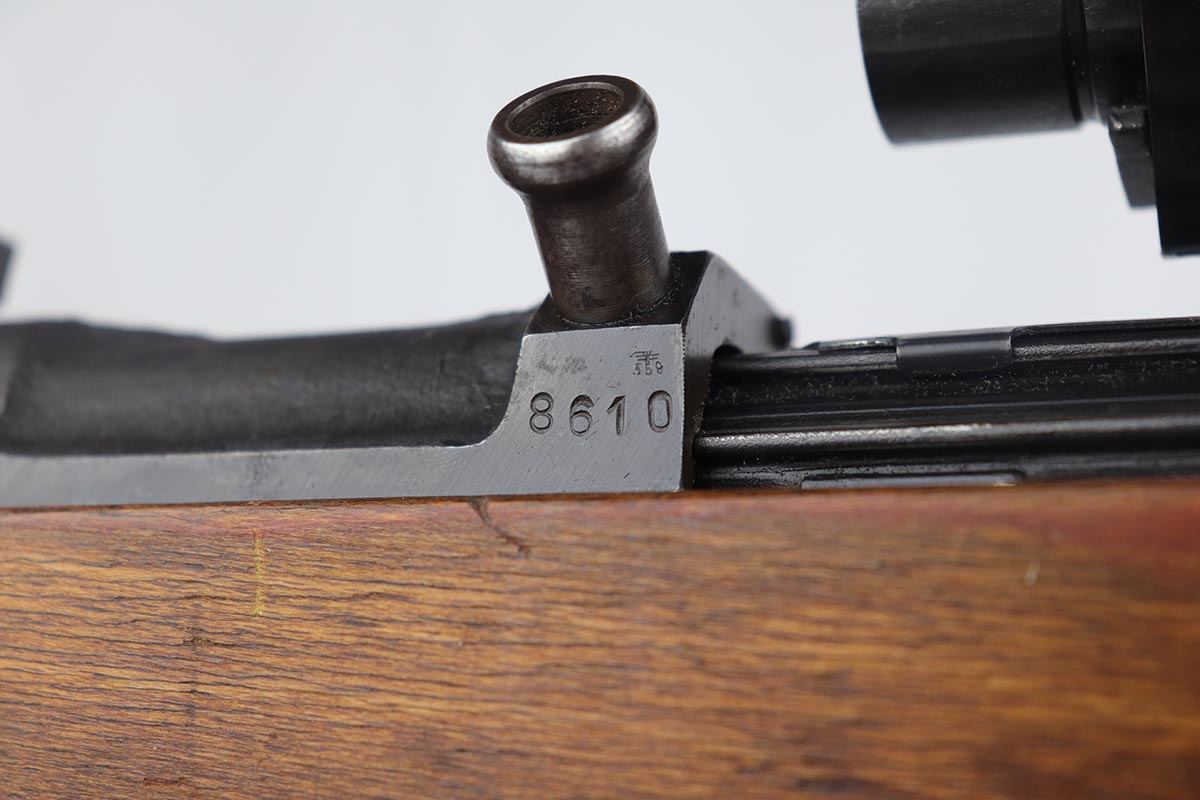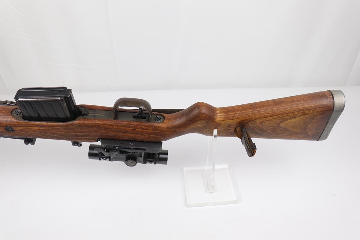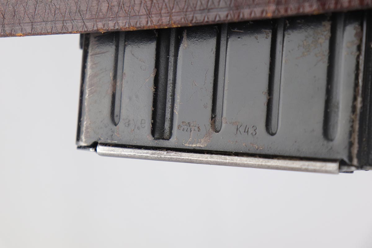 5/3/19 – This is an excellent late-war example of a Walther G43 sniper rifle, marked ‘ac 44’ on receiver. The original finish shows minimal finish loss but the machining and finish is generally rough, which is common for these. The wood on the stock is excellent with a correct waffen stamp and is faintly numbered but matching to the receiver (possibly lightly sanded). All numbers are matching. The handguard is the unique Durofol which adds to the value as this was a rare option. Also includes the front site hood and cleaning rod. The buttplate is most likely reproduction as it does not fit well onto the stock and looks new. No accessories in the compartment. The gun also comes with the ZF 4 original German scope. Good condition and serviceable, but the optics are cloudy. The scope mount is waffen proofed (eagle 214), but we believe to be reproduction. The lever on the mount functions well. In addition – we could not get it off without considerable effort so we are leaving it on and will ship with the scope on the gun. The front of the scope mount looks like someone whacked at it a bit to get it off. See the photo in the listing. We decided to not add to the whacking ! Two replacement screws in the mount holding the scope on (certainly could be improved upon). The rifle includes the correct “aye” original magazine and an original leather sling. Overall a very functional and nice looking Nazi German sniper rifle. Excellent bore.