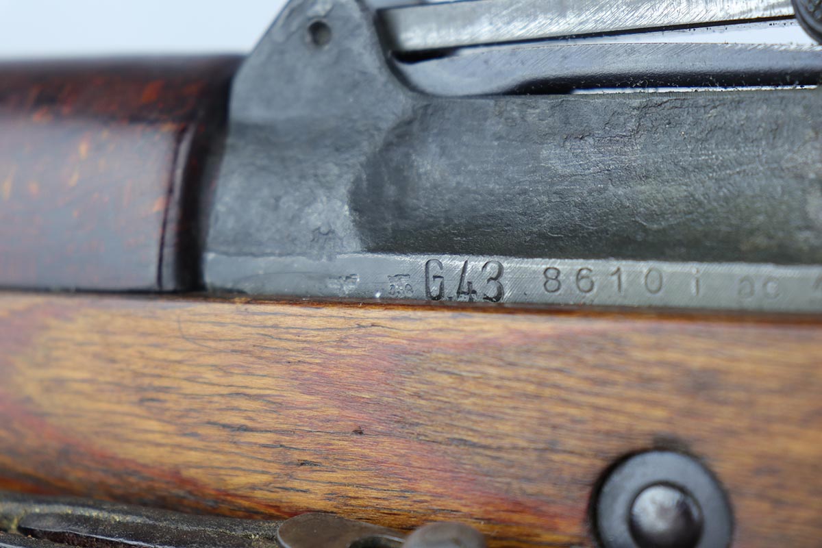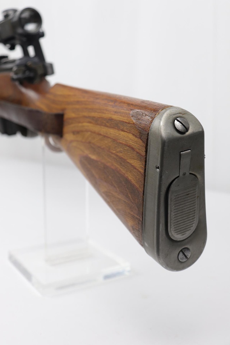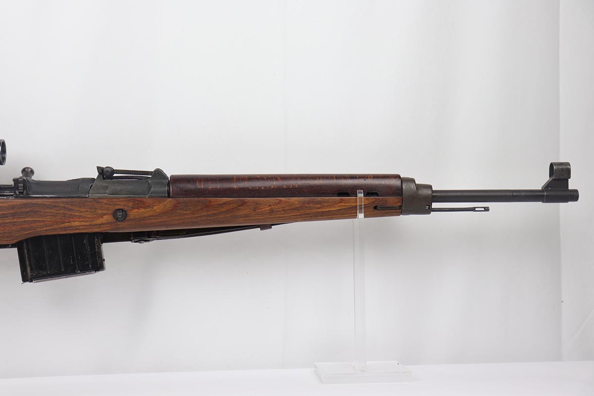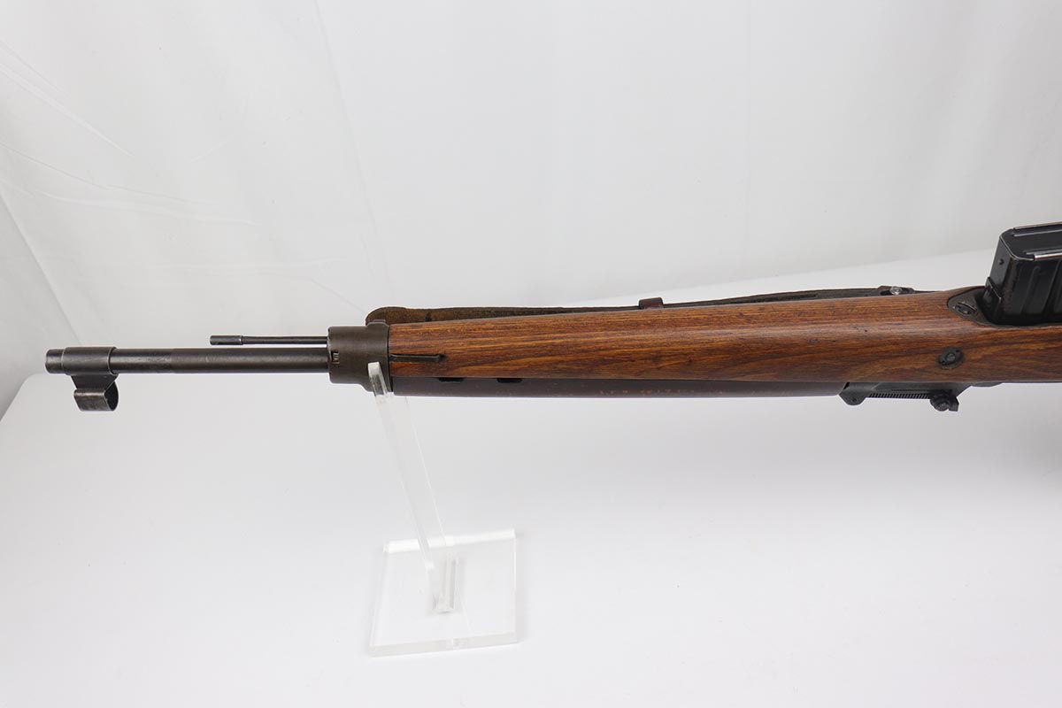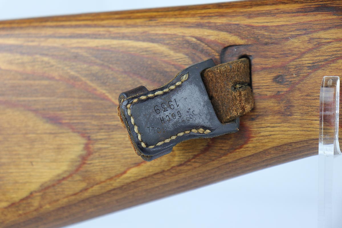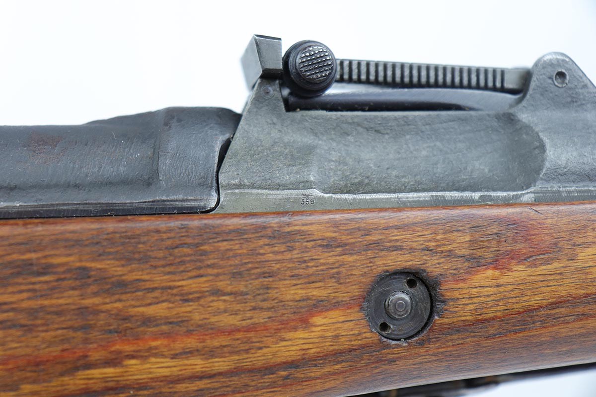 5/3/19 – This is an excellent late-war example of a Walther G43 sniper rifle, marked ‘ac 44’ on receiver. The original finish shows minimal finish loss but the machining and finish is generally rough, which is common for these. The wood on the stock is excellent with a correct waffen stamp and is faintly numbered but matching to the receiver (possibly lightly sanded). All numbers are matching. The handguard is the unique Durofol which adds to the value as this was a rare option. Also includes the front site hood and cleaning rod. The buttplate is most likely reproduction as it does not fit well onto the stock and looks new. No accessories in the compartment. The gun also comes with the ZF 4 original German scope. Good condition and serviceable, but the optics are cloudy. The scope mount is waffen proofed (eagle 214), but we believe to be reproduction. The lever on the mount functions well. In addition – we could not get it off without considerable effort so we are leaving it on and will ship with the scope on the gun. The front of the scope mount looks like someone whacked at it a bit to get it off. See the photo in the listing. We decided to not add to the whacking ! Two replacement screws in the mount holding the scope on (certainly could be improved upon). The rifle includes the correct “aye” original magazine and an original leather sling. Overall a very functional and nice looking Nazi German sniper rifle. Excellent bore.