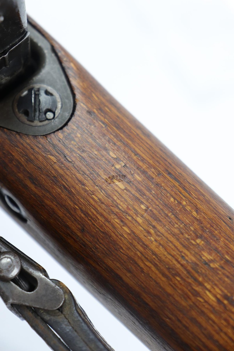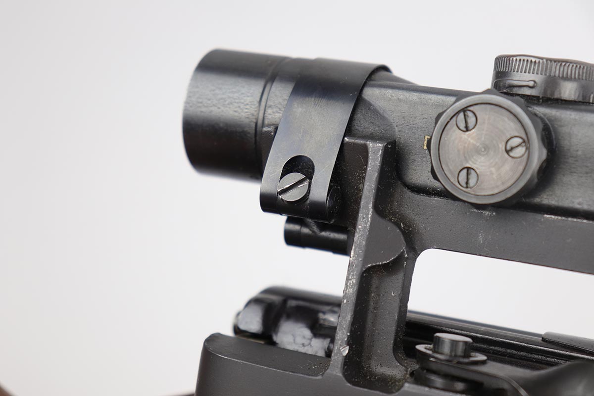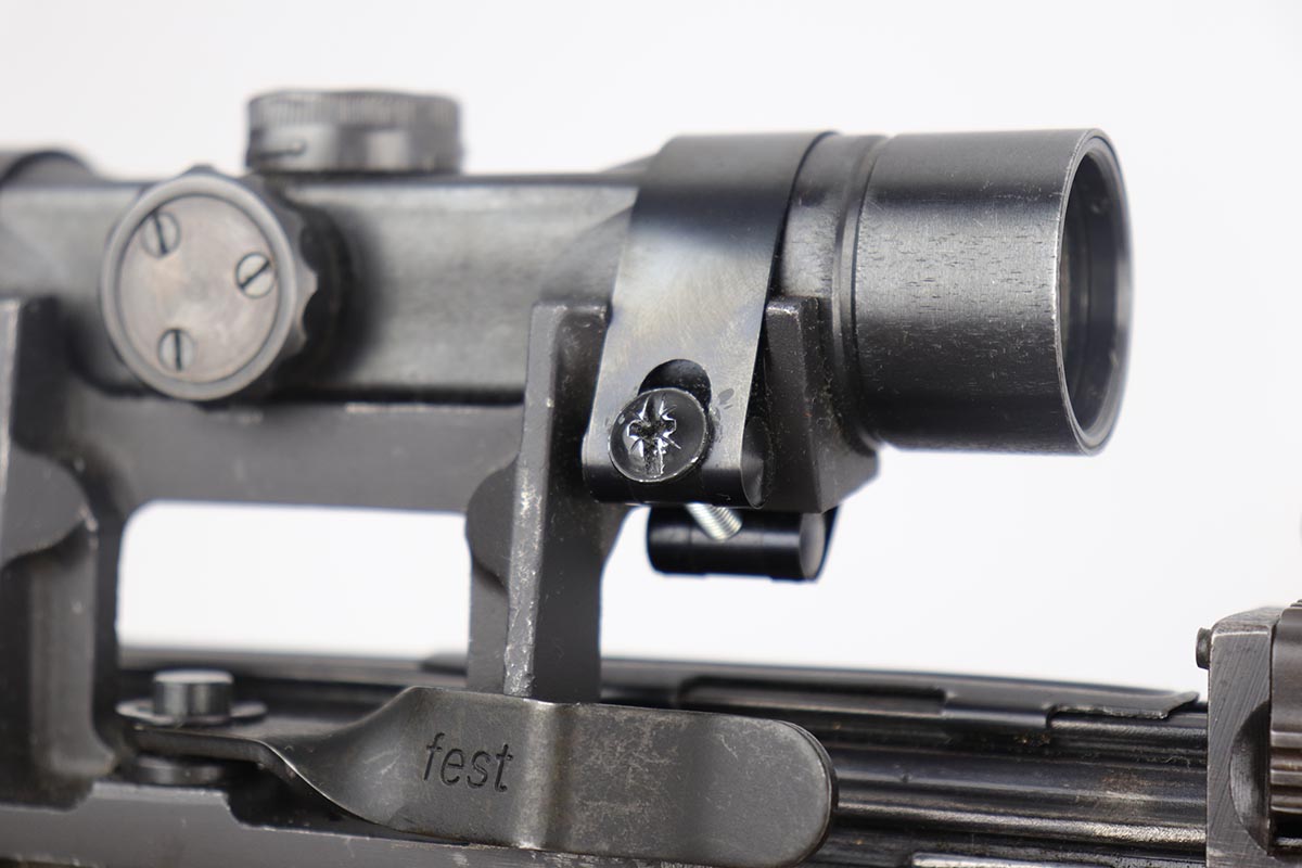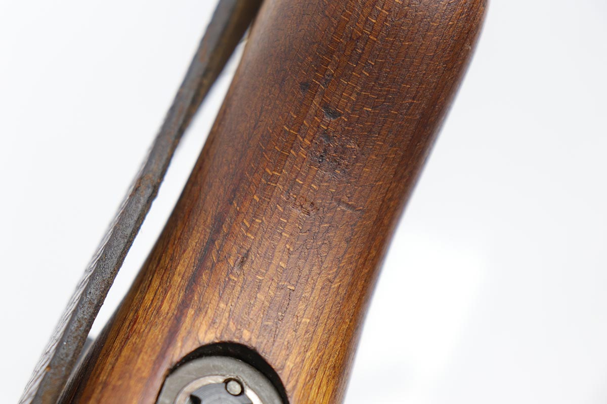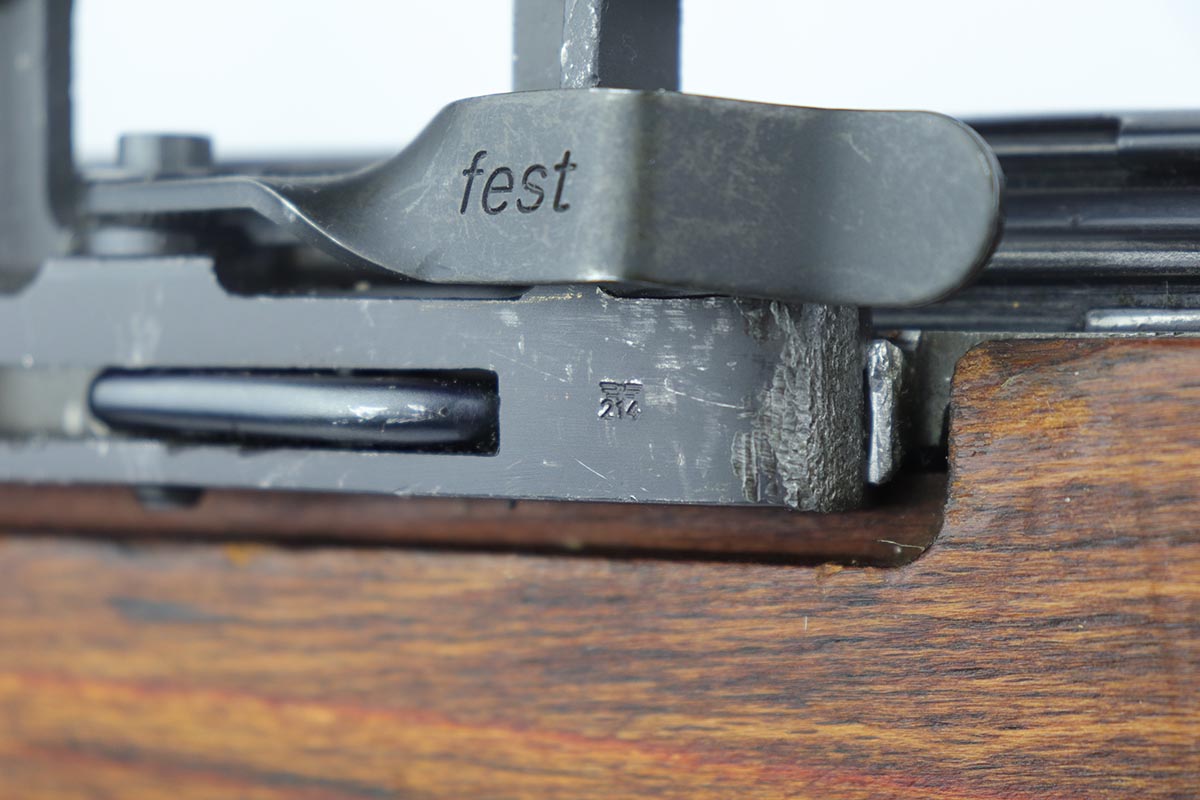 5/3/19 – This is an excellent late-war example of a Walther G43 sniper rifle, marked ‘ac 44’ on receiver. The original finish shows minimal finish loss but the machining and finish is generally rough, which is common for these. The wood on the stock is excellent with a correct waffen stamp and is faintly numbered but matching to the receiver (possibly lightly sanded). All numbers are matching. The handguard is the unique Durofol which adds to the value as this was a rare option. Also includes the front site hood and cleaning rod. The buttplate is most likely reproduction as it does not fit well onto the stock and looks new. No accessories in the compartment. The gun also comes with the ZF 4 original German scope. Good condition and serviceable, but the optics are cloudy. The scope mount is waffen proofed (eagle 214), but we believe to be reproduction. The lever on the mount functions well. In addition – we could not get it off without considerable effort so we are leaving it on and will ship with the scope on the gun. The front of the scope mount looks like someone whacked at it a bit to get it off. See the photo in the listing. We decided to not add to the whacking ! Two replacement screws in the mount holding the scope on (certainly could be improved upon). The rifle includes the correct “aye” original magazine and an original leather sling. Overall a very functional and nice looking Nazi German sniper rifle. Excellent bore.