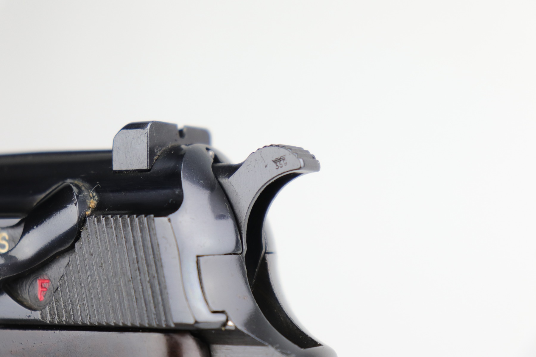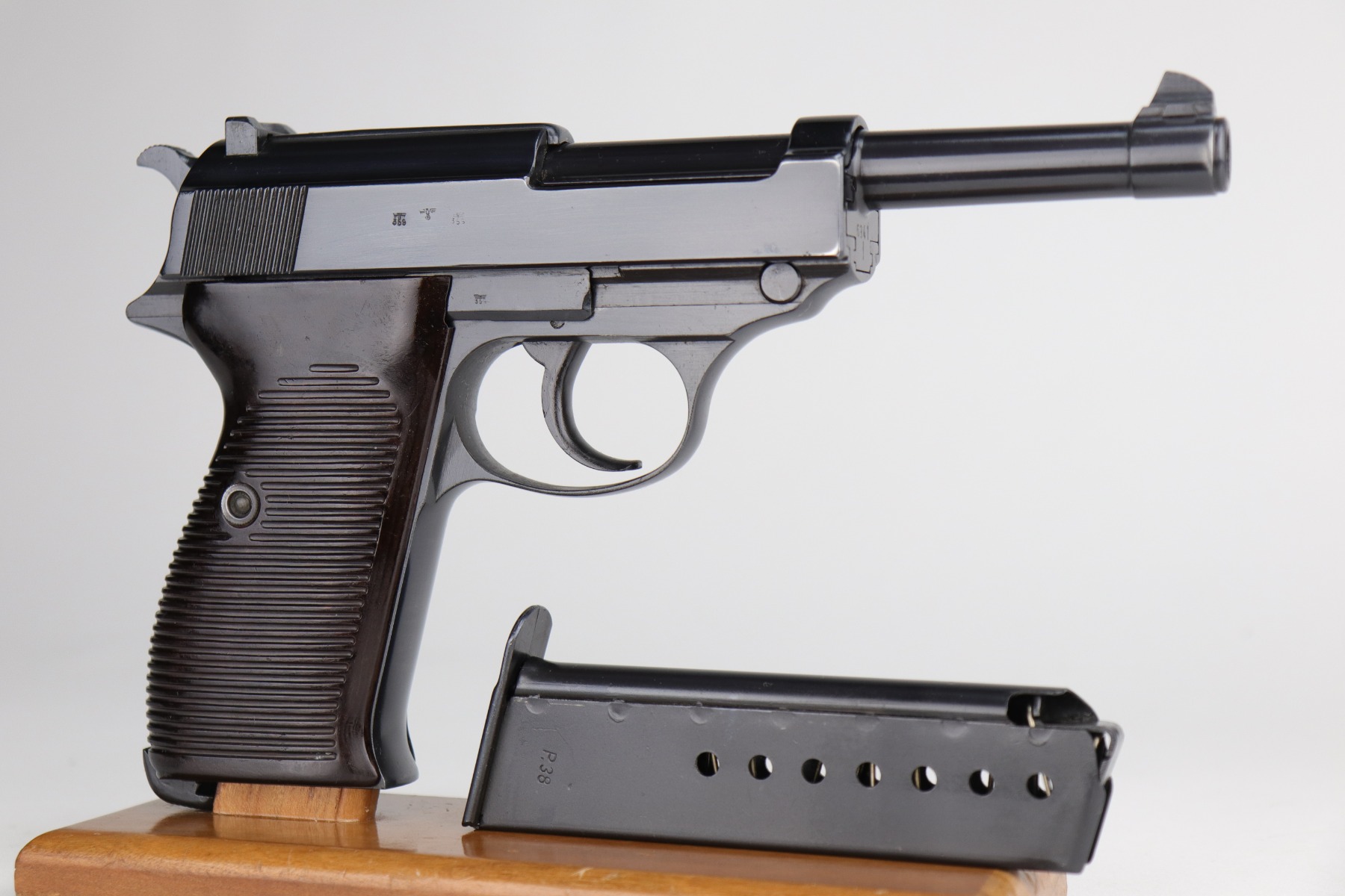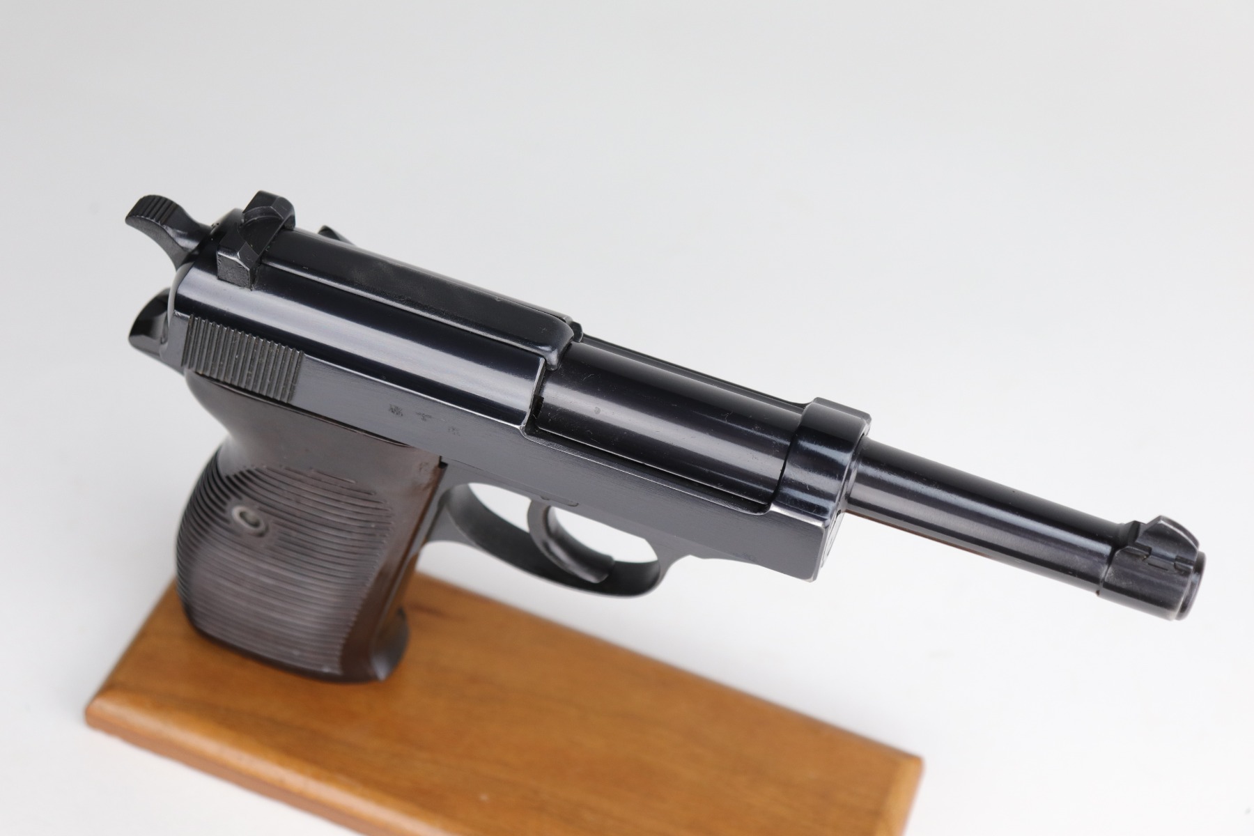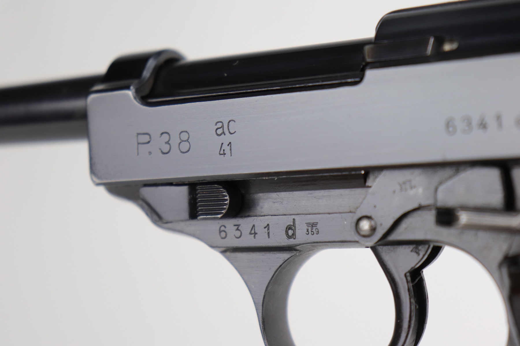 9/23/20 – This is a Walther P.38 issued to the Nazi military in 1941. It has an “AC” Walther factory code and has the proper “Eagle 359” military acceptance proofs. This particular gun has been completely professionally restored. The metal parts have been re-blued, and the finish is shiny and beautiful. The markings are still visible. The only sign of wear is very minor high edge wear on the slide and one small area of wear on the top plate. The gun is matching and fully functional, except for the de-cocker. Excellent, original grips. It comes with one period-correct, numbered magazine. It is not numbered to the gun, but it is very close. The bore has decent rifling, but there is minor pitting throughout.