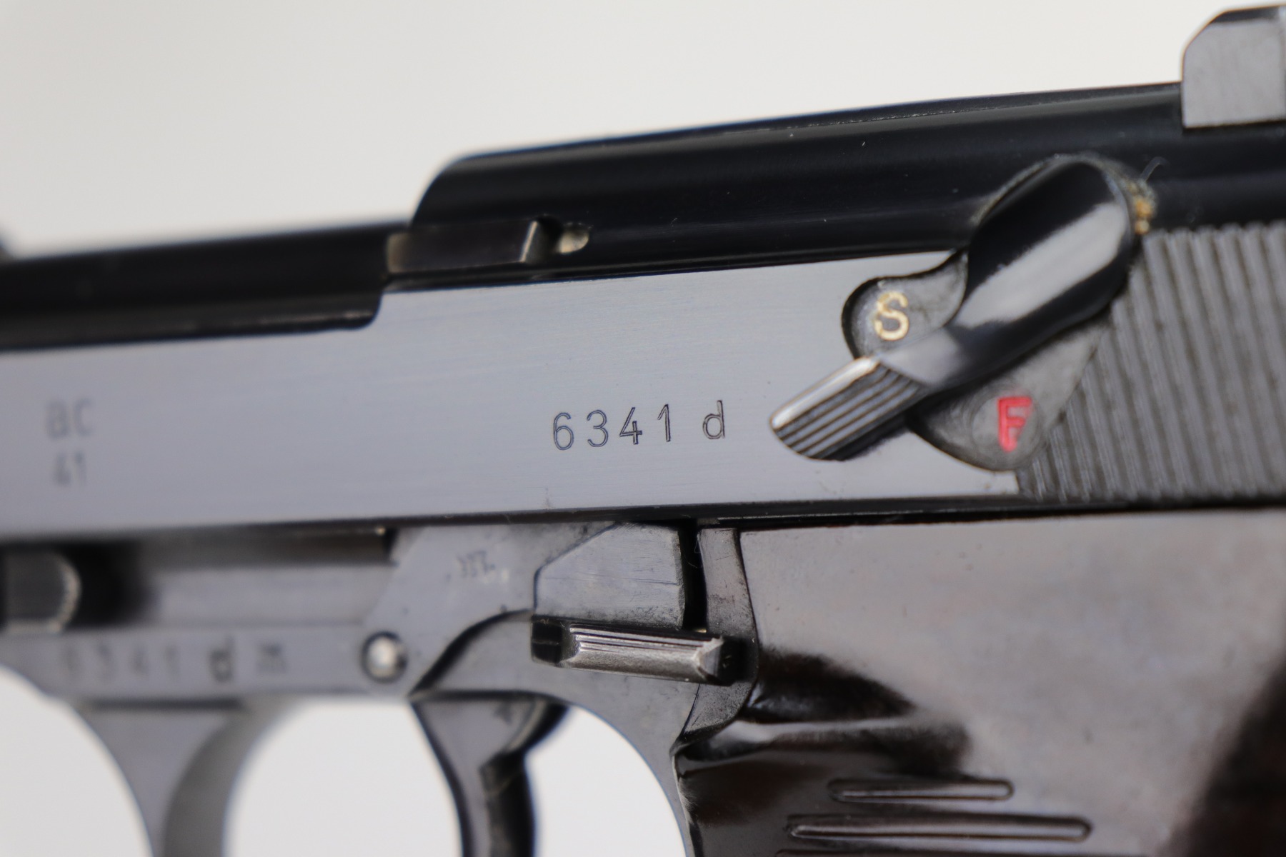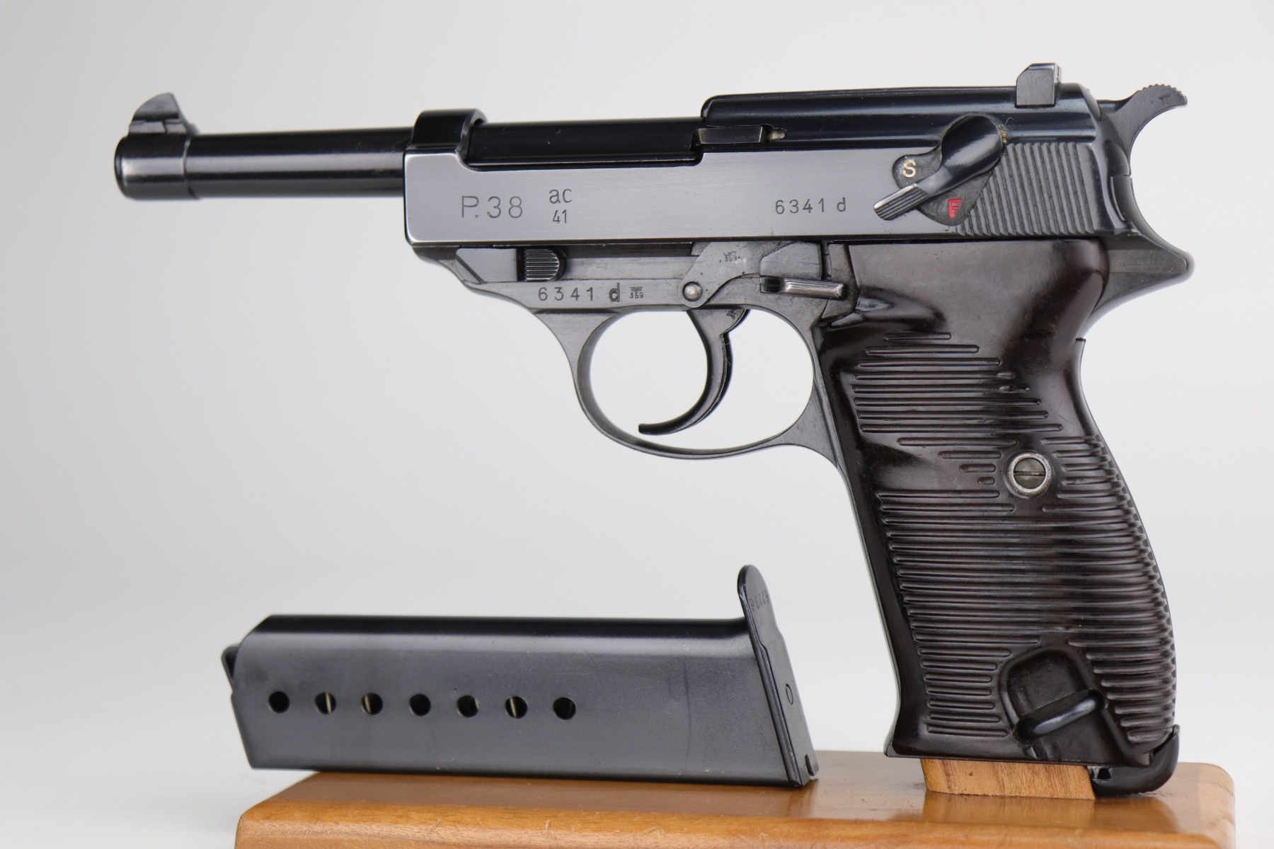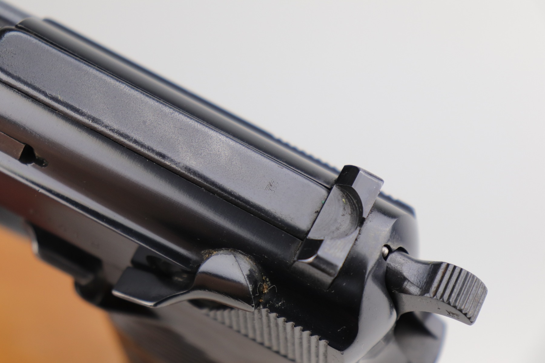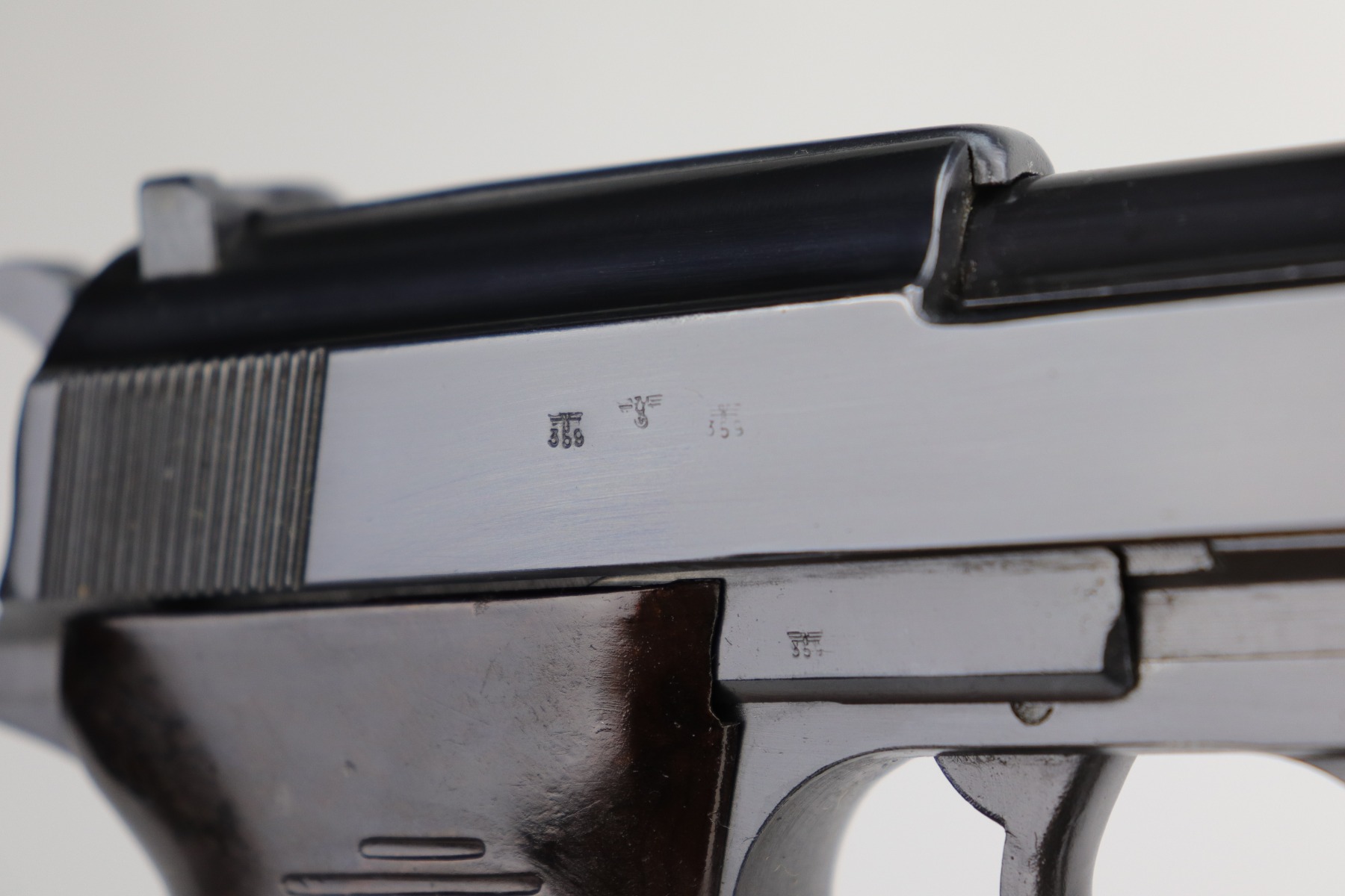 9/23/20 – This is a Walther P.38 issued to the Nazi military in 1941. It has an “AC” Walther factory code and has the proper “Eagle 359” military acceptance proofs. This particular gun has been completely professionally restored. The metal parts have been re-blued, and the finish is shiny and beautiful. The markings are still visible. The only sign of wear is very minor high edge wear on the slide and one small area of wear on the top plate. The gun is matching and fully functional, except for the de-cocker. Excellent, original grips. It comes with one period-correct, numbered magazine. It is not numbered to the gun, but it is very close. The bore has decent rifling, but there is minor pitting throughout.