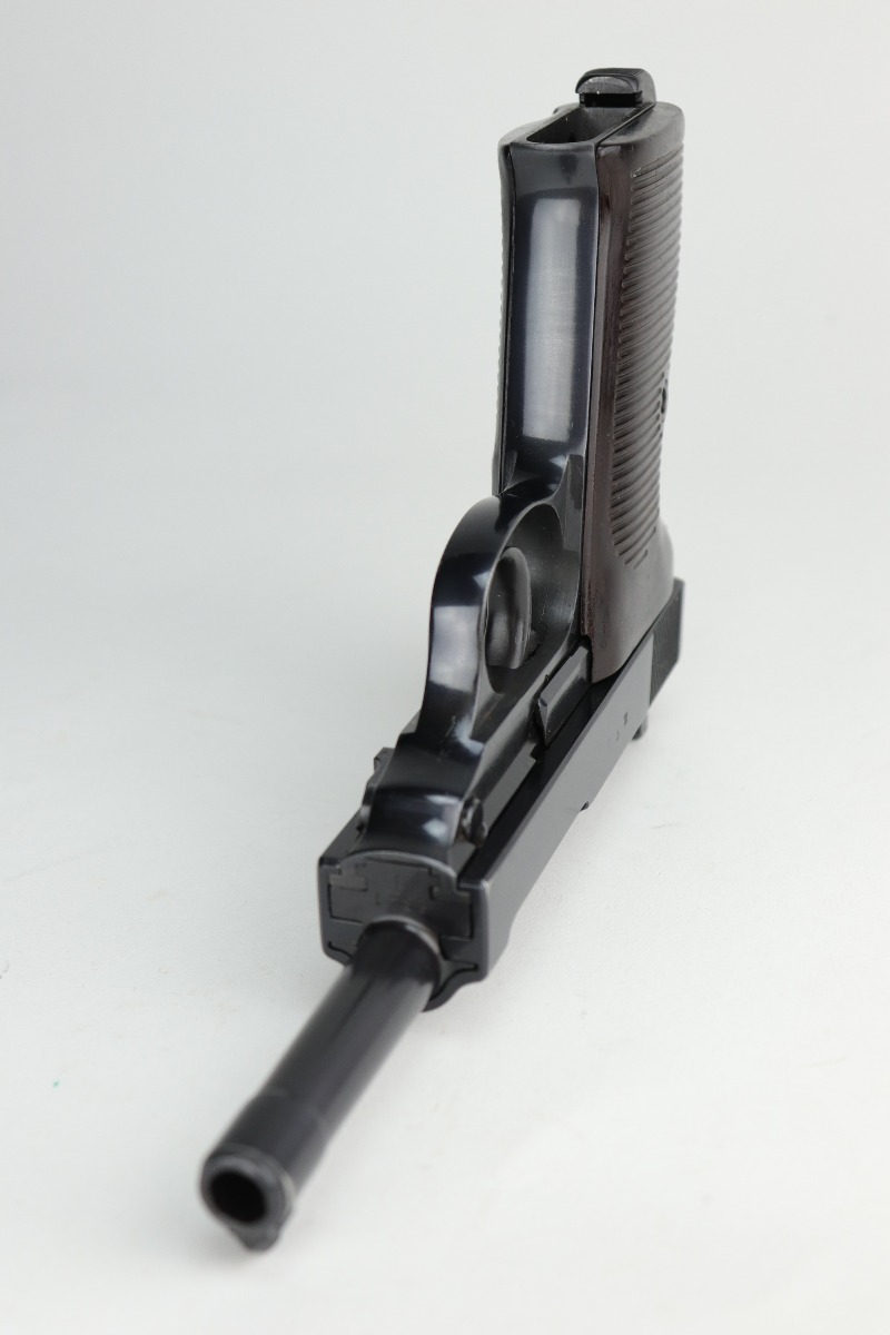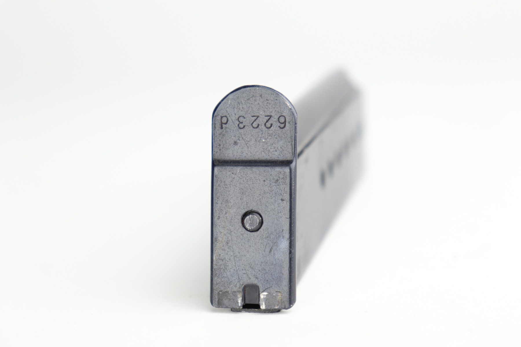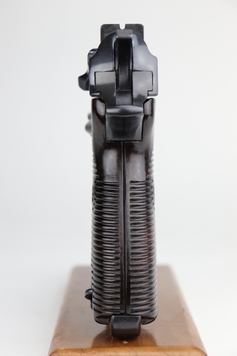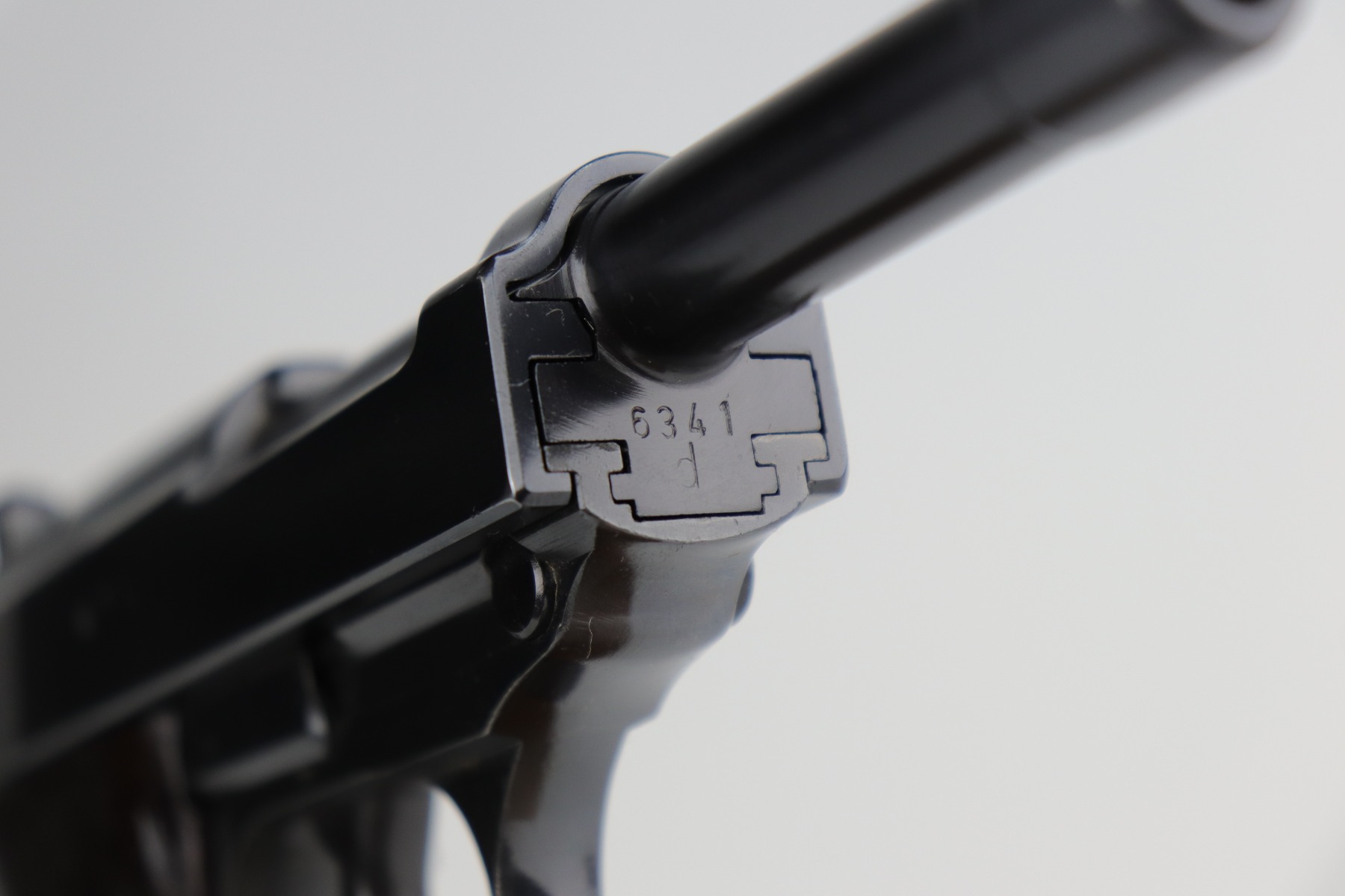 9/23/20 – This is a Walther P.38 issued to the Nazi military in 1941. It has an “AC” Walther factory code and has the proper “Eagle 359” military acceptance proofs. This particular gun has been completely professionally restored. The metal parts have been re-blued, and the finish is shiny and beautiful. The markings are still visible. The only sign of wear is very minor high edge wear on the slide and one small area of wear on the top plate. The gun is matching and fully functional, except for the de-cocker. Excellent, original grips. It comes with one period-correct, numbered magazine. It is not numbered to the gun, but it is very close. The bore has decent rifling, but there is minor pitting throughout.