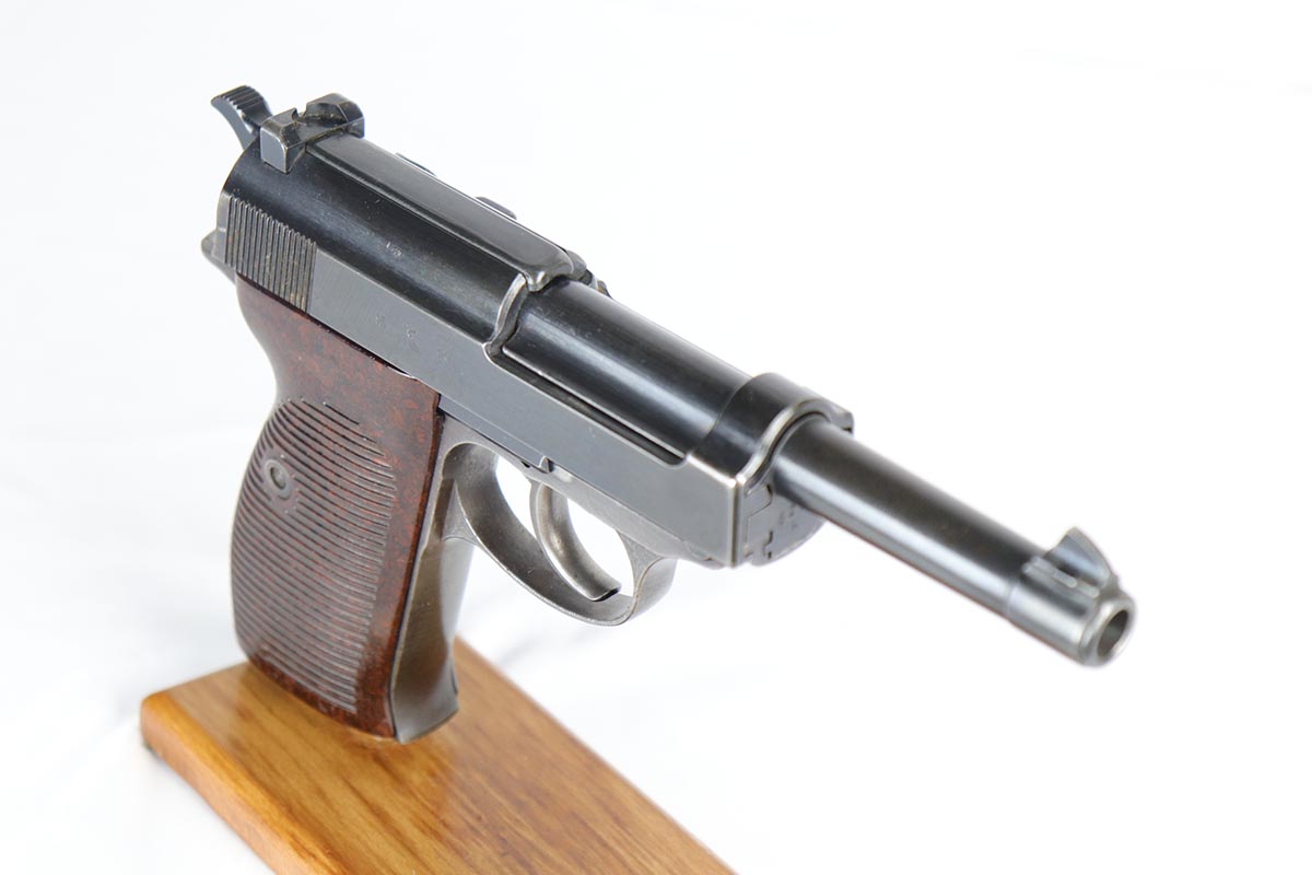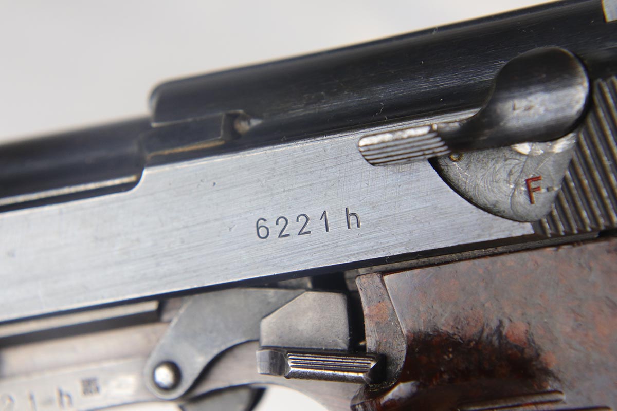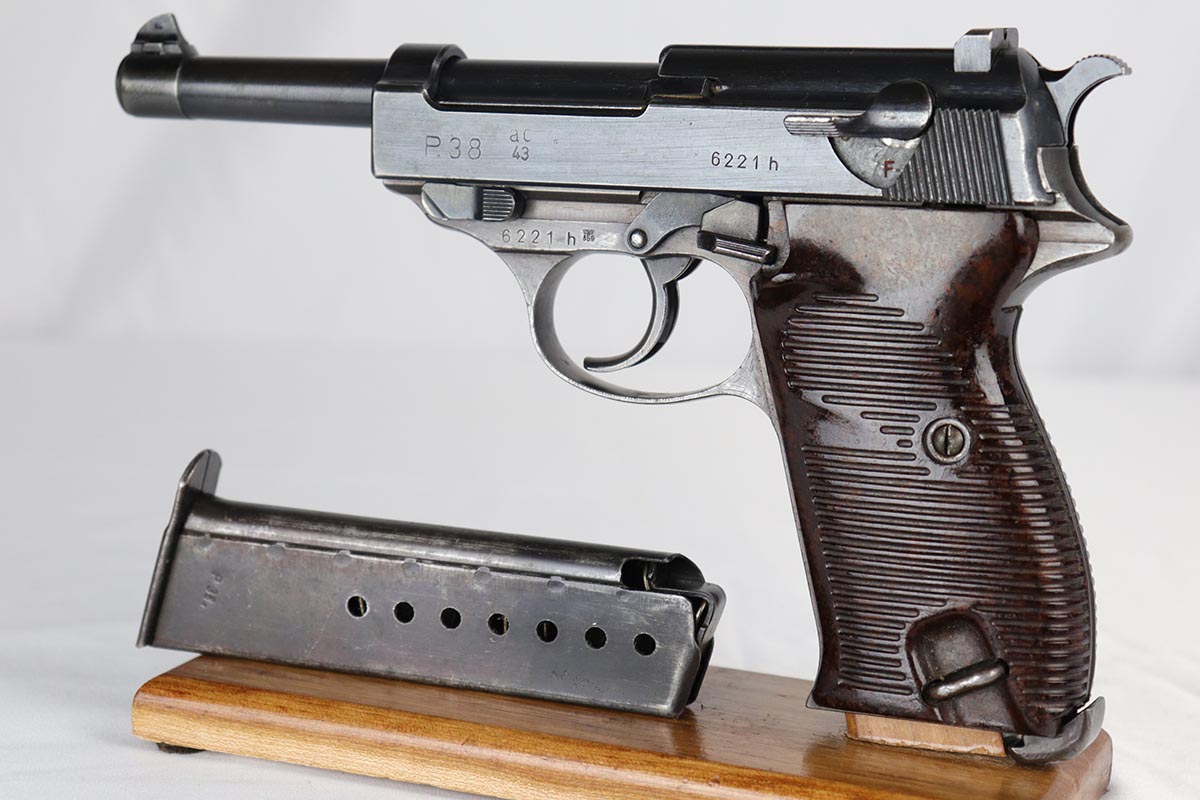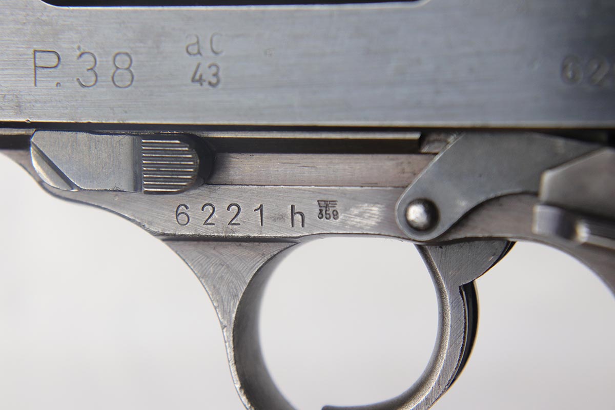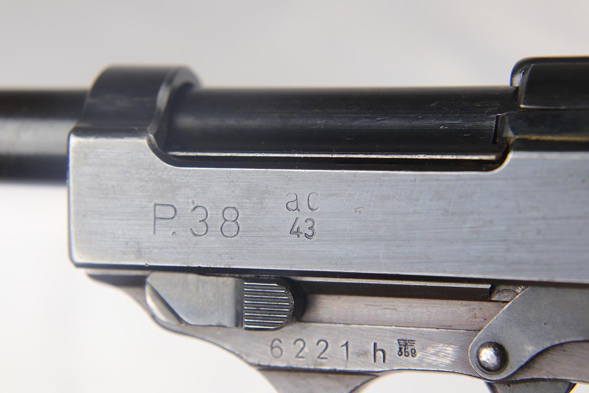 5/2/18 – This is a very nice and honest example of a Walther P.38 from 1943, with all matching parts and ~95% original blue.  There is minor edge and muzzle wear and some thinning to the strap.  Bore is shiny with strong rifling.  Proper mechanics, including de-cocker.  Excellent reddish Walther grips and a Walther made mag.