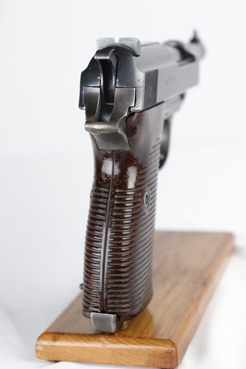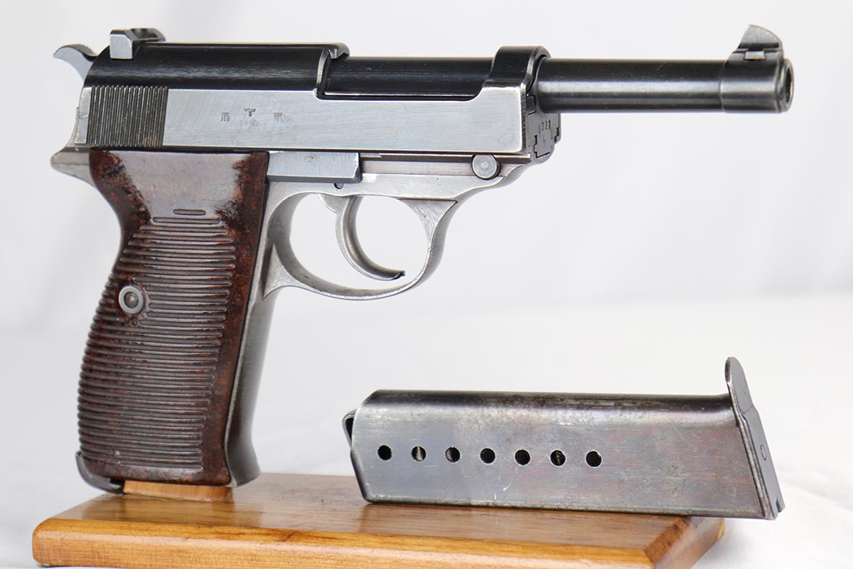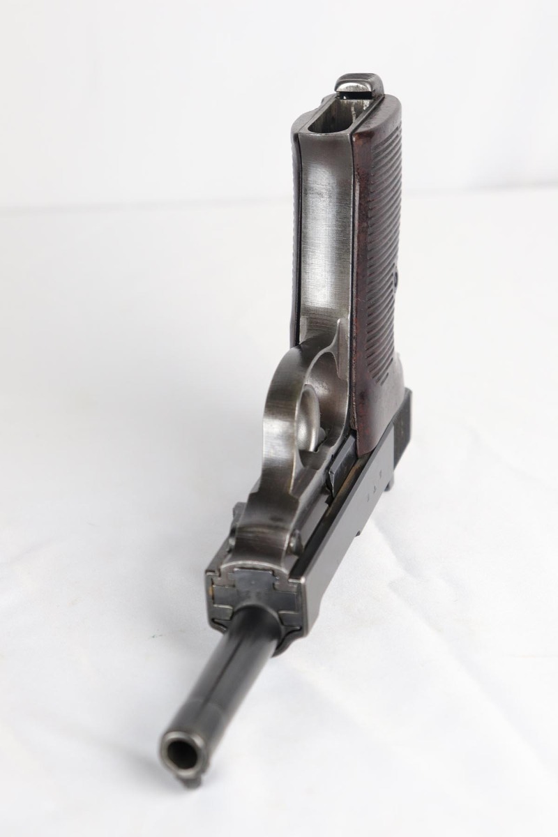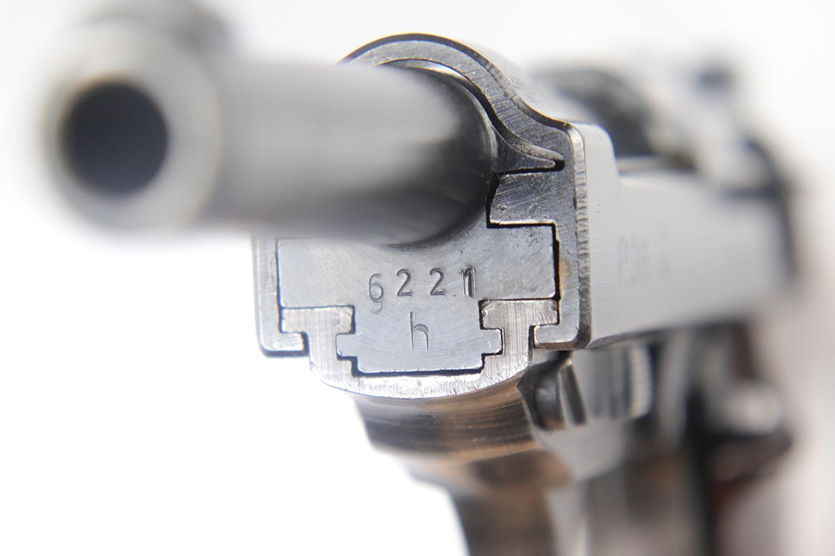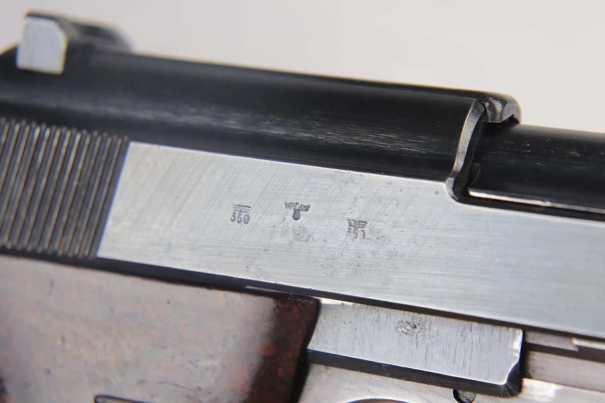 5/2/18 – This is a very nice and honest example of a Walther P.38 from 1943, with all matching parts and ~95% original blue.  There is minor edge and muzzle wear and some thinning to the strap.  Bore is shiny with strong rifling.  Proper mechanics, including de-cocker.  Excellent reddish Walther grips and a Walther made mag.