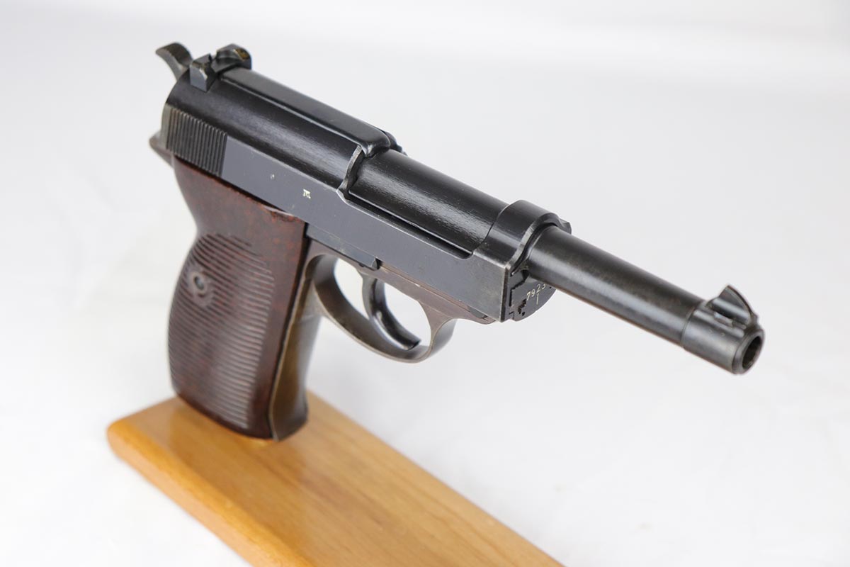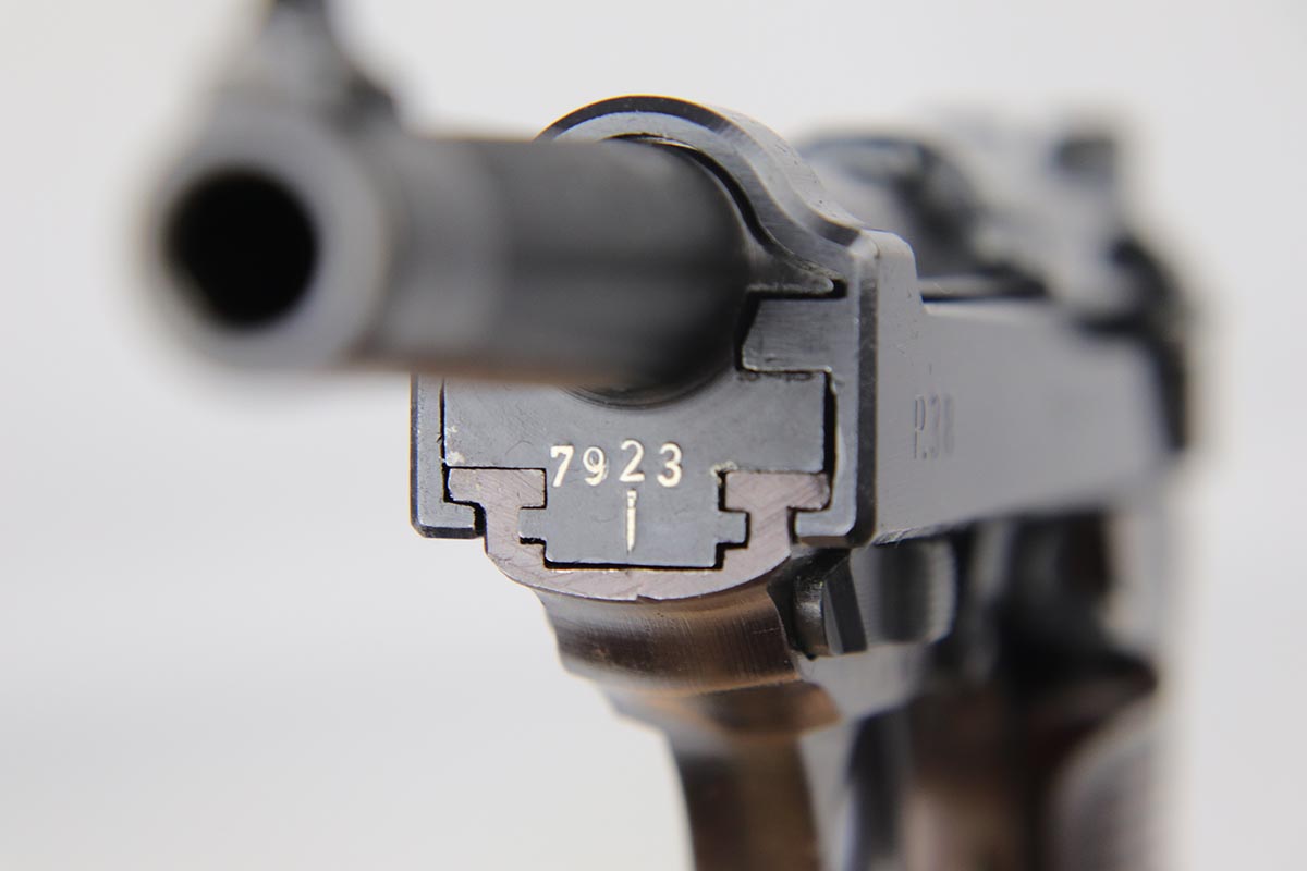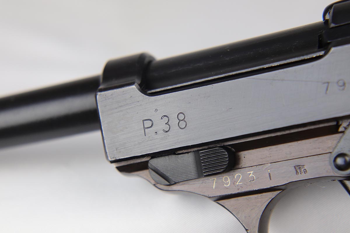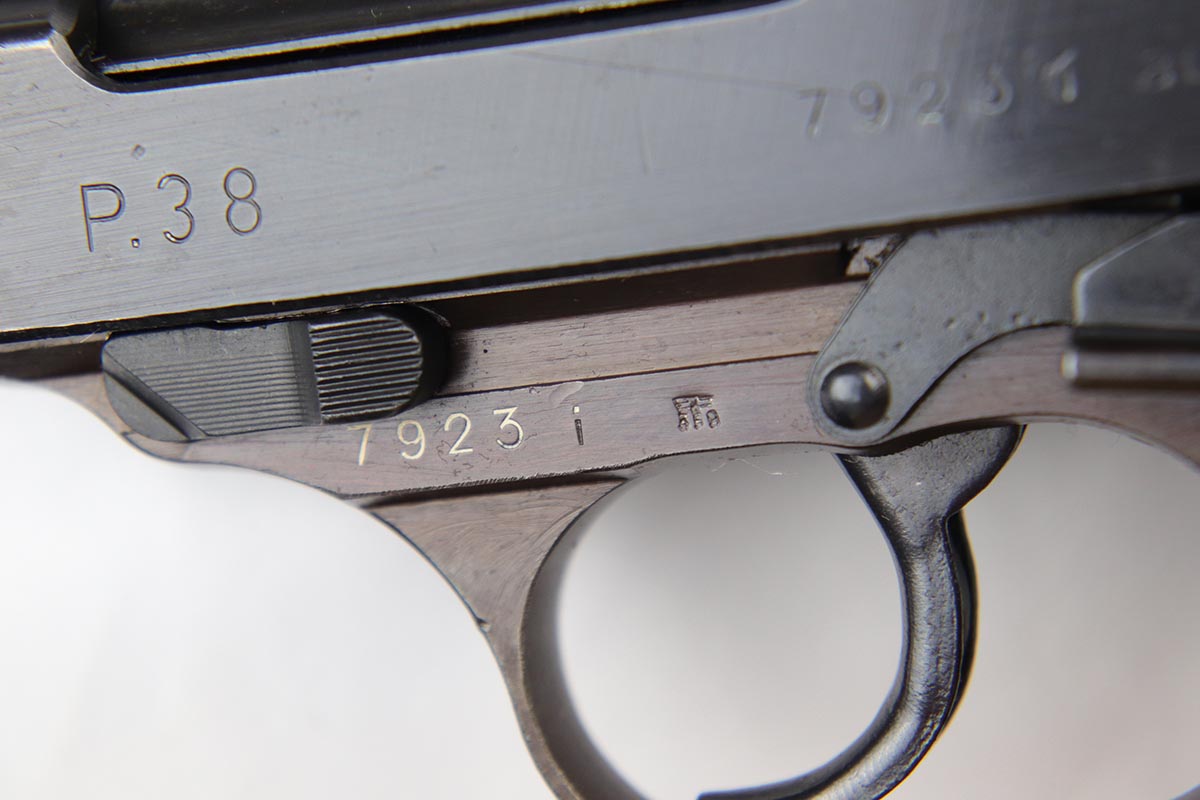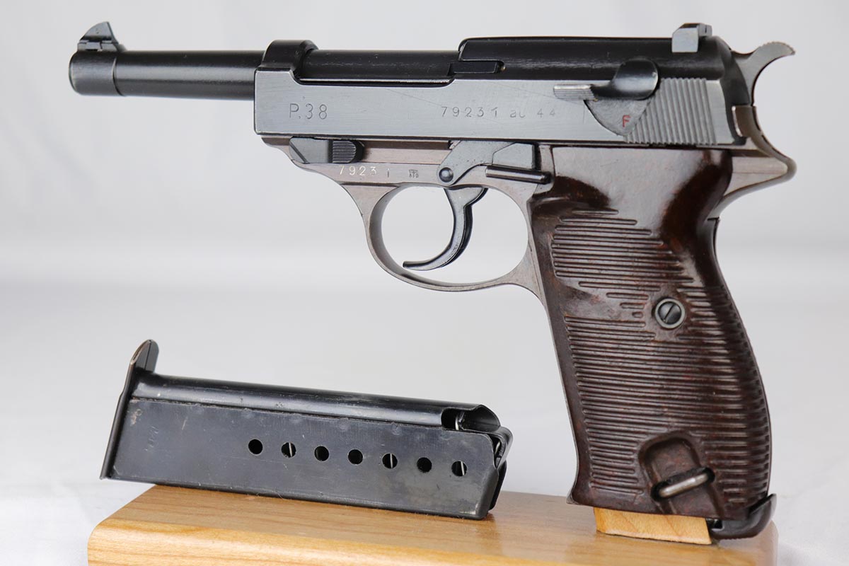 5/18/18 – This is a very nice example of an original and matching Walther P.38, manufactured in 1944. The slide and barrel show a near-mint profile view but there is some thinning to the front strap. The side frame also shows a hint of plum color to the finish. Minty reddish Walther grips and an excellent bore. Walther magazine. Proper mechanics, including de-cocker.