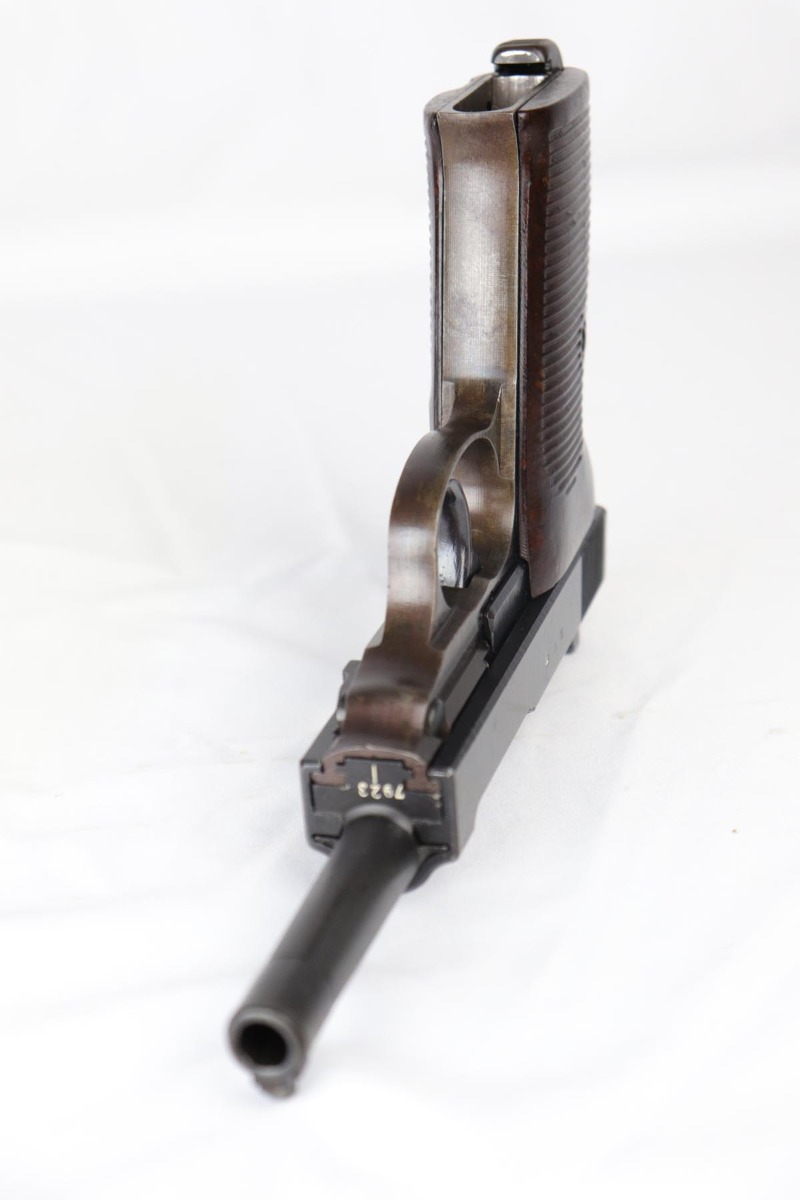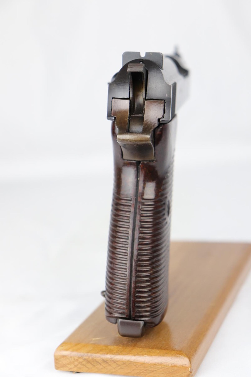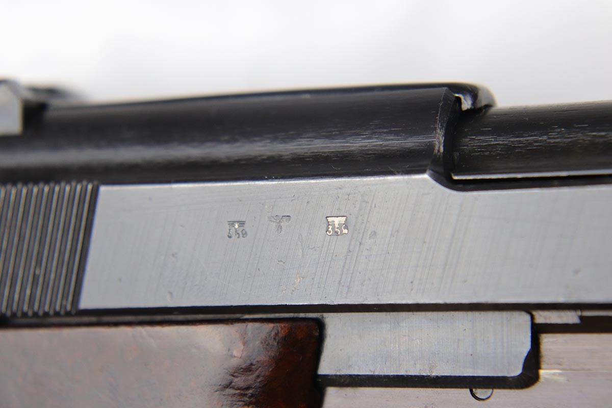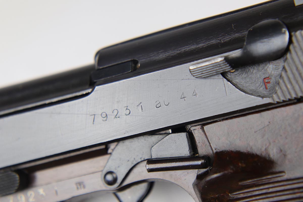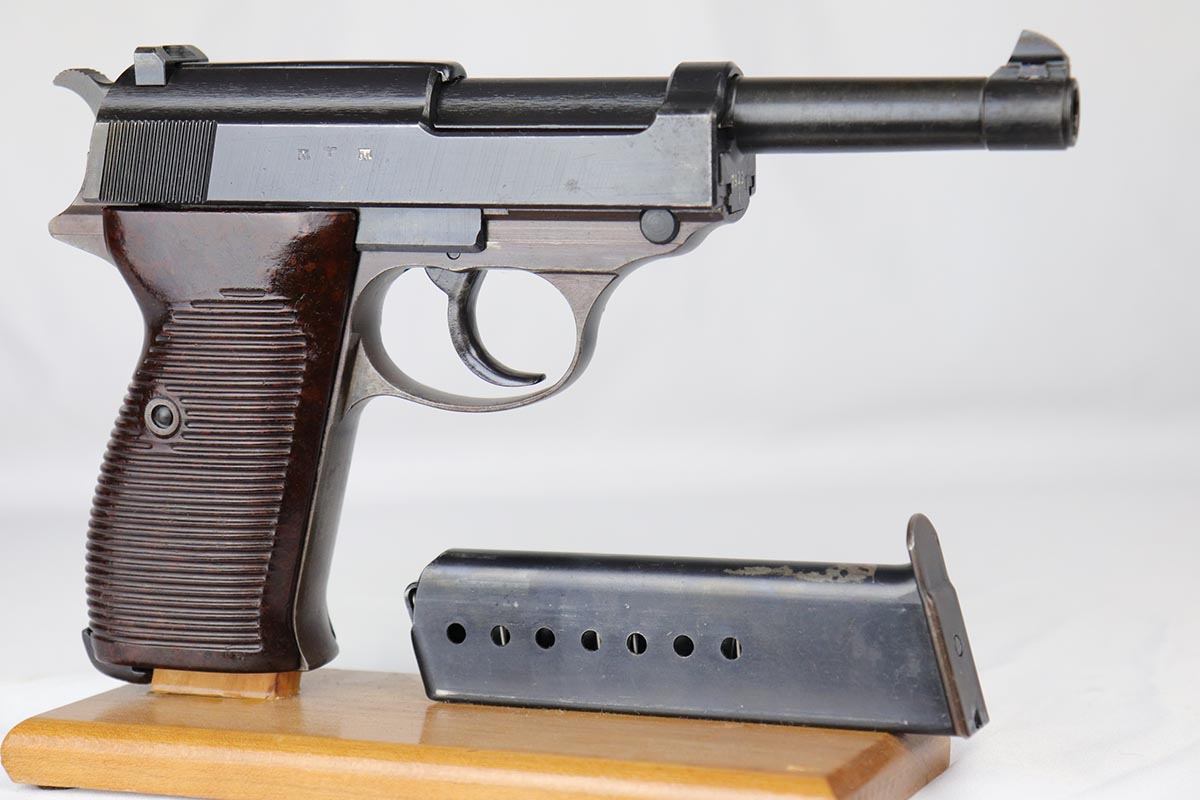 5/18/18 – This is a very nice example of an original and matching Walther P.38, manufactured in 1944. The slide and barrel show a near-mint profile view but there is some thinning to the front strap. The side frame also shows a hint of plum color to the finish. Minty reddish Walther grips and an excellent bore. Walther magazine. Proper mechanics, including de-cocker.