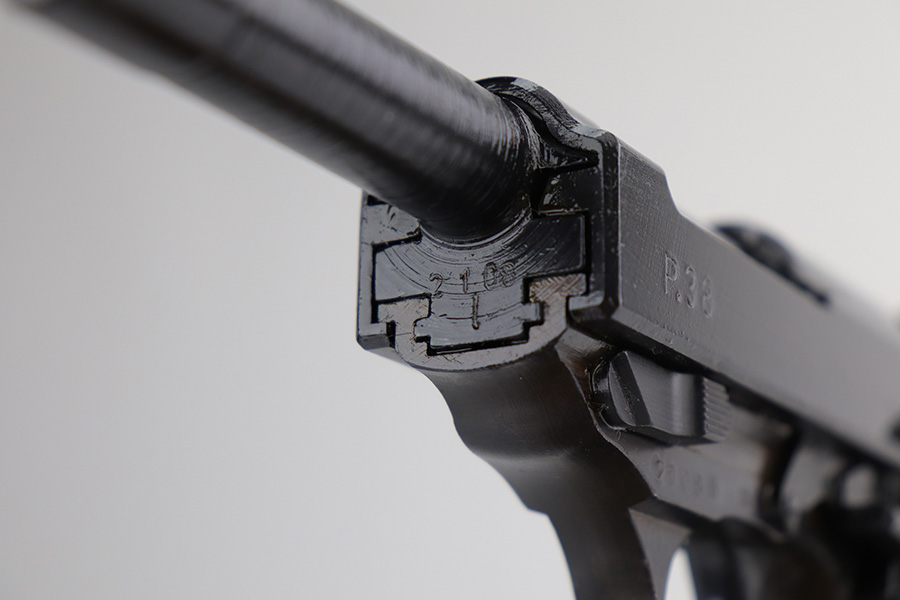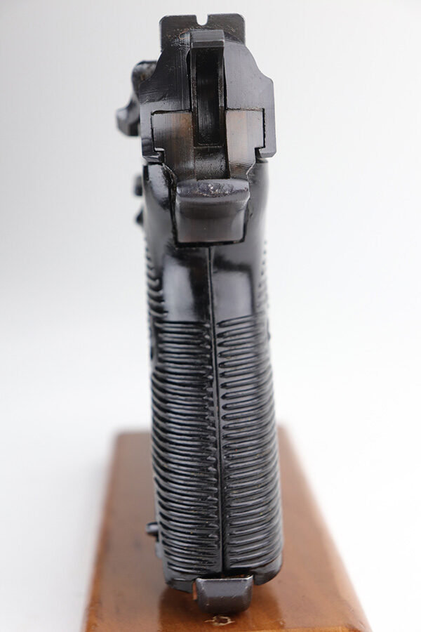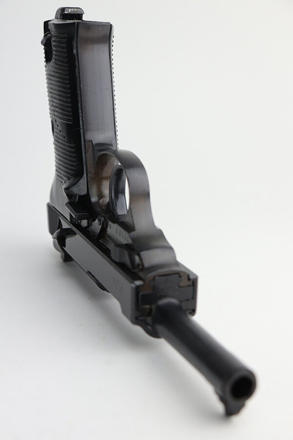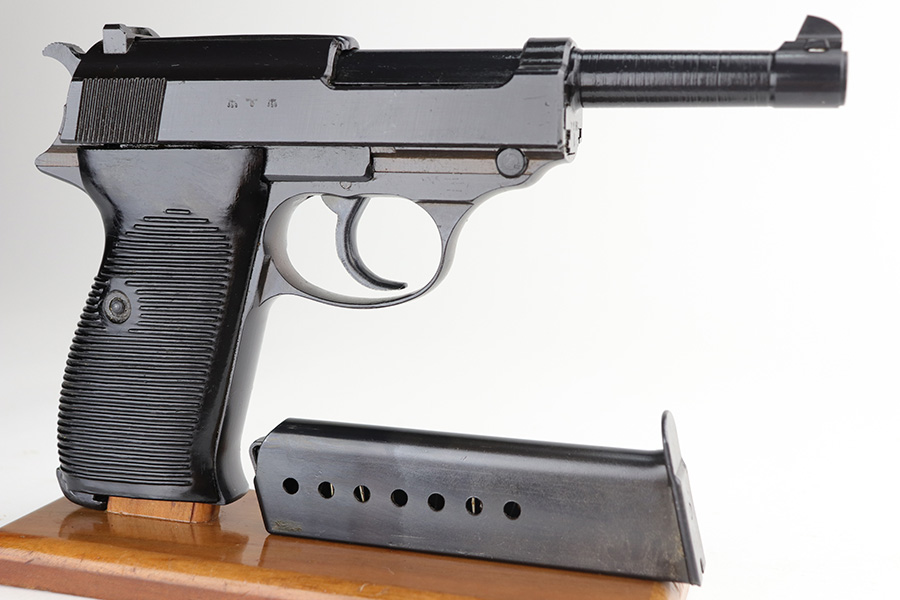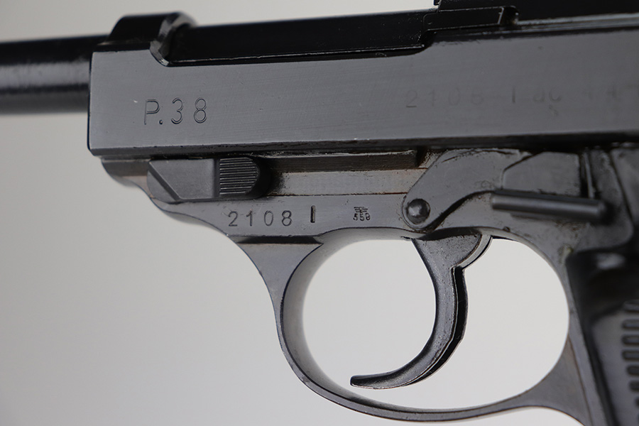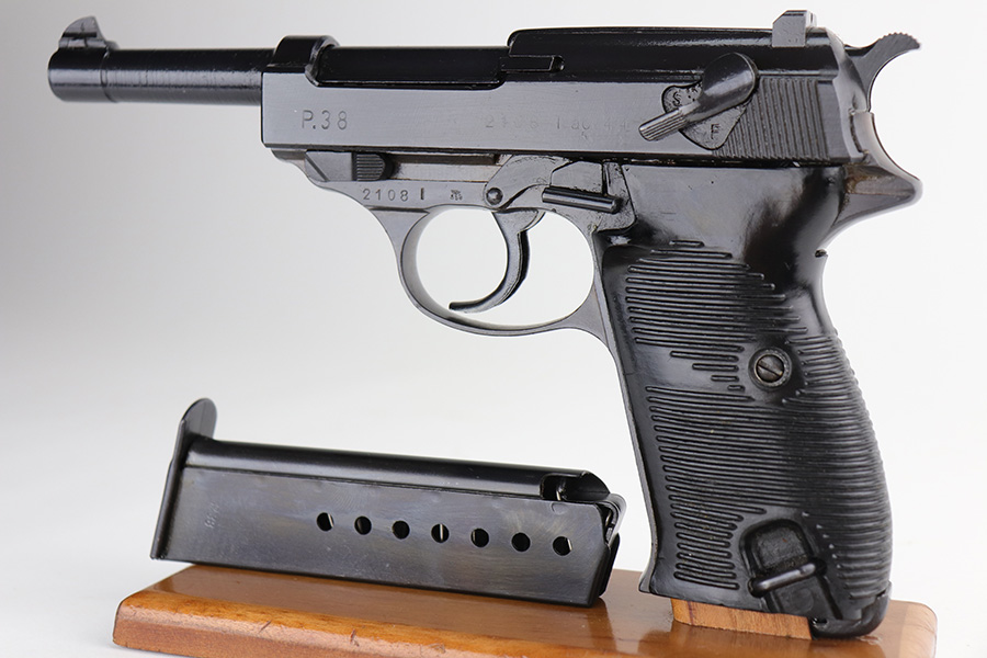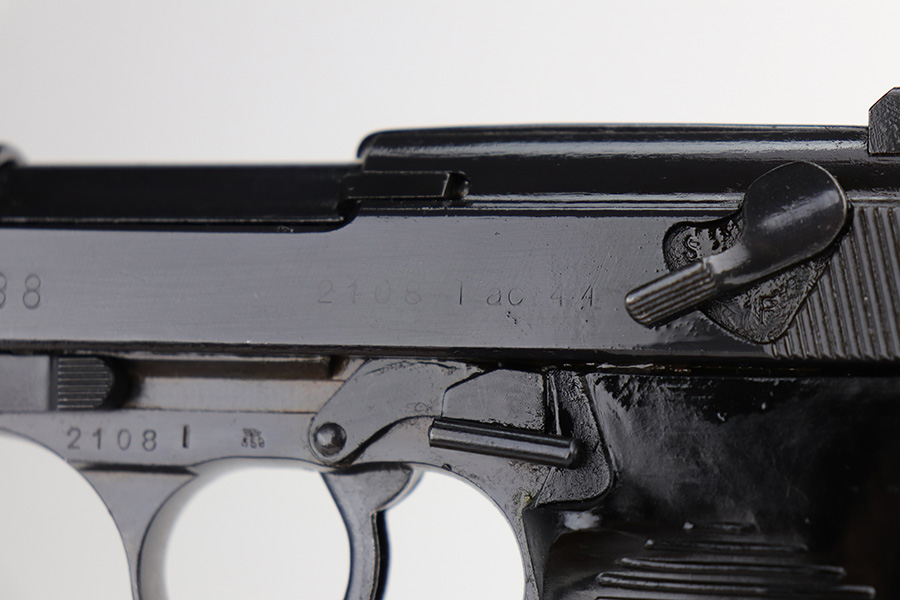 8/18/21 – This is an excellent example of a Walther P.38 issued to the Nazi military in 1944. It is all matching and has the proper “Eagle 359” military proofs. Comes with excellent grips and a proper Walther magazine. It has an FNH barrel. The gun has a dark finish, and we believe it has been “Russian Dipped”. In any case, it has retained virtually all of its finish. The bore is shiny with strong rifling with minor freckling in the grooves. De-cocker is functional.