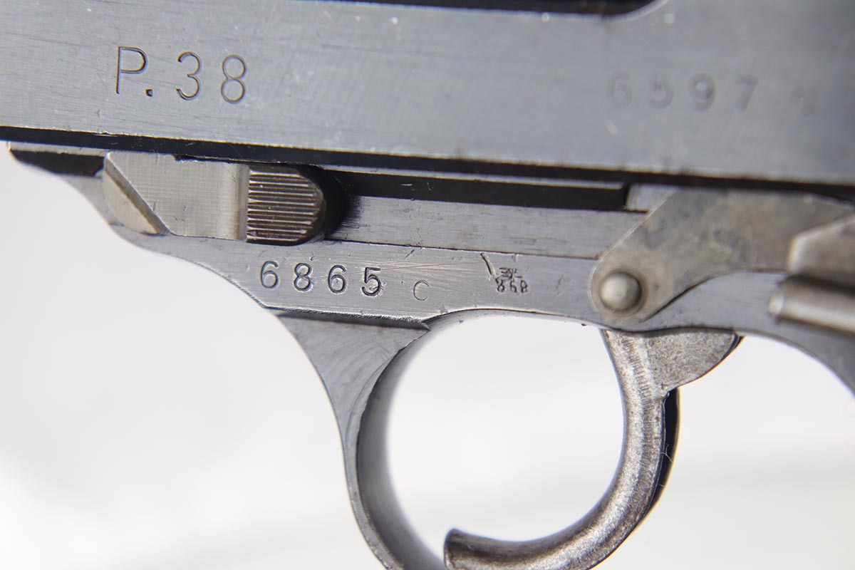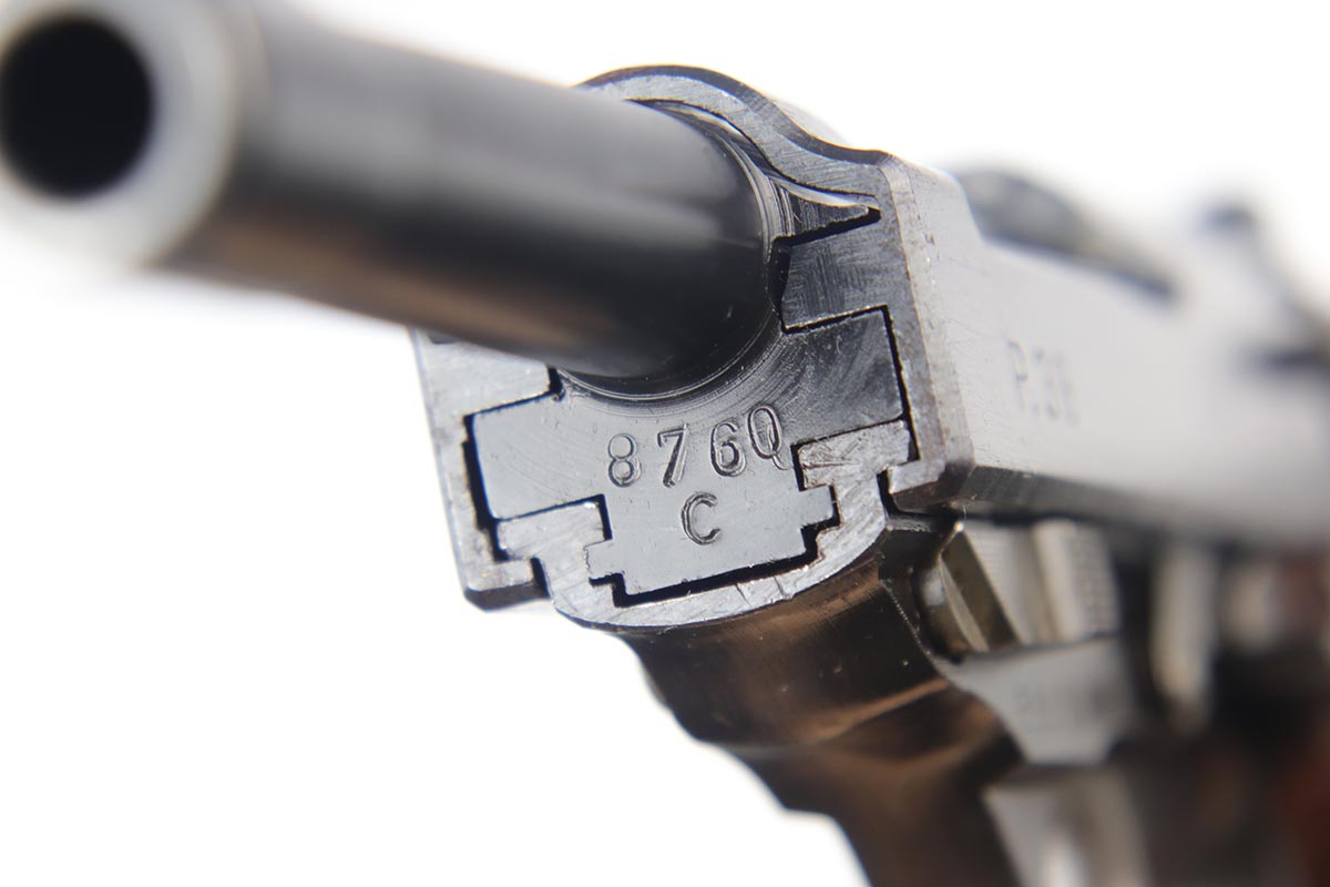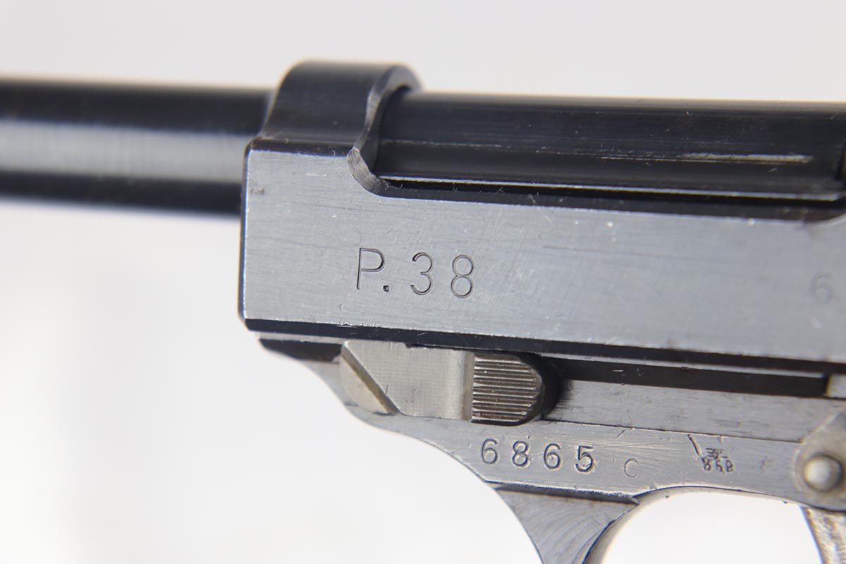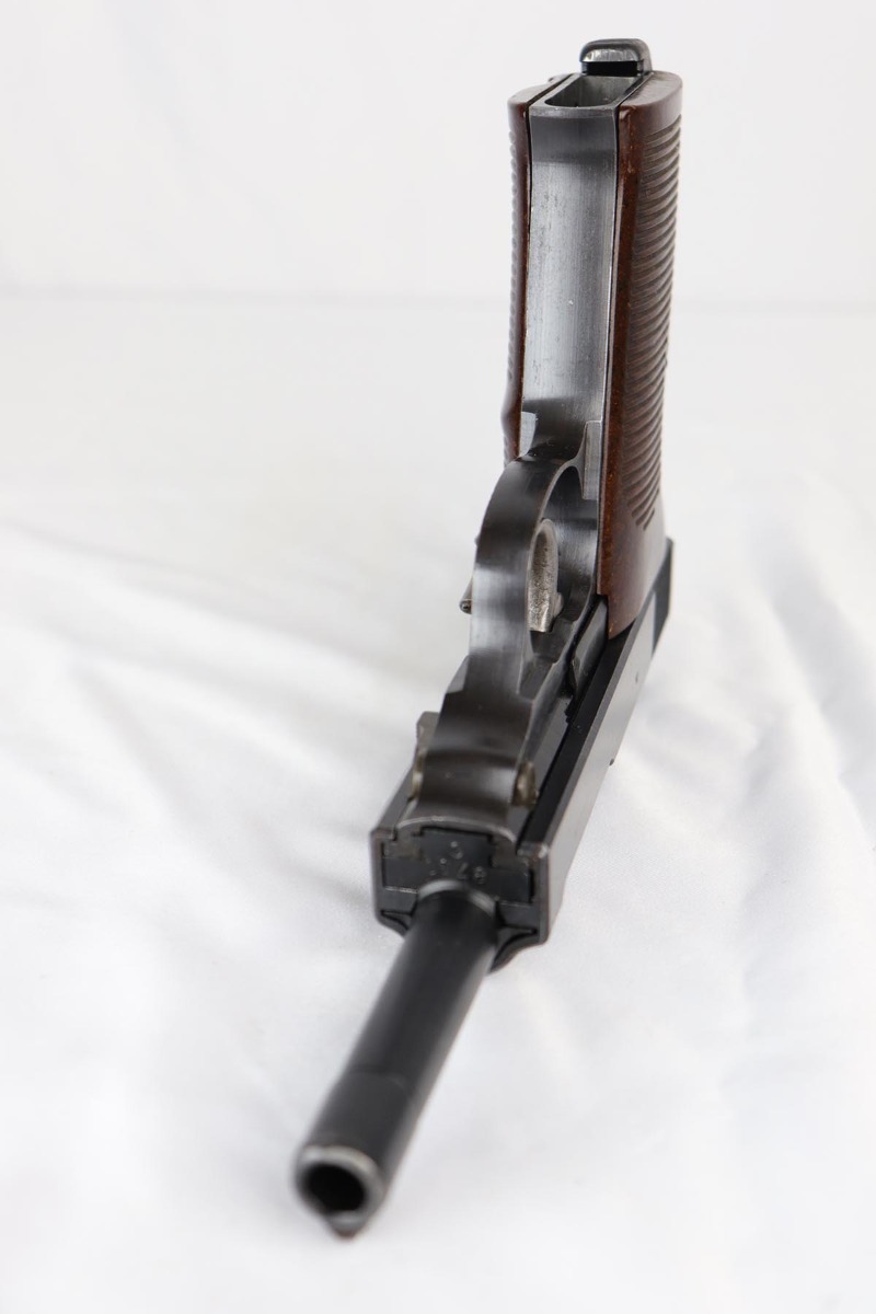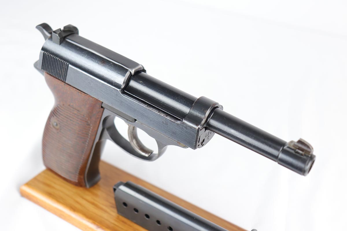 10/3/18 – This is a very nice example of an end-of-war Walther P.38, made in May of 1945. This is a known mismatched variation, as all Walther P.38s this late were. It also has only one acceptance proof on the right side slide. The bluing overall is excellent and original, with little wear aside from some thinning of the top plate. Most of the small parts are phosphated. Fantastic red grips and minty bore. Walther magazine.