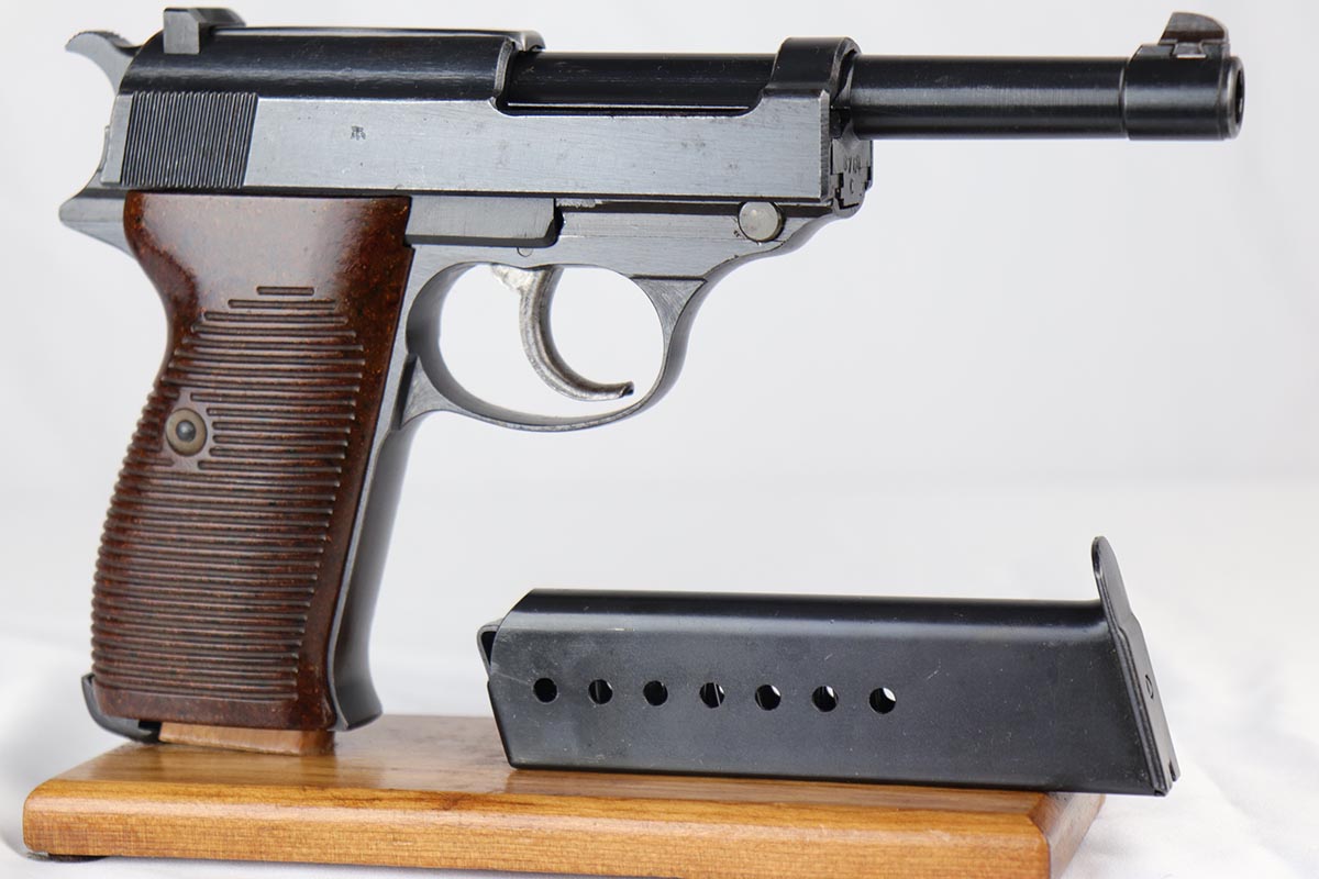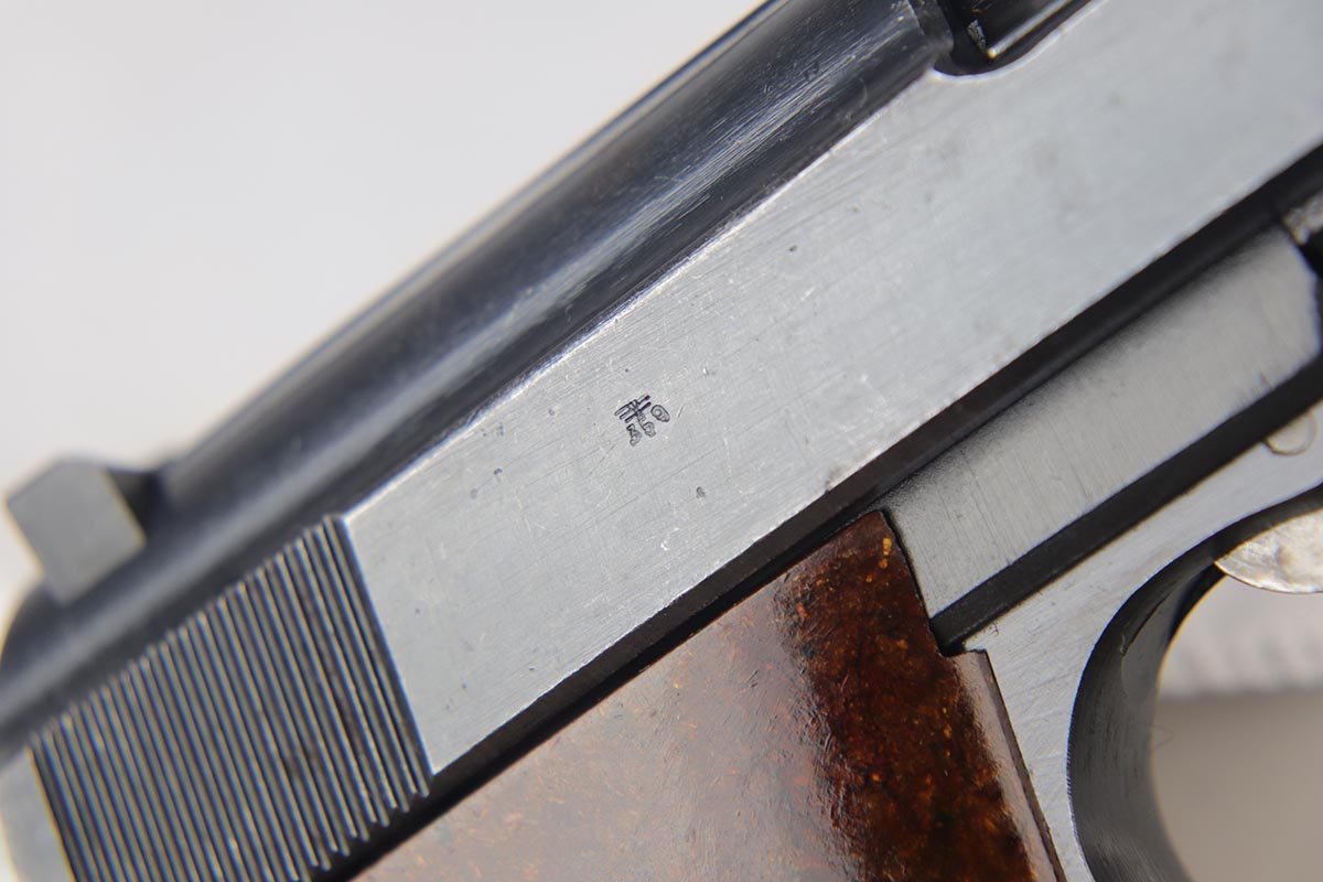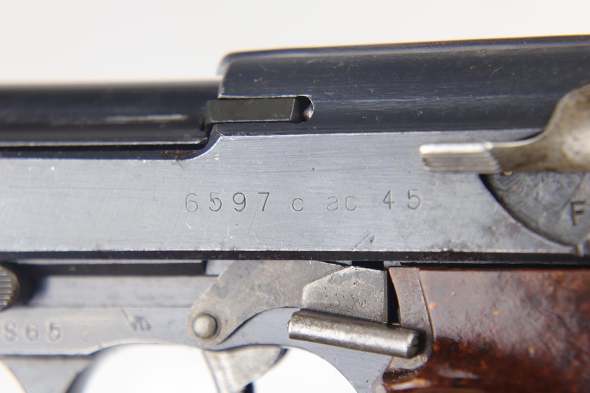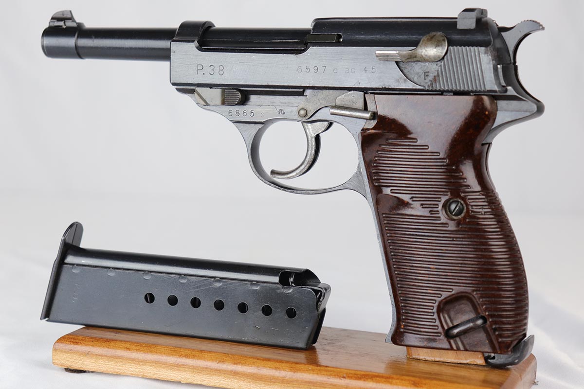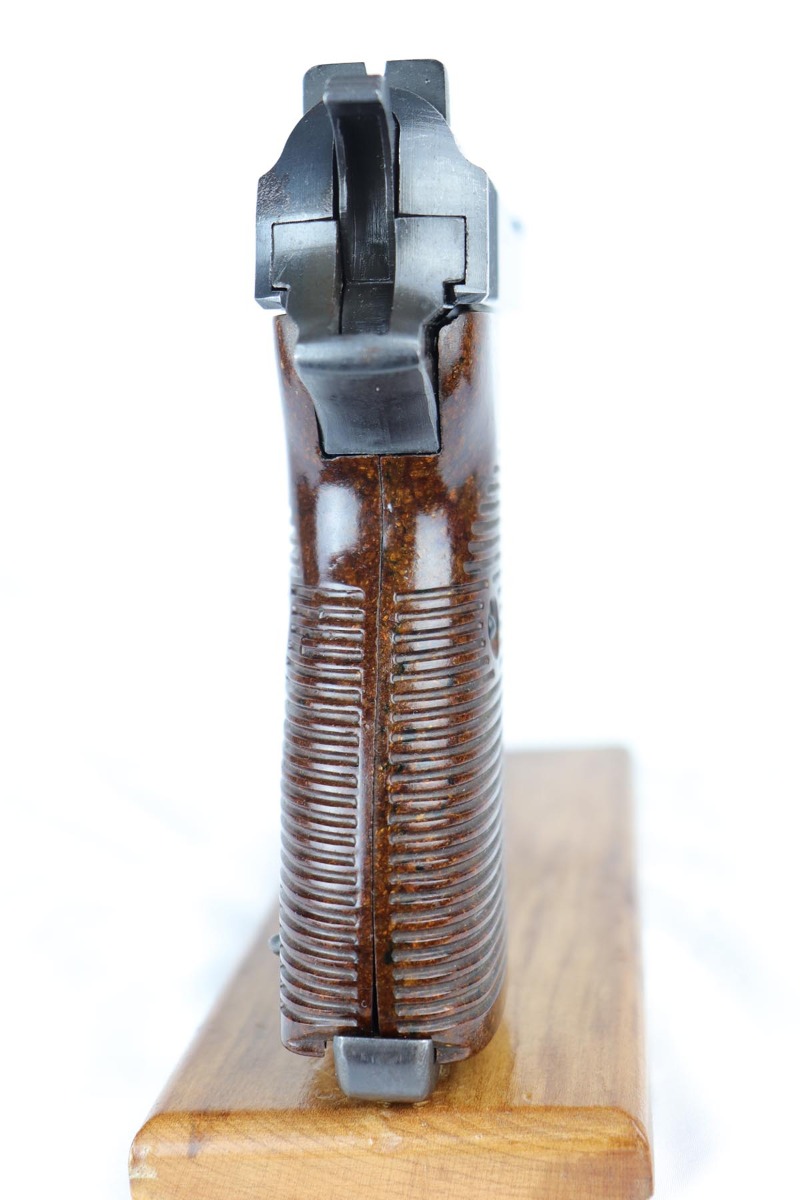 10/3/18 – This is a very nice example of an end-of-war Walther P.38, made in May of 1945. This is a known mismatched variation, as all Walther P.38s this late were. It also has only one acceptance proof on the right side slide. The bluing overall is excellent and original, with little wear aside from some thinning of the top plate. Most of the small parts are phosphated. Fantastic red grips and minty bore. Walther magazine.