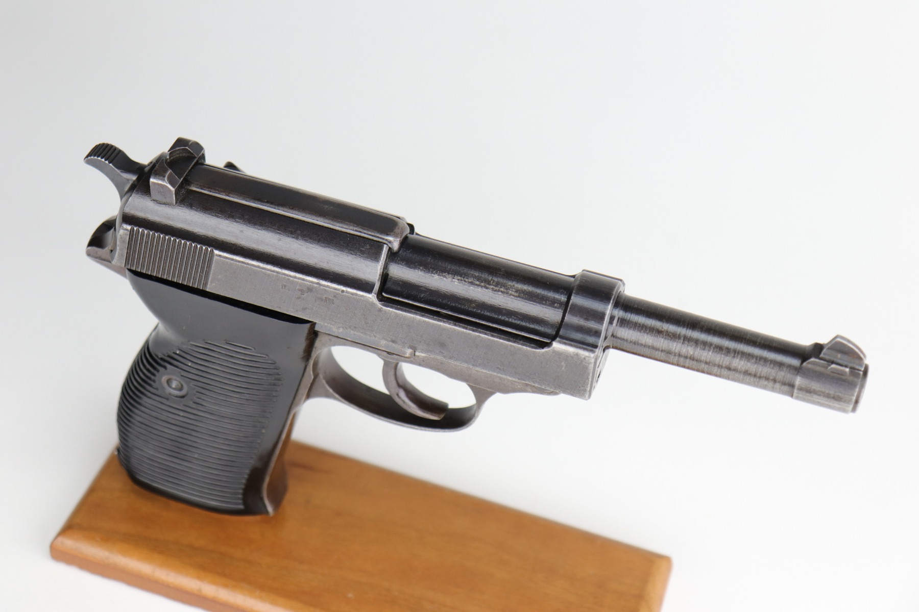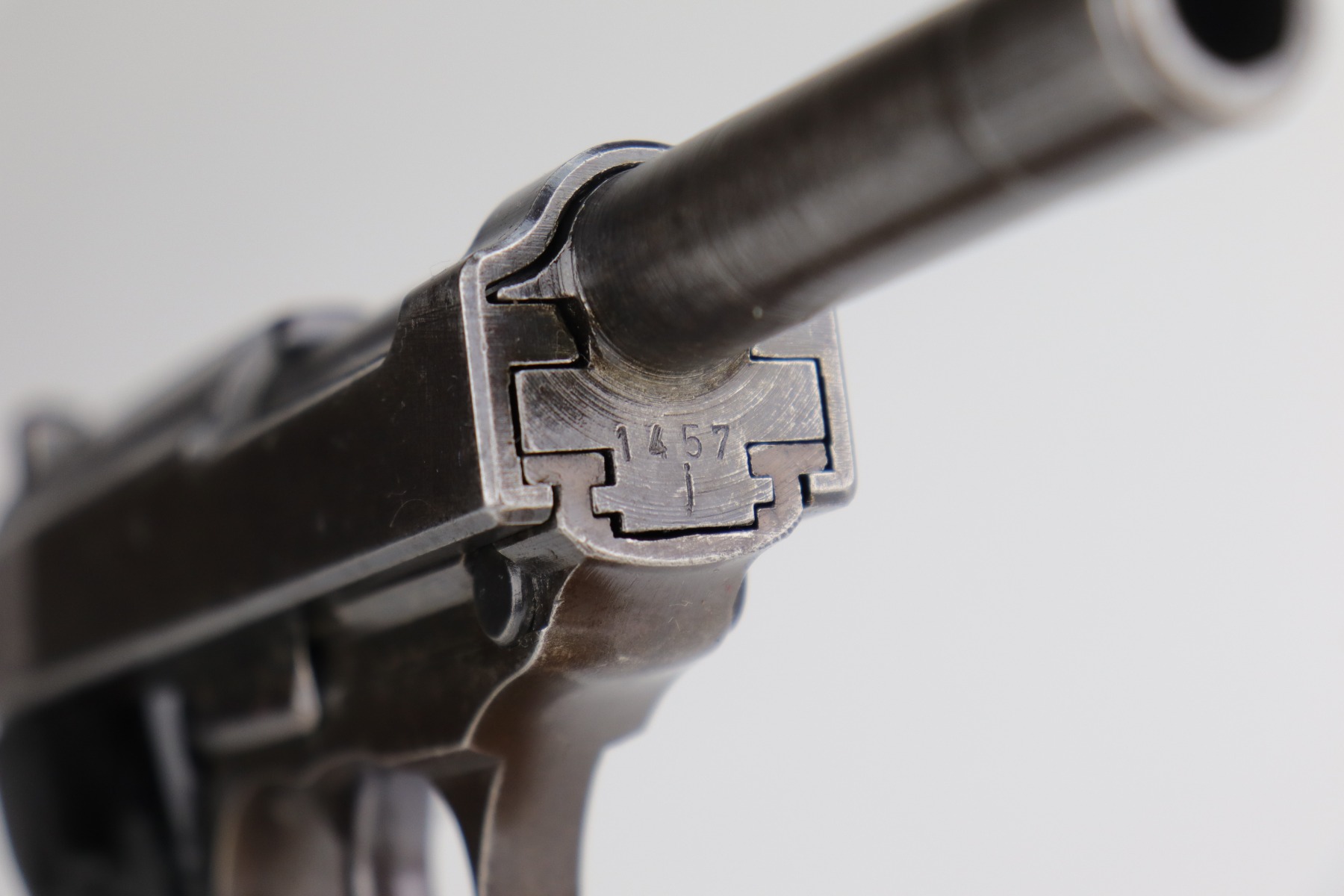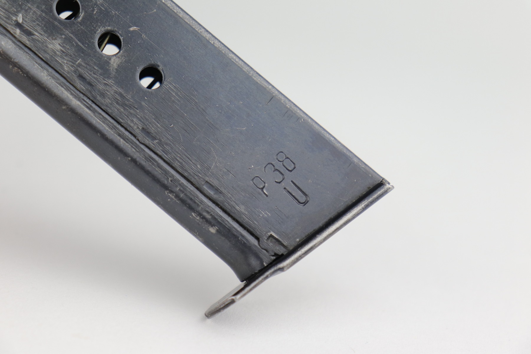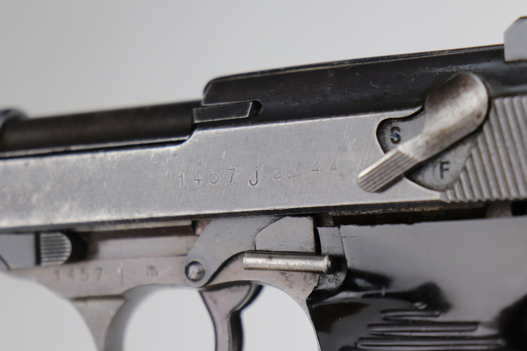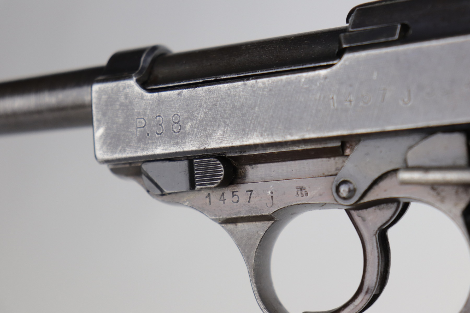 11/11/20 – This is an original Walther P.38 Rig issued to the Nazi military in 1944. It is all matching and has the proper “Eagle 359” Nazi military acceptance proofs. The rig comes with a period “P.38 U” magazine and a very nice 1944-dated softshell holster. The gun is fully functional, including the de-cocker. It has retained the slight majority of its finish, about 65%. There is thinning throughout and wear along most of the high edges. There is patina and spotty oxidation throughout. There are areas of freckling throughout, most noticeable on the right side of the gun and on the front strap. It comes with excellent grips. The bore has strong rifling, but there are areas of light freckling in the grooves.