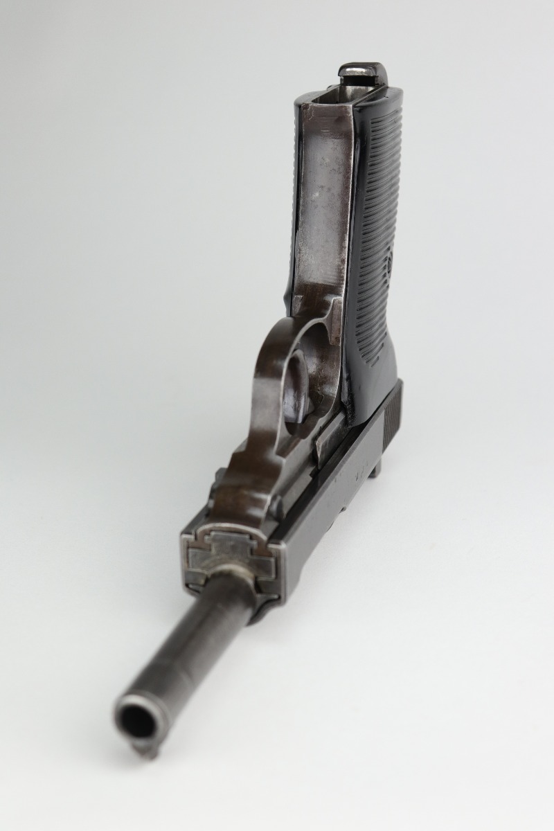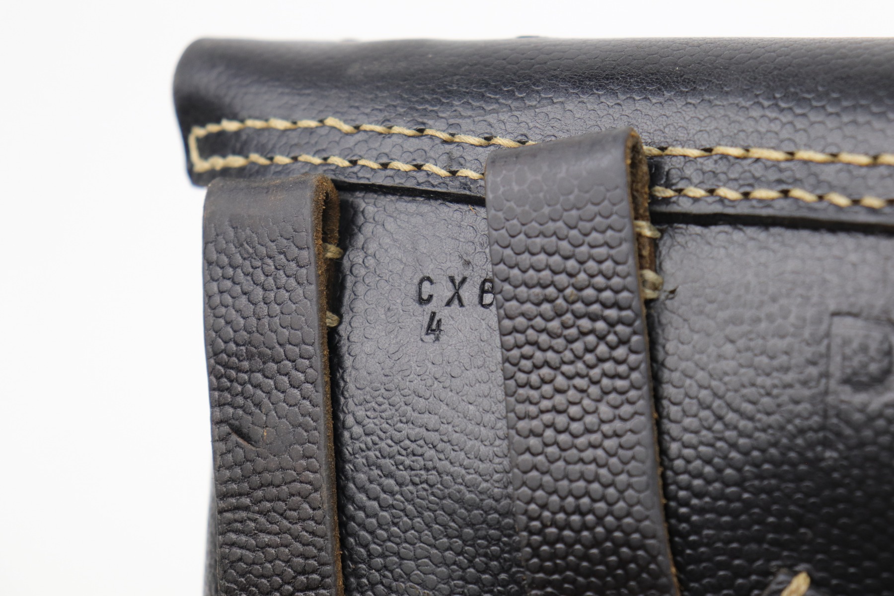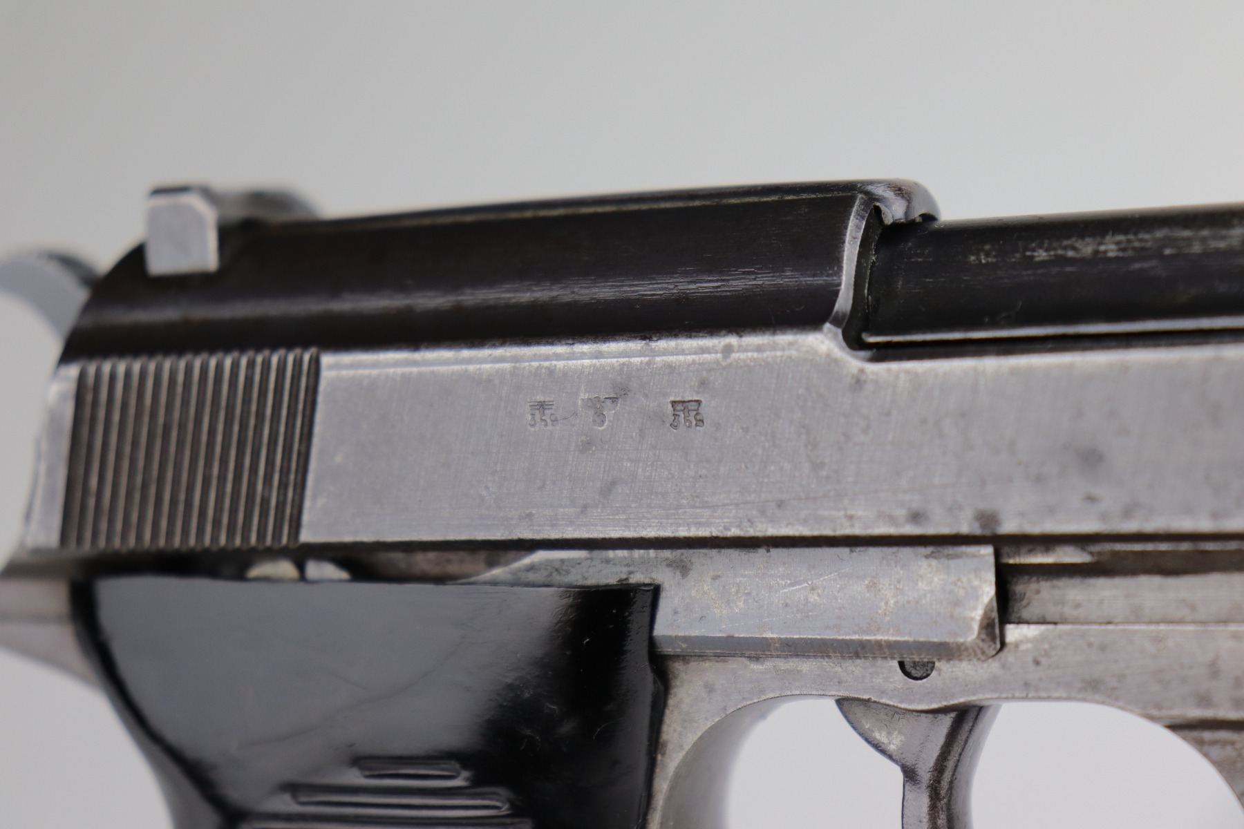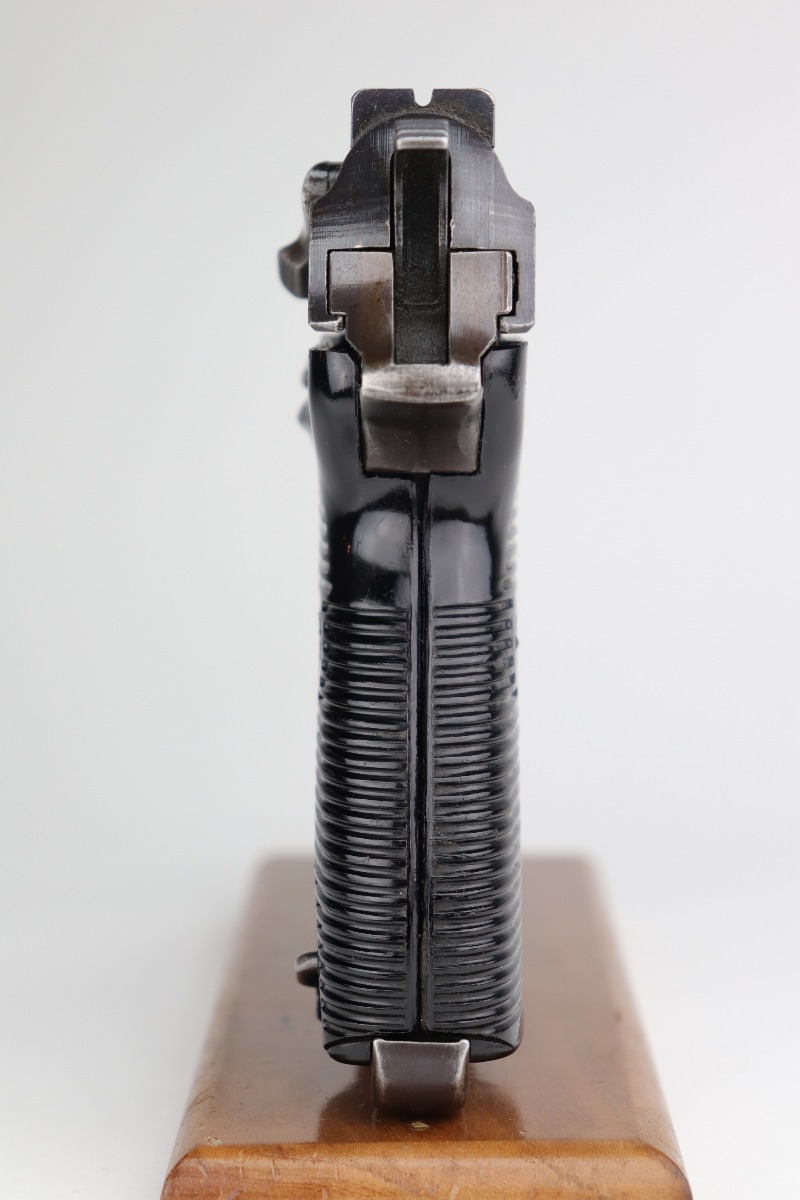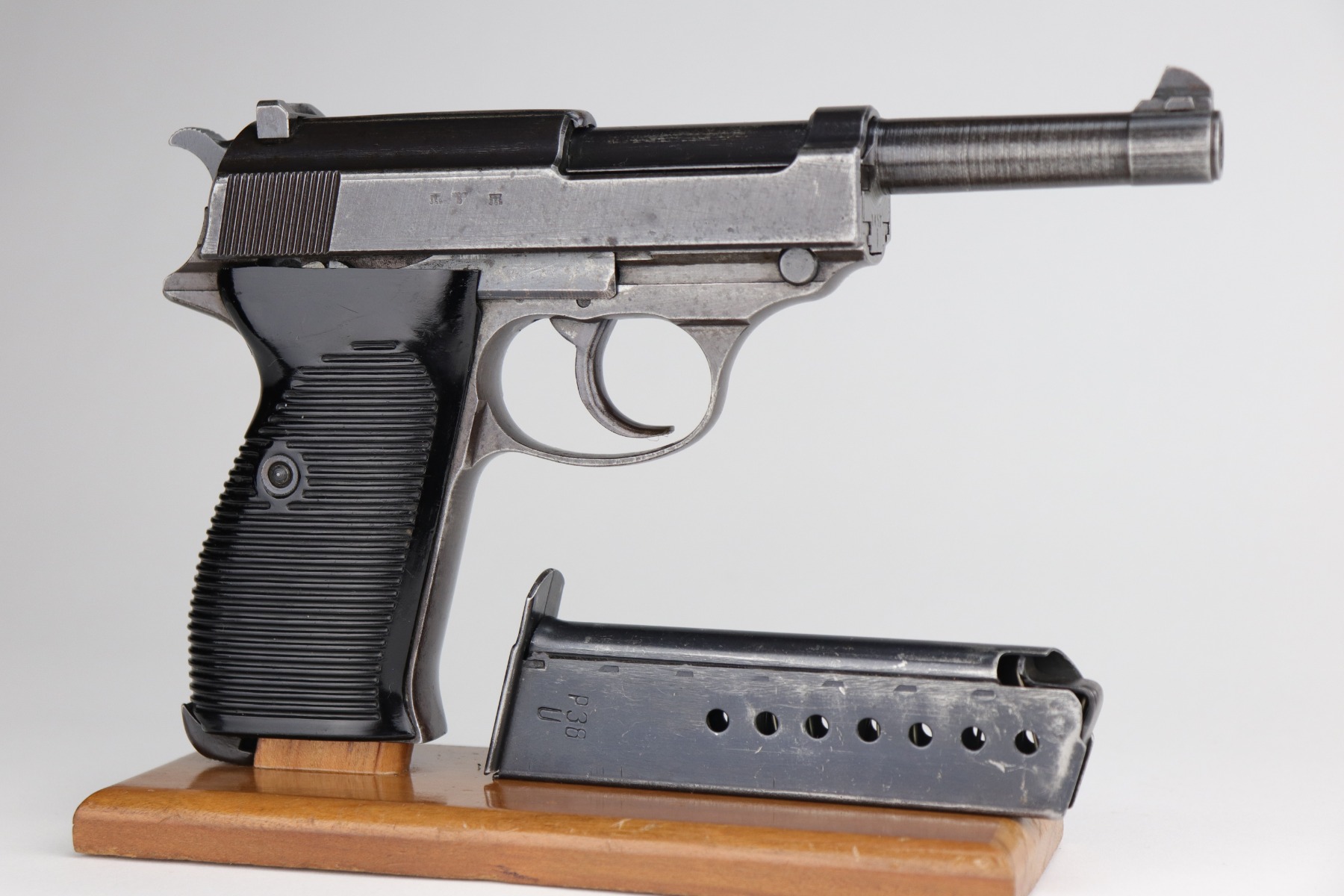 11/11/20 – This is an original Walther P.38 Rig issued to the Nazi military in 1944. It is all matching and has the proper “Eagle 359” Nazi military acceptance proofs. The rig comes with a period “P.38 U” magazine and a very nice 1944-dated softshell holster. The gun is fully functional, including the de-cocker. It has retained the slight majority of its finish, about 65%. There is thinning throughout and wear along most of the high edges. There is patina and spotty oxidation throughout. There are areas of freckling throughout, most noticeable on the right side of the gun and on the front strap. It comes with excellent grips. The bore has strong rifling, but there are areas of light freckling in the grooves.