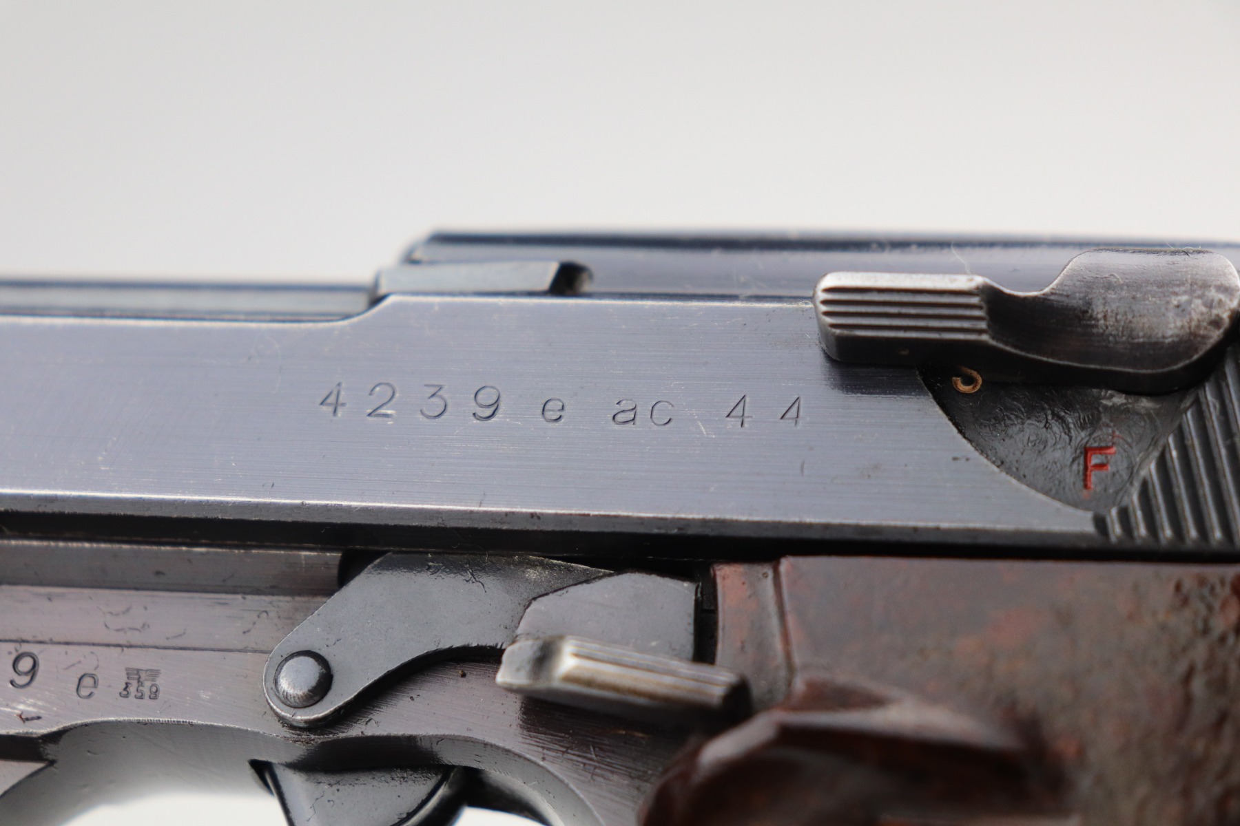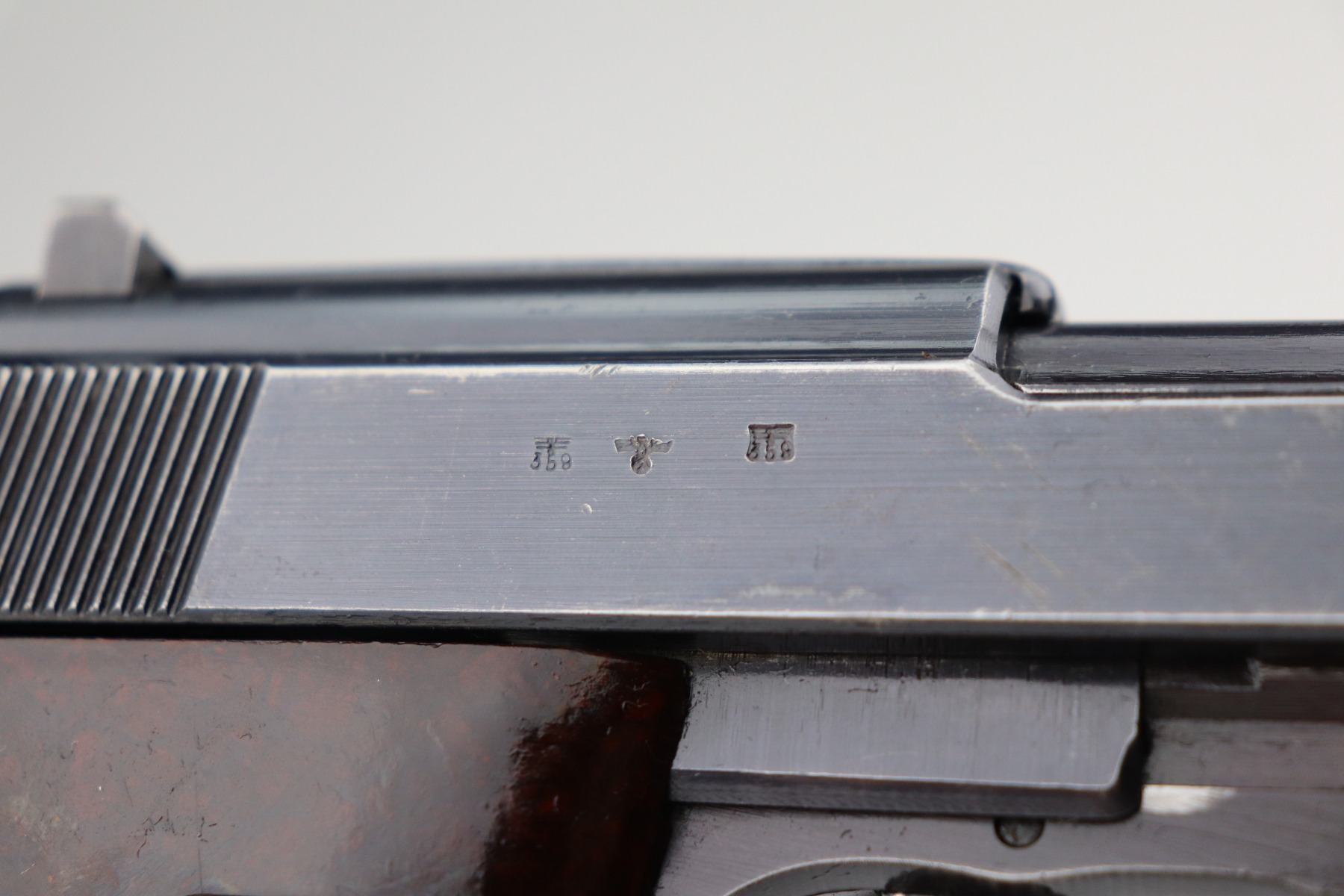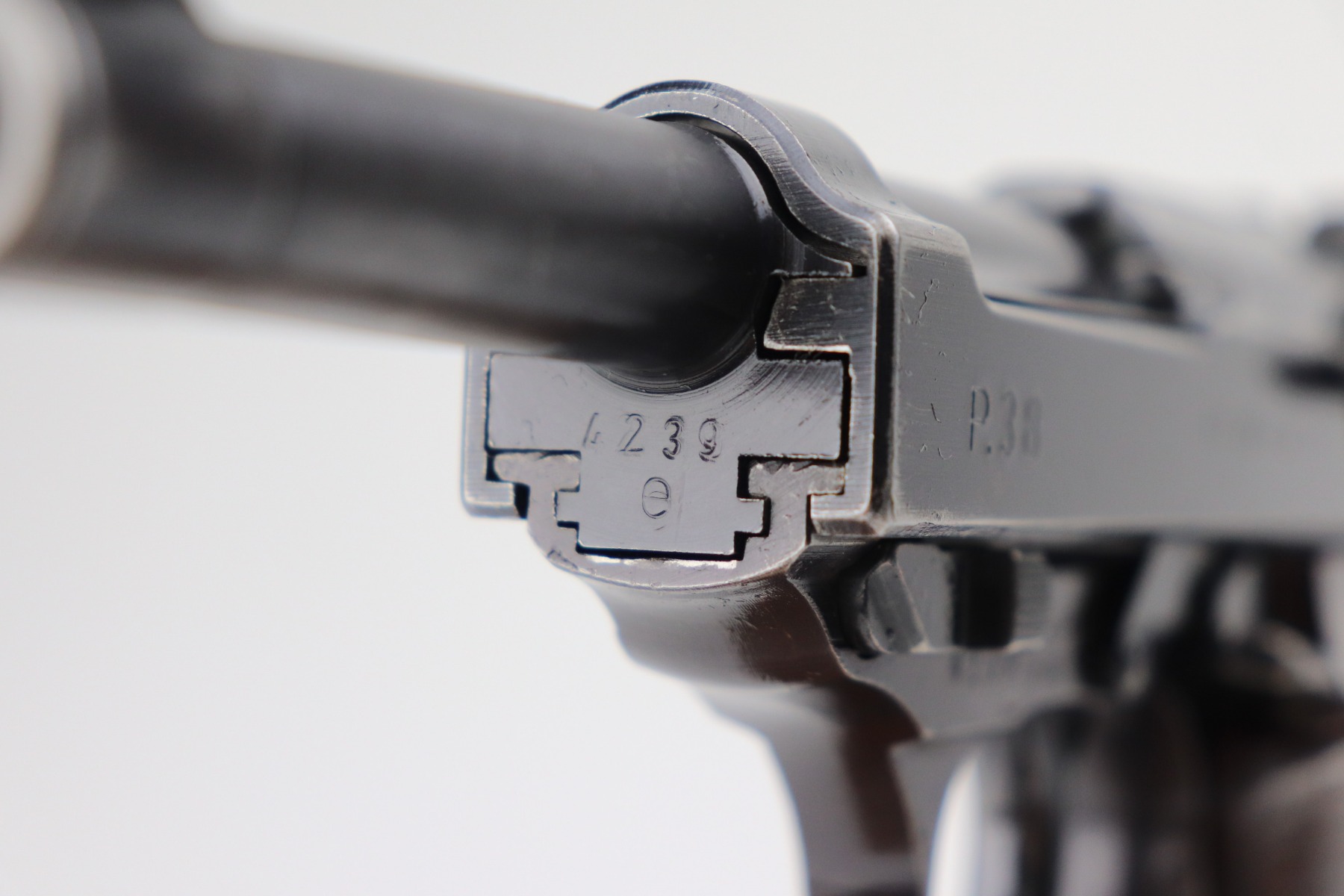 2/9/21 – This is a very nice example of a Walther P.38 Rig issued to the Nazi military in 1944. The gun is all matching and comes with a 1943-dated holster and two period-correct magazines. It is properly “Eagle 359” military proofed and has retained about 93-94% of its original finish. There is minor wear around the muzzle and on the high edges of the slide. Thinning and patina on the front strap. Some light scratching on the right side of the slide. It comes with excellent Walther grips. De-cocker is functional. The bore is minty – shiny with strong rifling. The inside strap of the holster looks replaced.