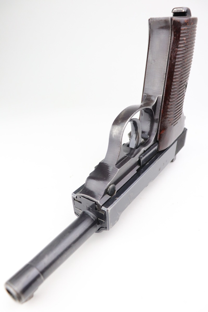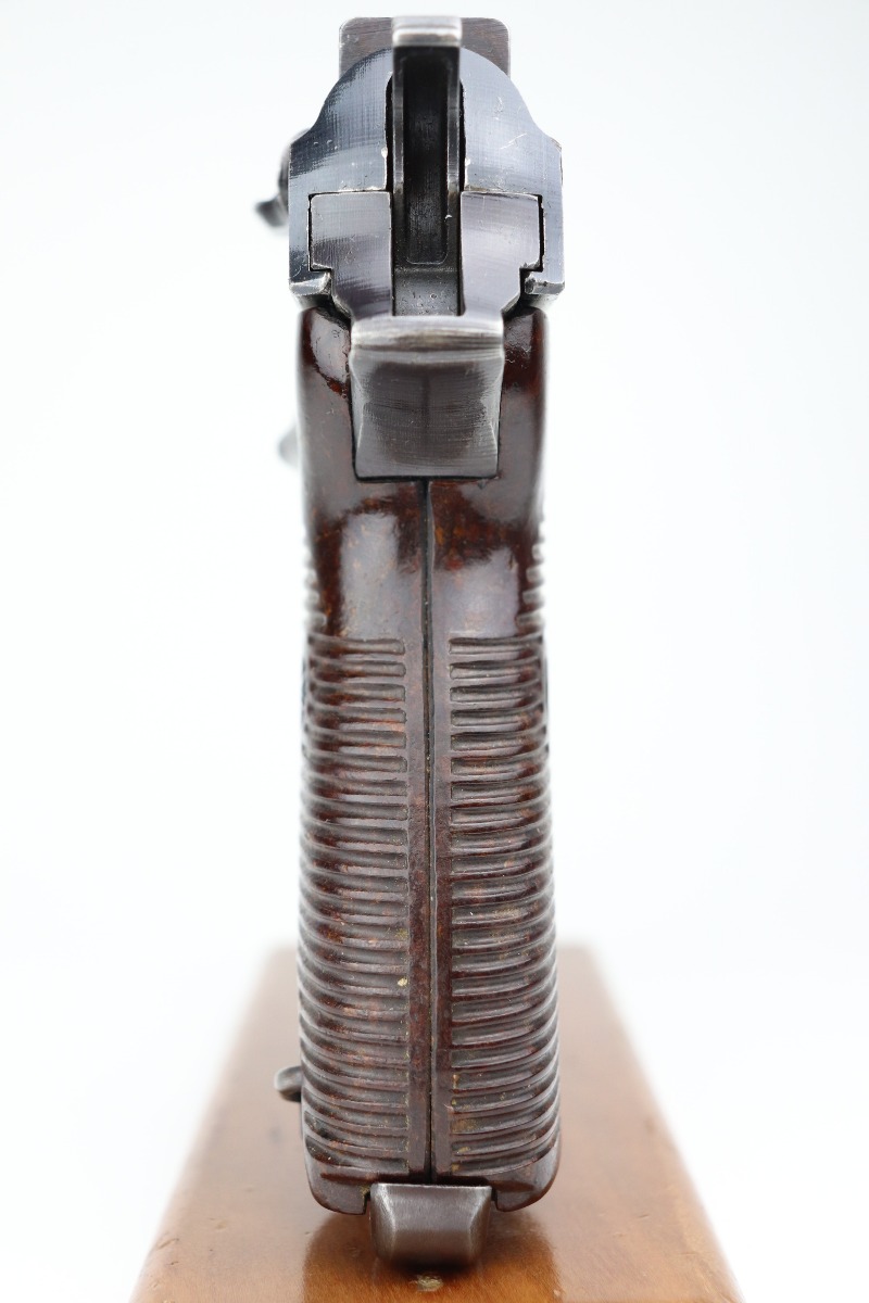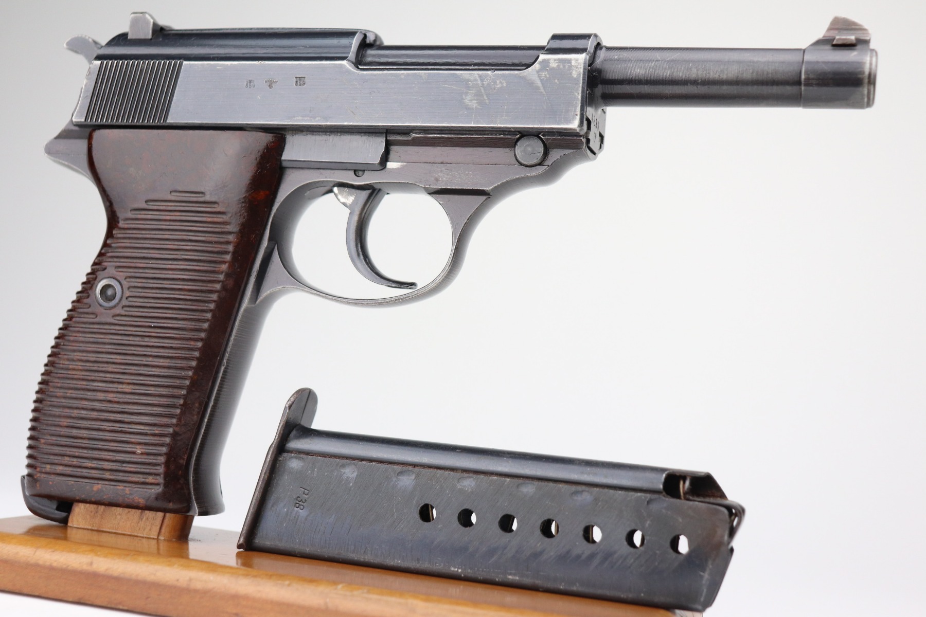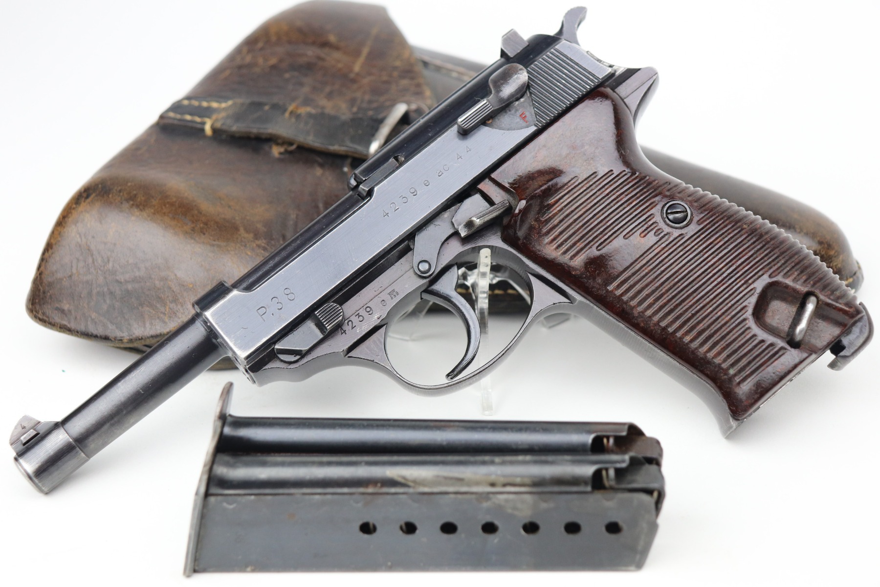 2/9/21 – This is a very nice example of a Walther P.38 Rig issued to the Nazi military in 1944. The gun is all matching and comes with a 1943-dated holster and two period-correct magazines. It is properly “Eagle 359” military proofed and has retained about 93-94% of its original finish. There is minor wear around the muzzle and on the high edges of the slide. Thinning and patina on the front strap. Some light scratching on the right side of the slide. It comes with excellent Walther grips. De-cocker is functional. The bore is minty – shiny with strong rifling. The inside strap of the holster looks replaced.