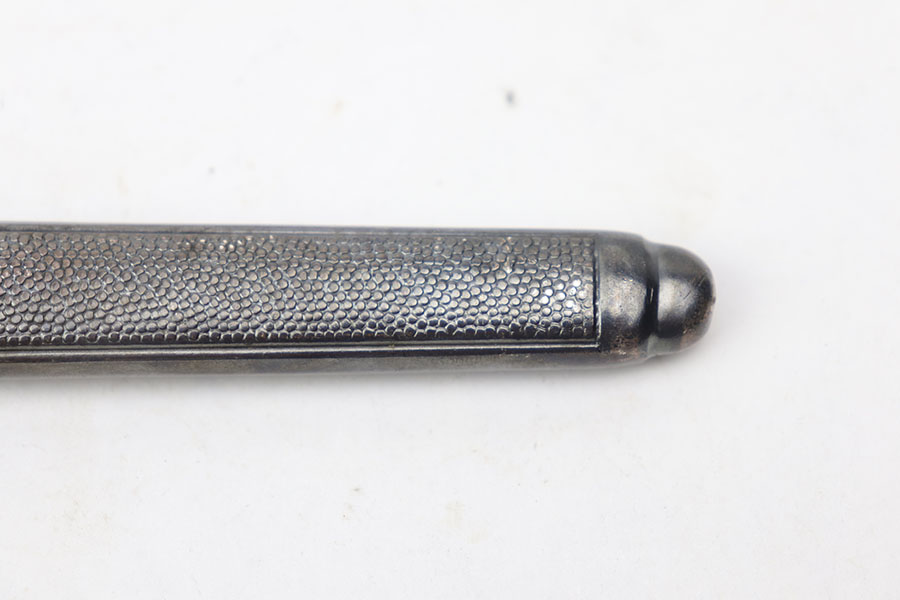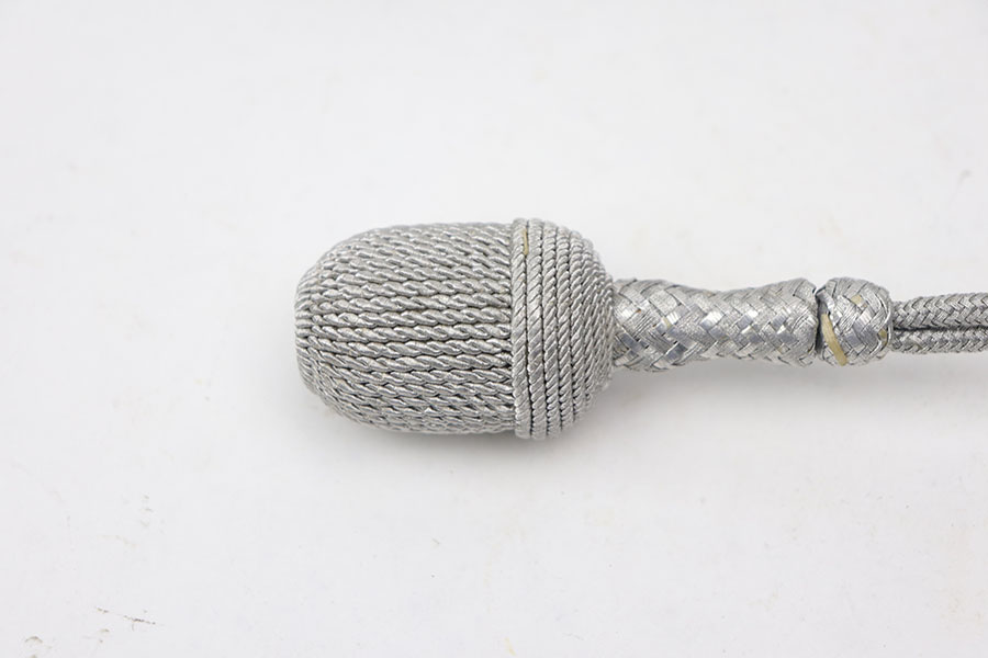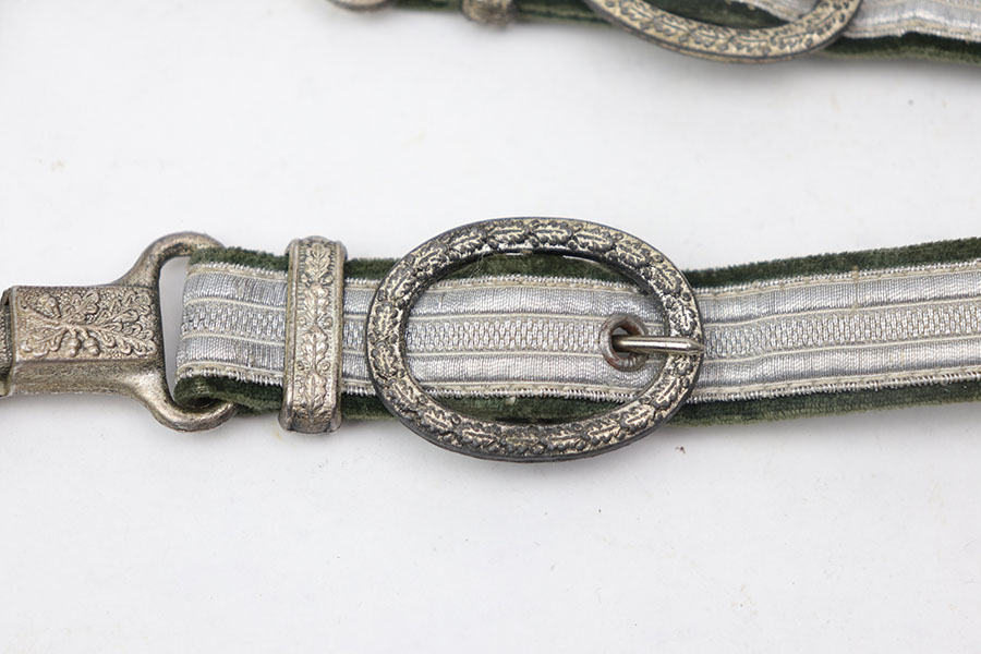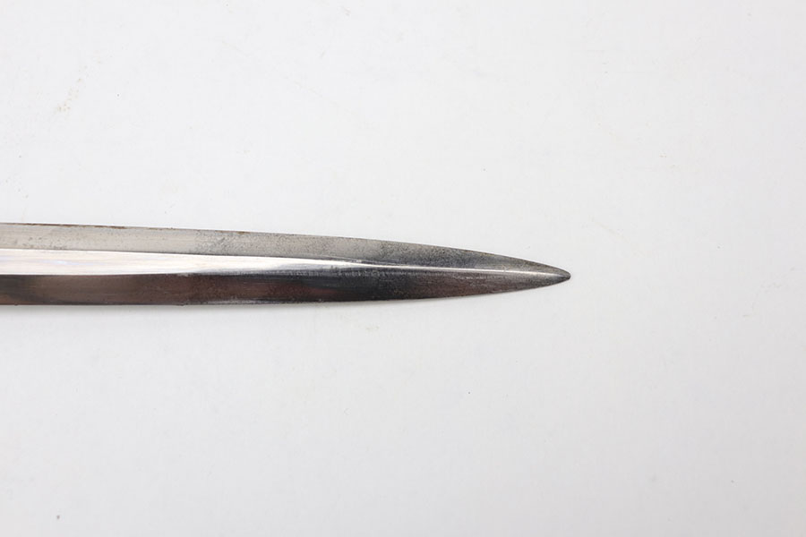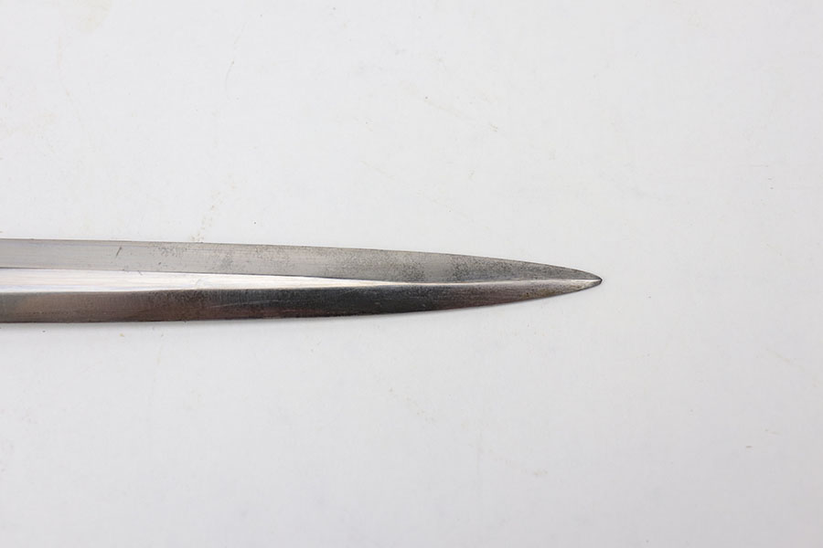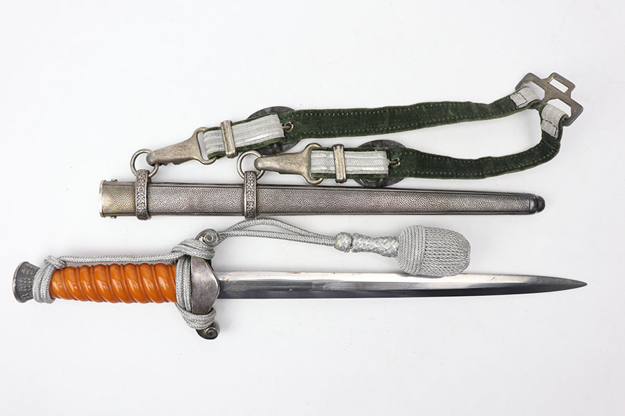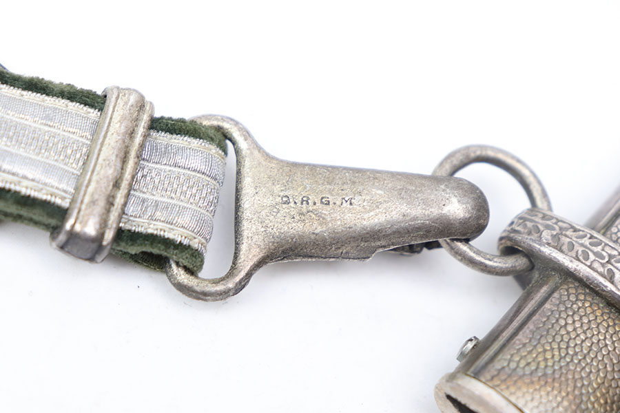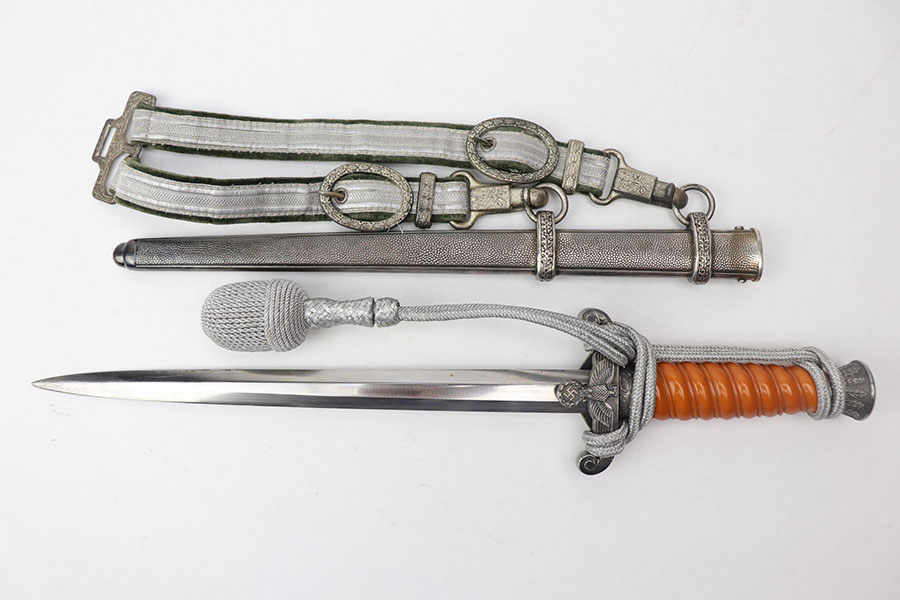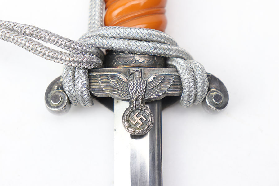 8/13/20 – This is a Nazi Wehrmacht ornamental dagger with orange handle and scabbard. The blade is stamped WKC Solingen and a knight trademark. The clasp is stamped D.R.G.M. with maker mark. The hanger cord is a bit faded but still attached and in very nice condition. The blade has a bit of wear from scabbard use. The dagger knot is excellent. Overall excellent condition.
