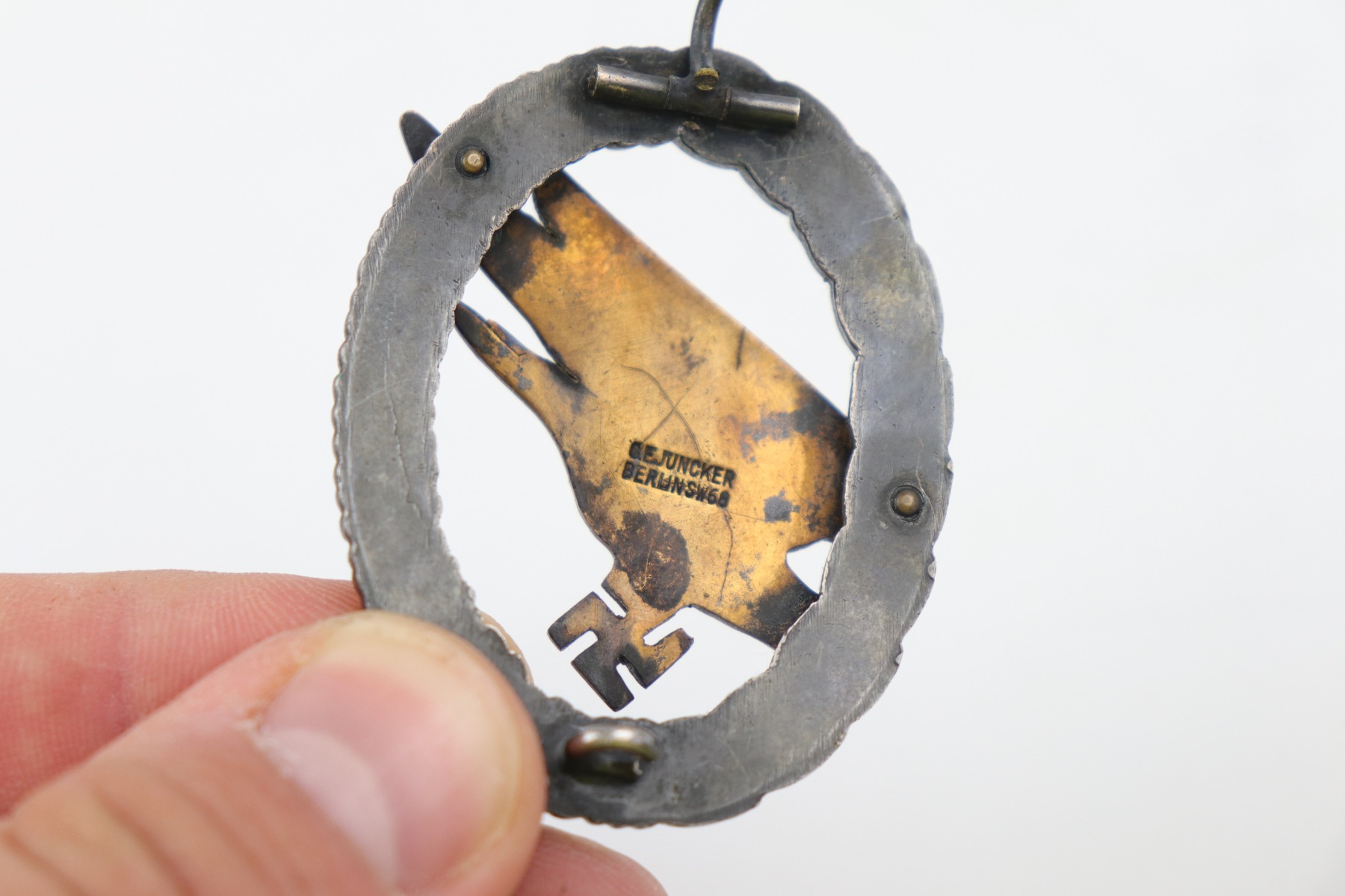 7/15/20 – This is a badge issued to a Nazi Wehrmacht paratrooper in WW2. The Parachutist Badge was first established by order of Hermann Göring on November 5, 1936. It was originally awarded to soldiers of the Luftwaffe after completion of parachute training and the required number of jumps. The badge depicted a diving eagle with a swastika in its claws surrounded by a silver wreath. It was worn over the left breast pocket. An army version was later introduced, with the swastika relocated to the top of the wreath and surmounted by a smaller upright eagle. This particular example is in excellent condition. There a few very small areas where the gold-plating has worn off. It is maker marked “CE Junker Berlin SW 68”.
