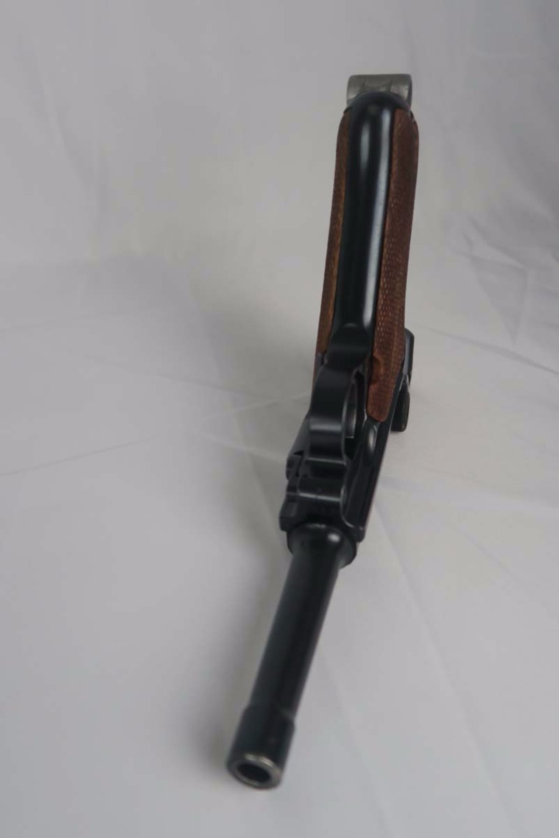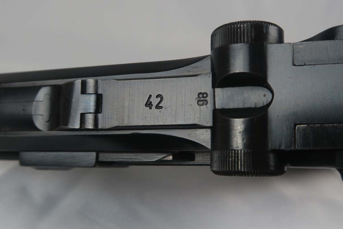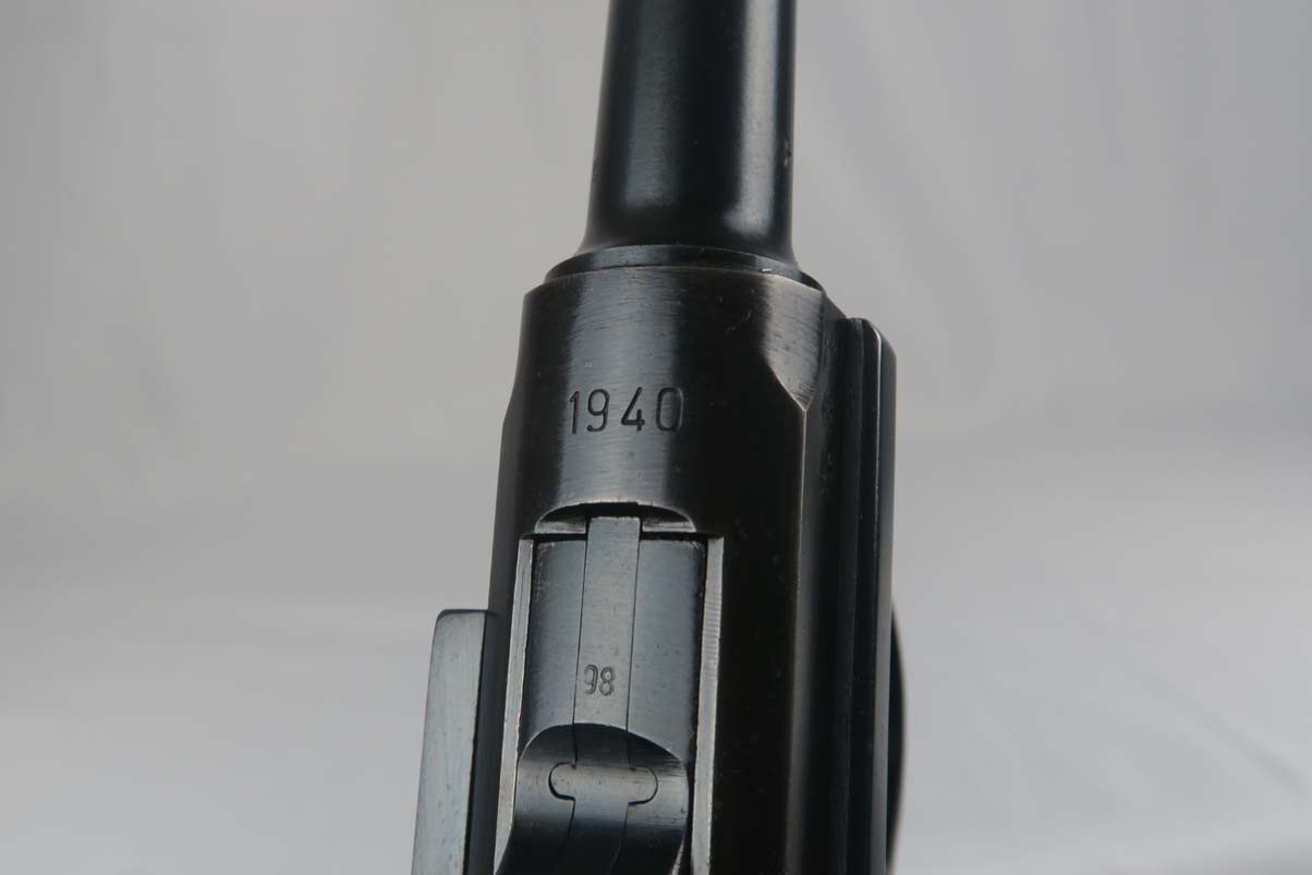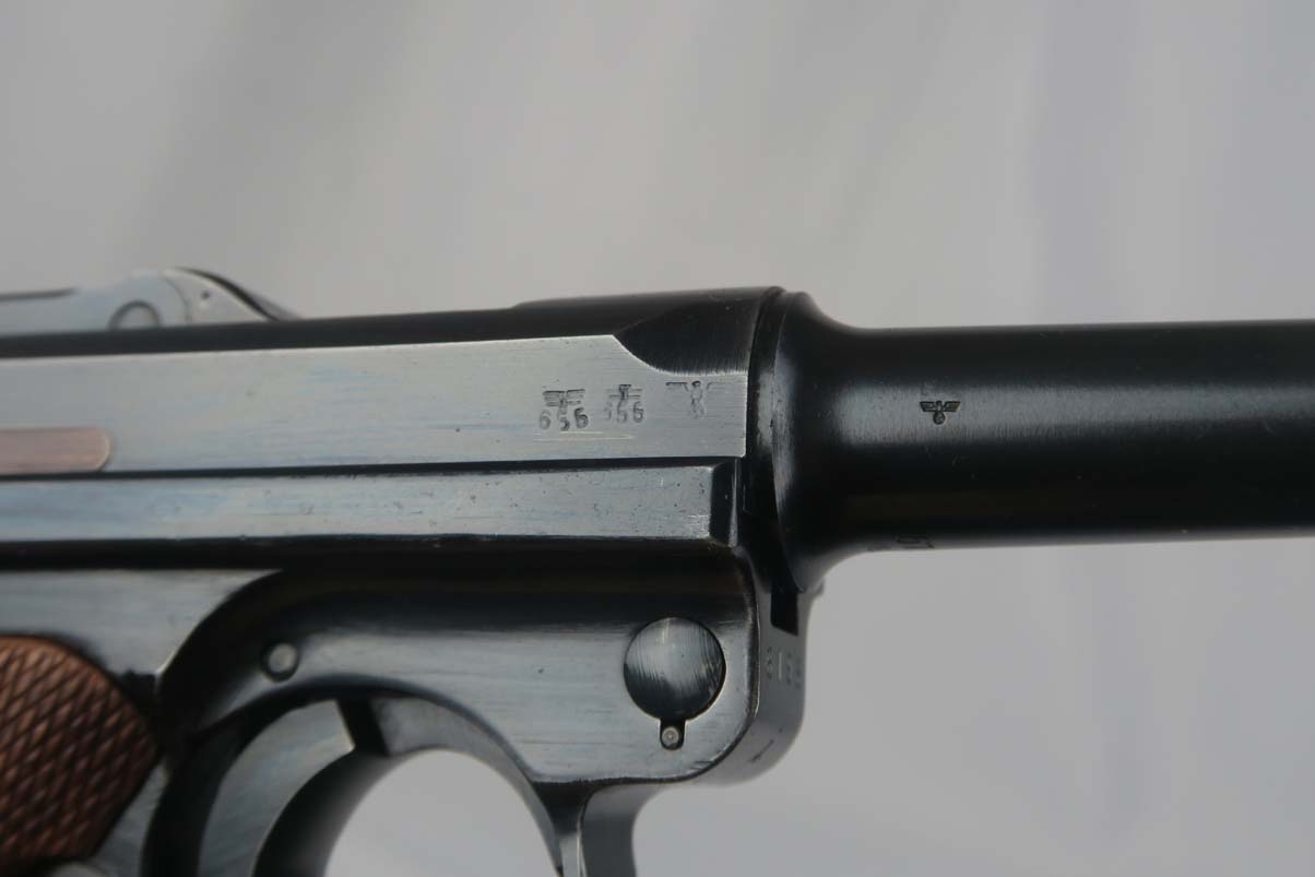 3/6/17 – This is a Nazi luger from 1940. Marked with the 41 Code which indicated it was made by Mauser. All of the numbers on this gun match, including all small parts, the grips and the magazine. The condition of the finish is excellent and I would rate in the 98% range. The grip straps are especially nice being a beautiful dark blue. This gun is not refinished or touched up. The grips are also a beautiful light wood and numbered as well as Eagle 655 proofed to match the gun. The bore is strong but a little cloudy. On a scale from 1 to 10, I would give it a 7. Mechanically excellent. An excellent example of a Nazi wartime military luger!