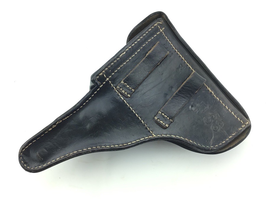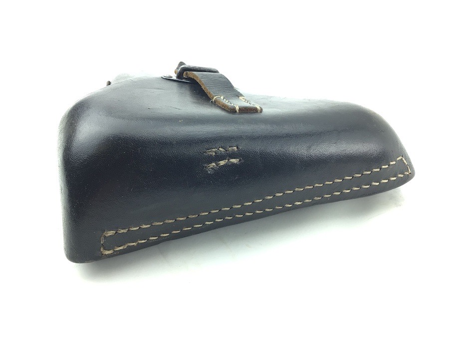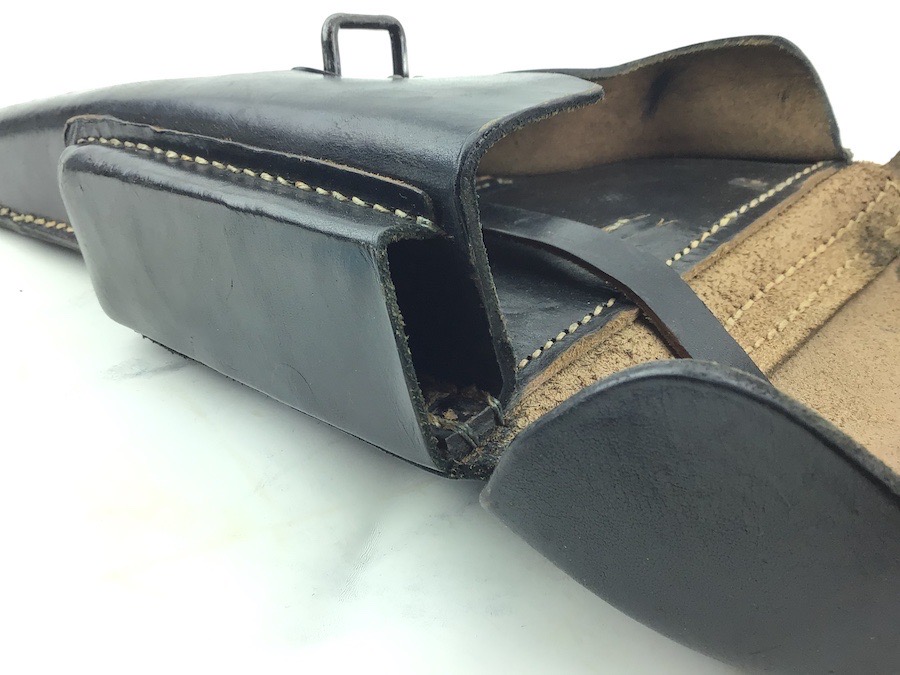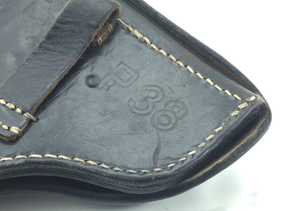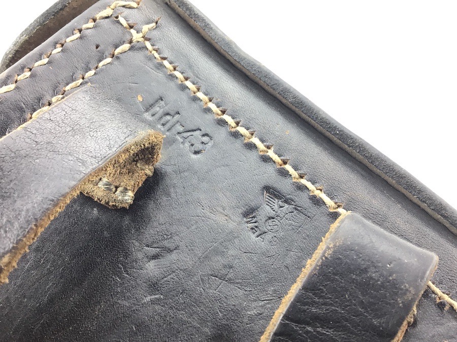 2/13/24 – Located at our Ohio office. Original and near mint condition. This holster is maker and date stamped on the back above the left belt loop “bdr 43”. It also feature a military waffen stamp WaA8 and the designation of “P.38” Completely intact stitching and a super clean interior. The exterior shows only minor wear marks.