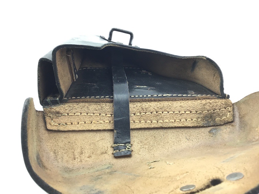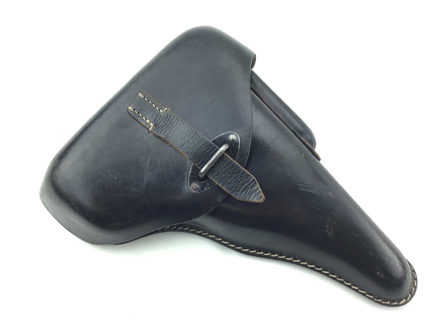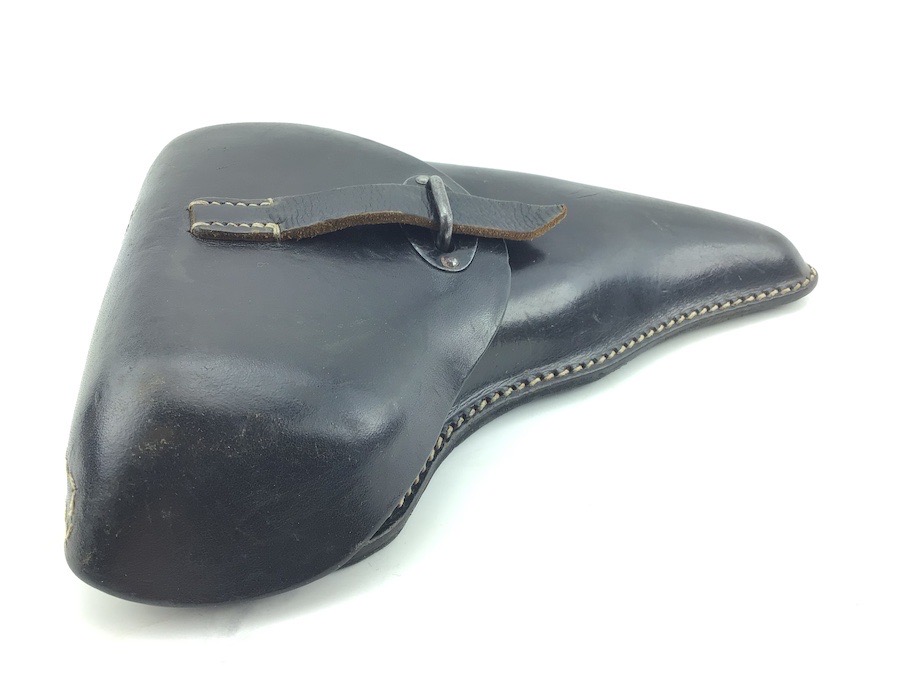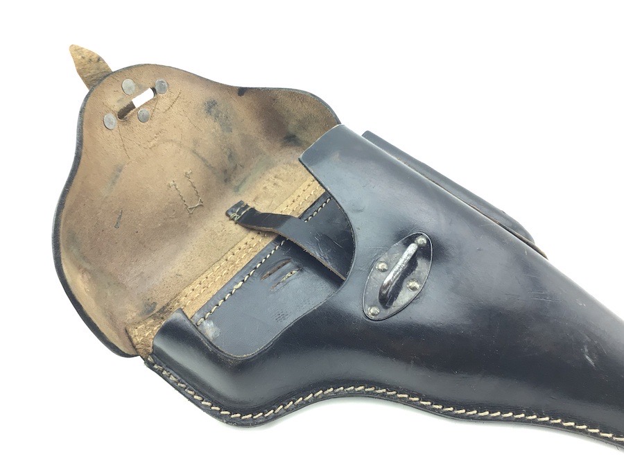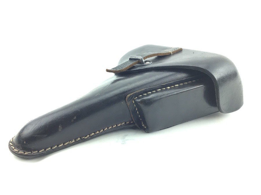 2/13/24 – Located at our Ohio office. Original and near mint condition. This holster is maker and date stamped on the back above the left belt loop “bdr 43”. It also feature a military waffen stamp WaA8 and the designation of “P.38” Completely intact stitching and a super clean interior. The exterior shows only minor wear marks.