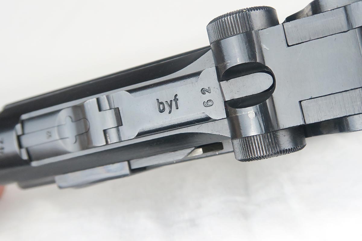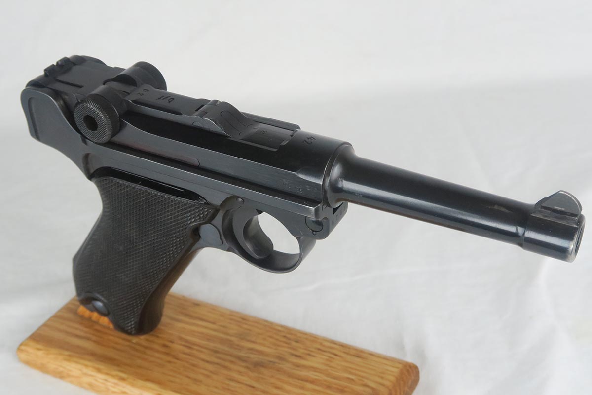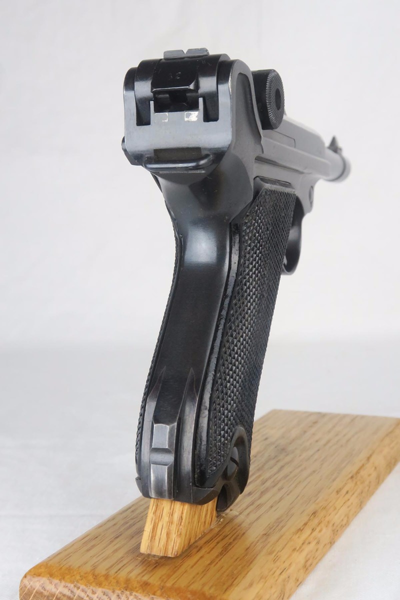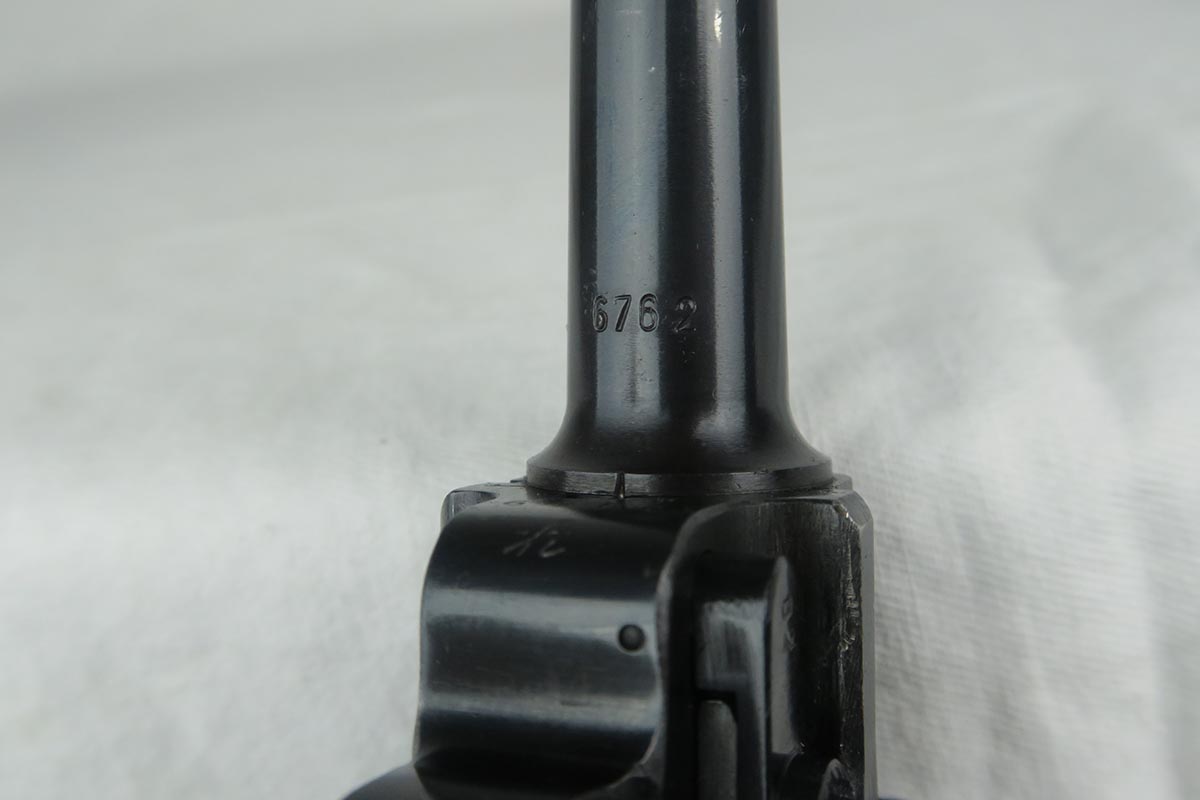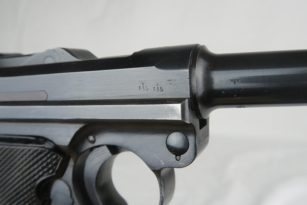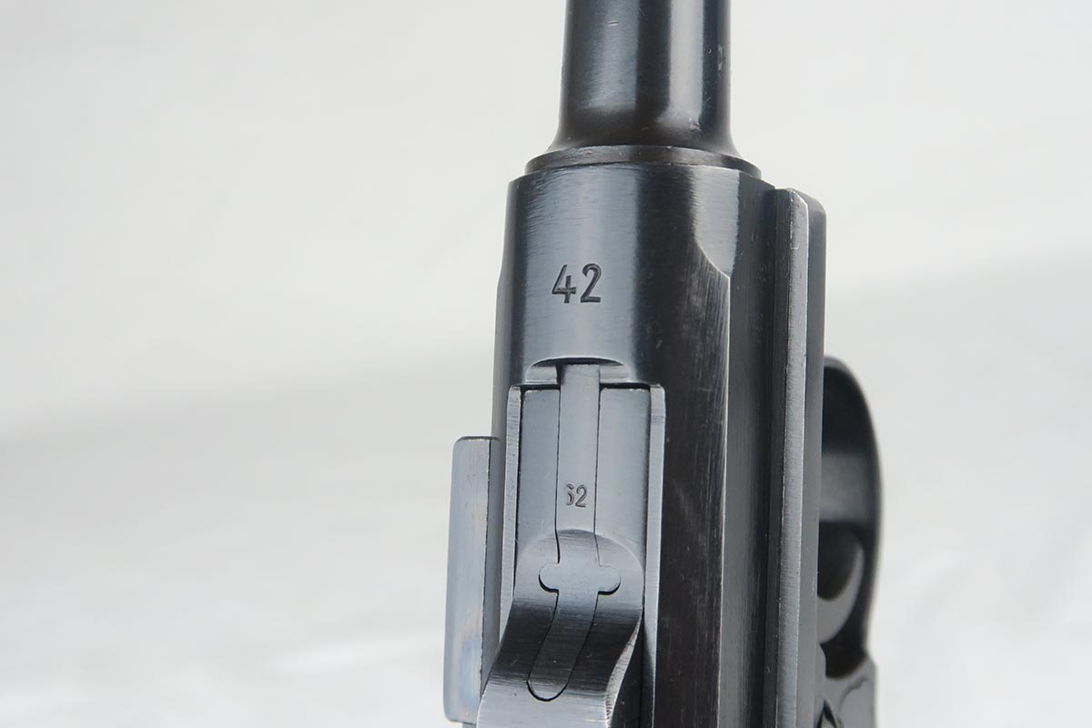 12/6/17 – This is a near-mint Black Widow Mauser luger that was manufactured in 1942.  It is all original and matching with 98+% blue remaining.  There is minor high edge wear and a spot of wear on the bottom of the front strap.  Original and correct Black Widow-style magazine and grips.  Excellent bore that shows minor use.