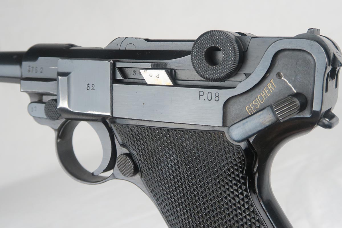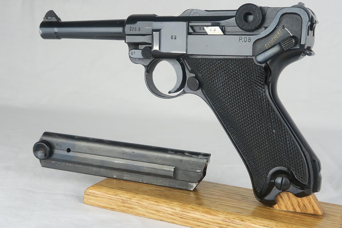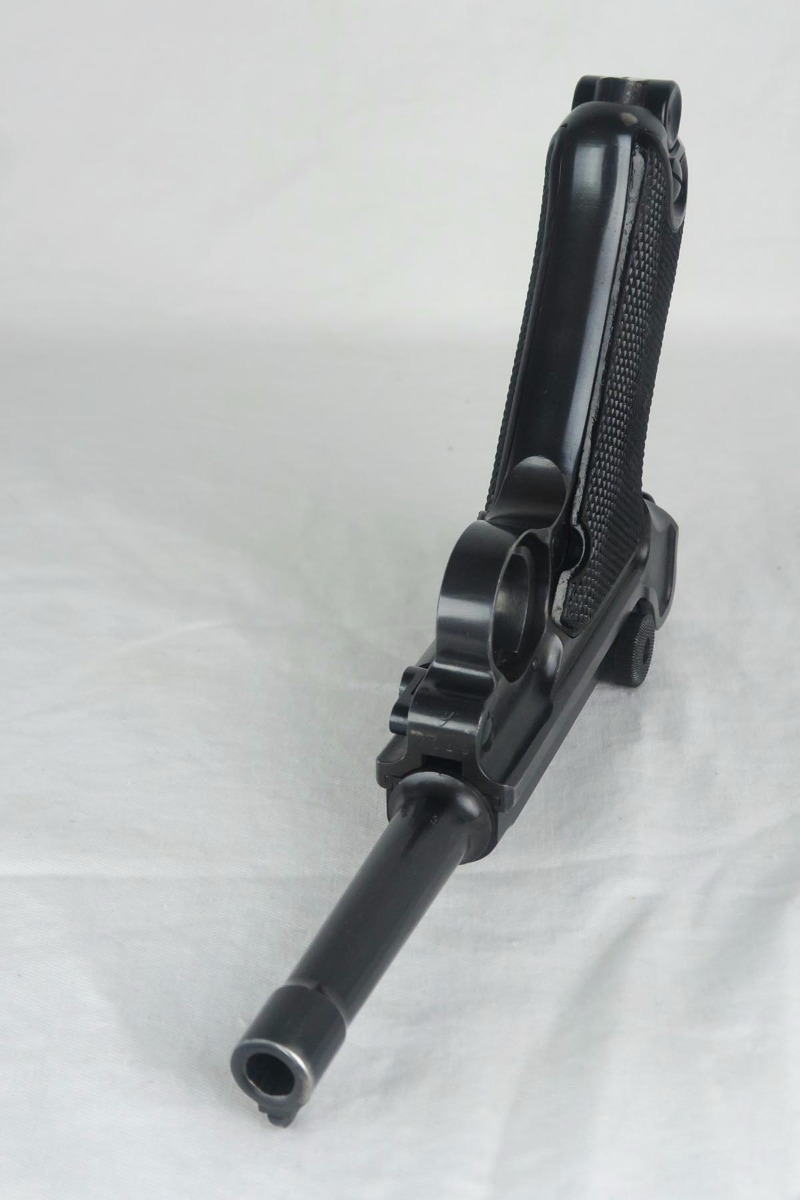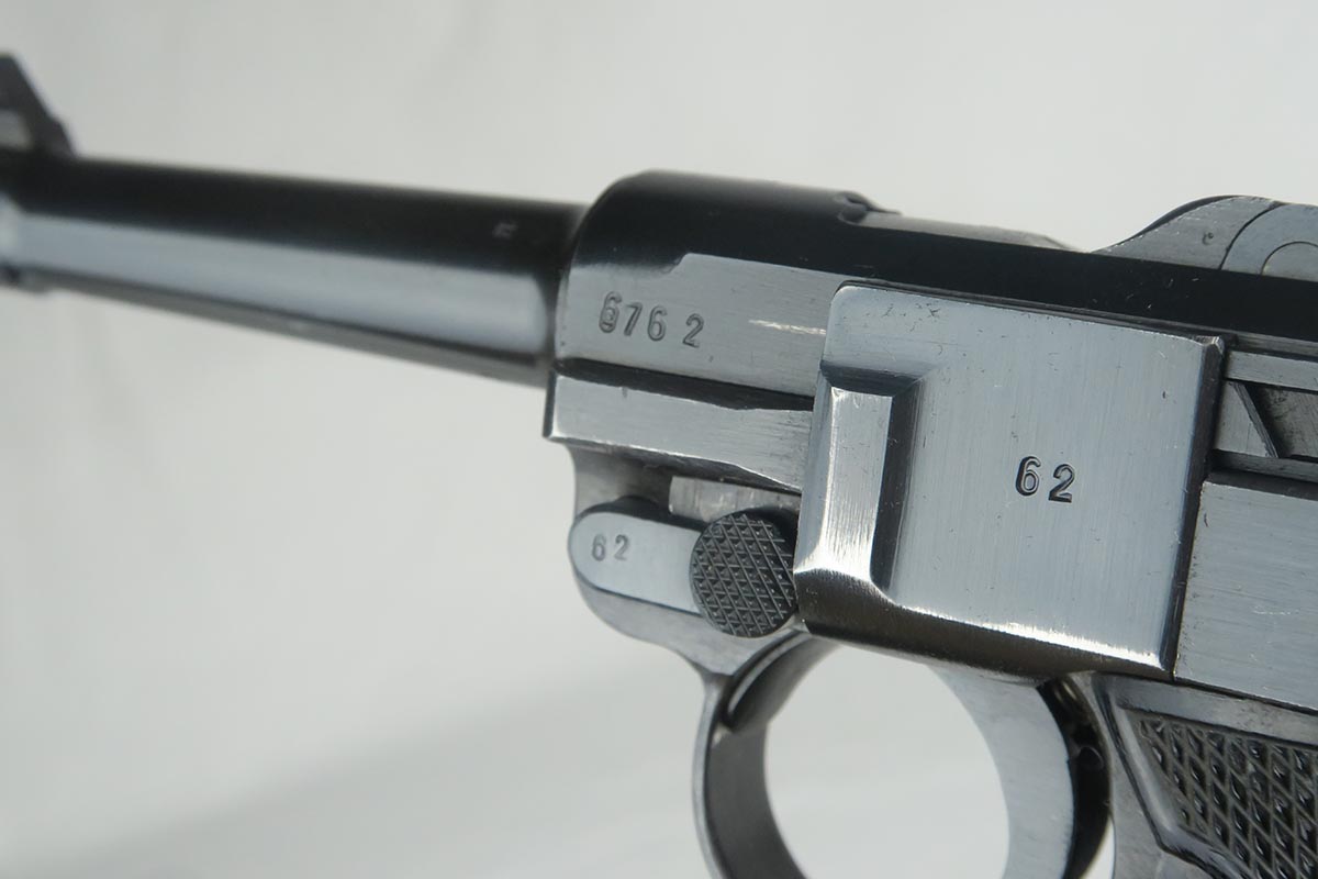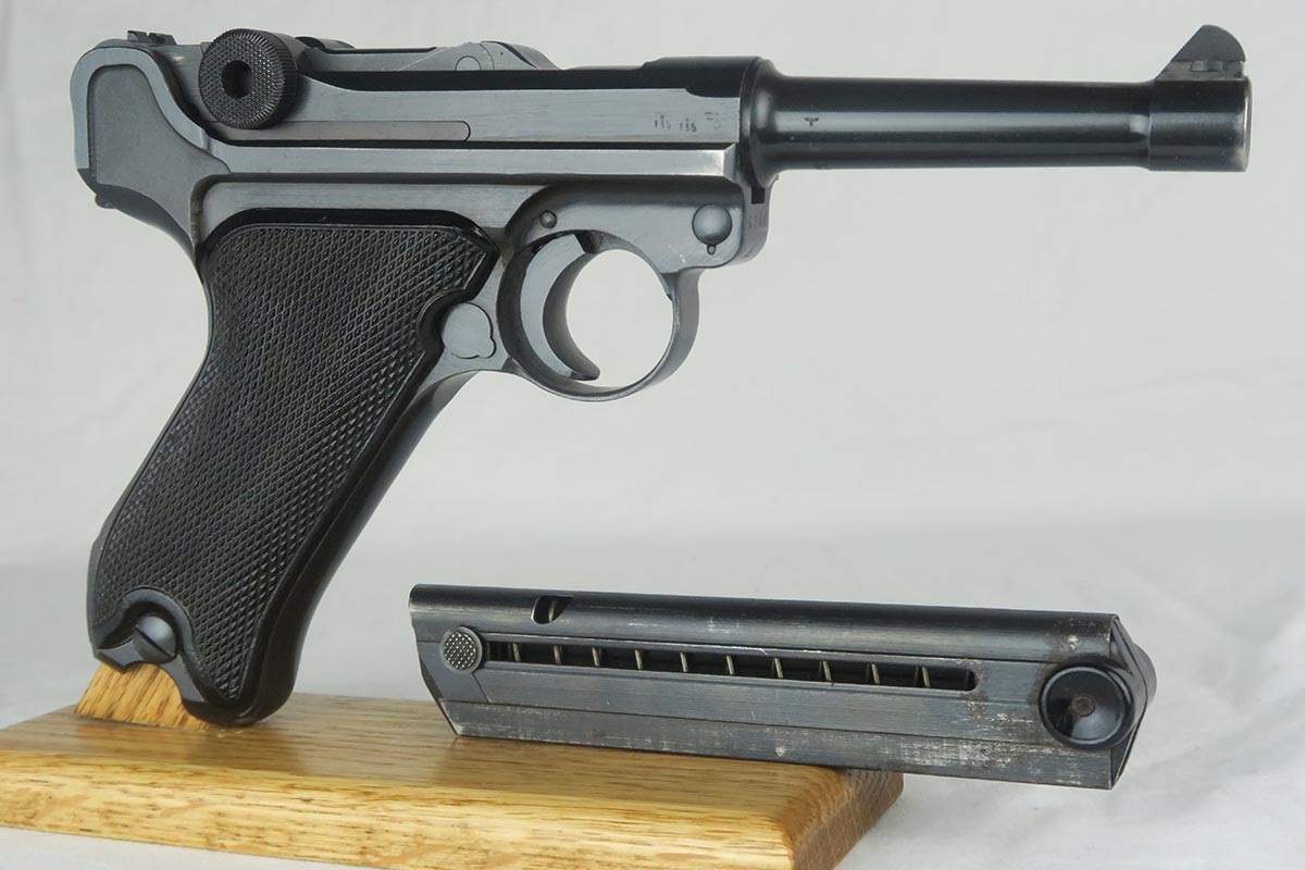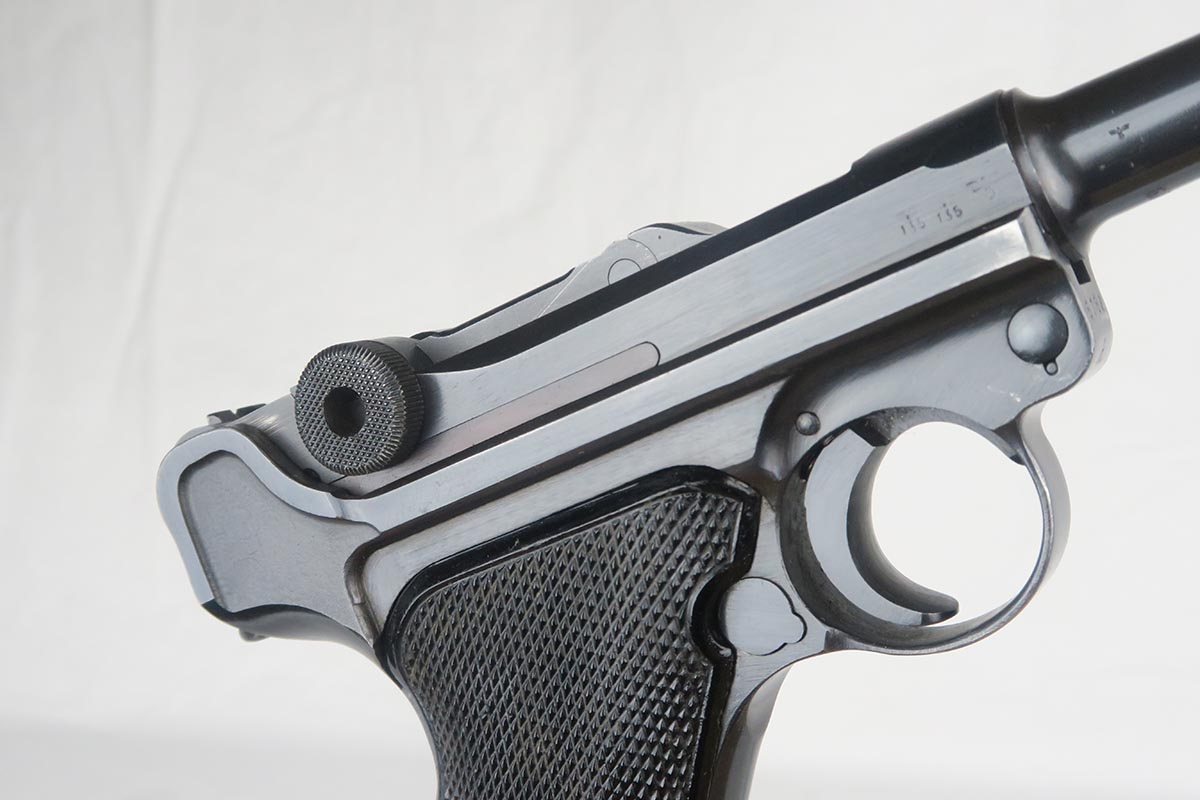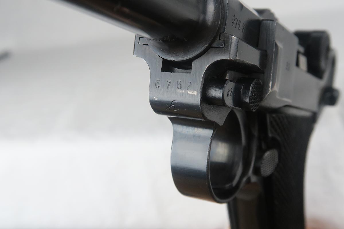 12/6/17 – This is a near-mint Black Widow Mauser luger that was manufactured in 1942.  It is all original and matching with 98+% blue remaining.  There is minor high edge wear and a spot of wear on the bottom of the front strap.  Original and correct Black Widow-style magazine and grips.  Excellent bore that shows minor use.