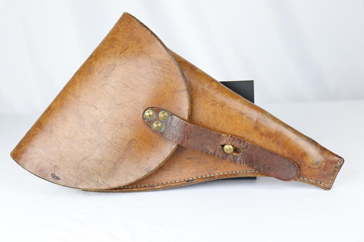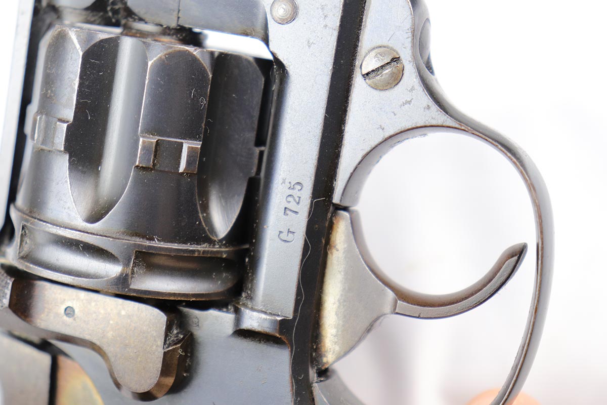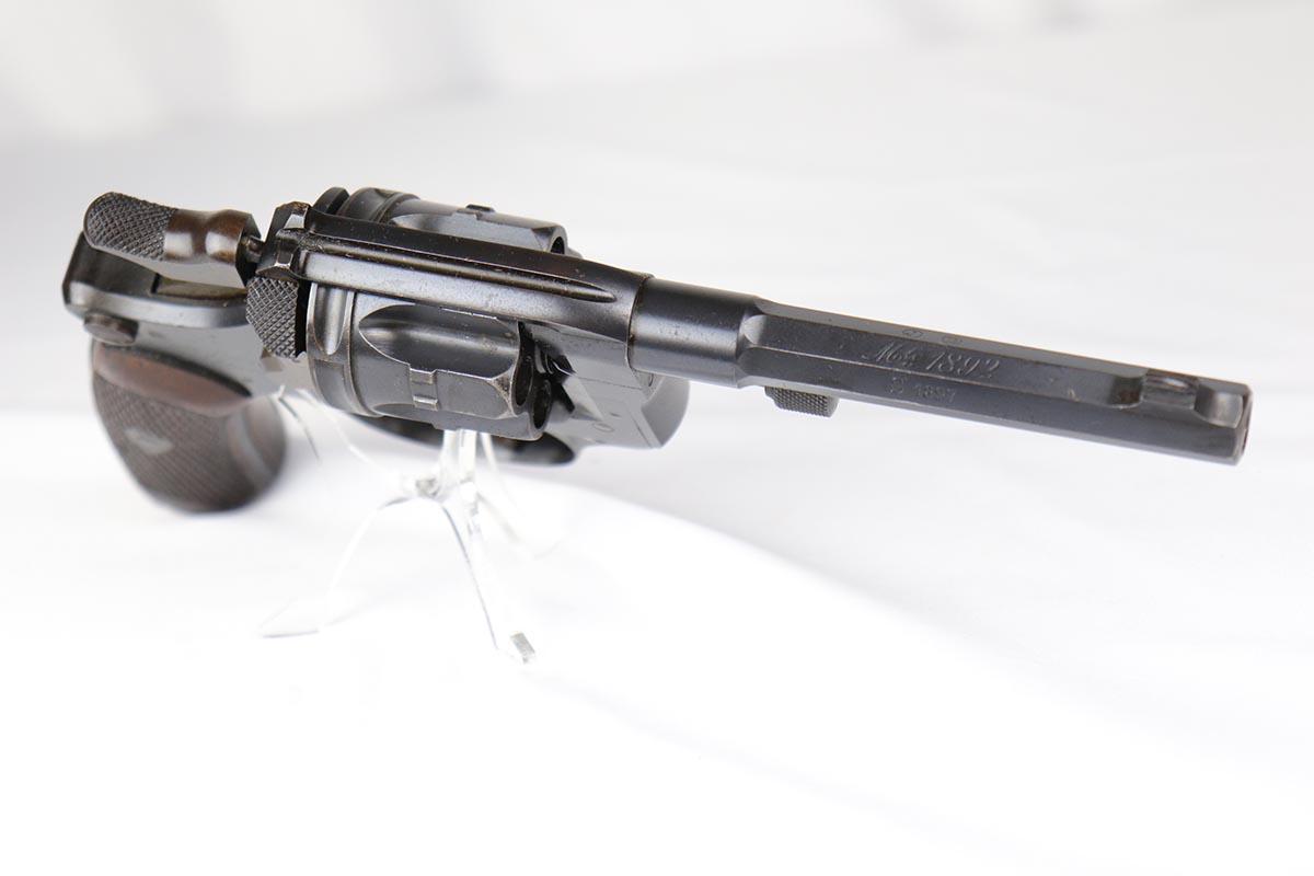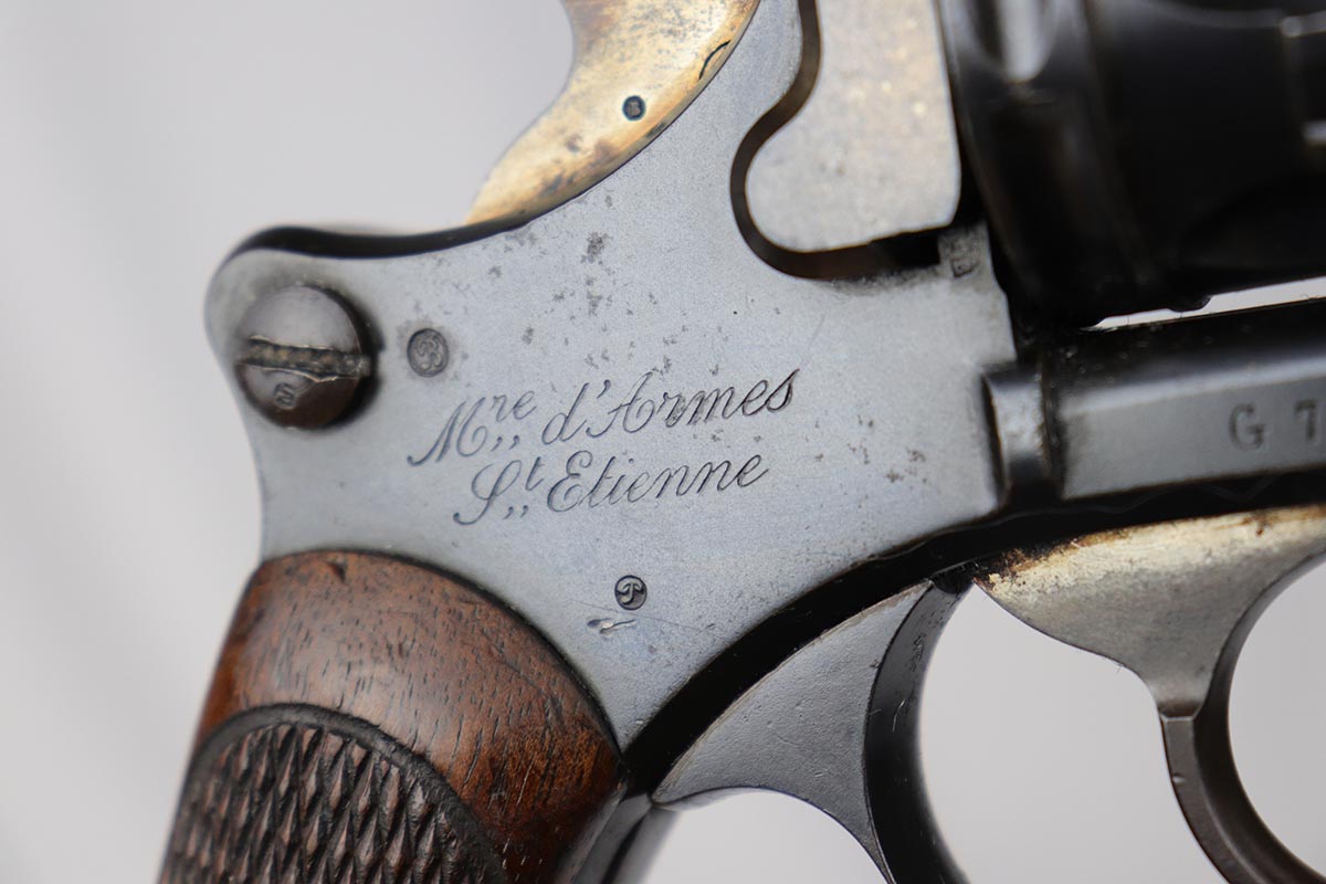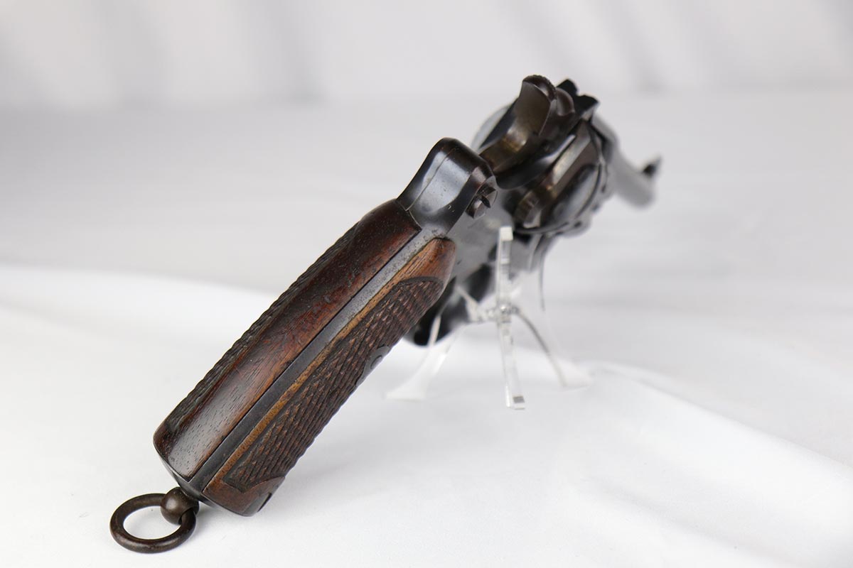 3/1/18 – This is a beautiful and early French “St. Entienne” revolver, made in 1897. It retains over 98% of its original blue with strong straw colors on the small parts. All matching with excellent bore and grips and an original leather holster with some markings inside the flap. Early rust blue finish is without any evidence of thinning with no rust or pitting. Antique!