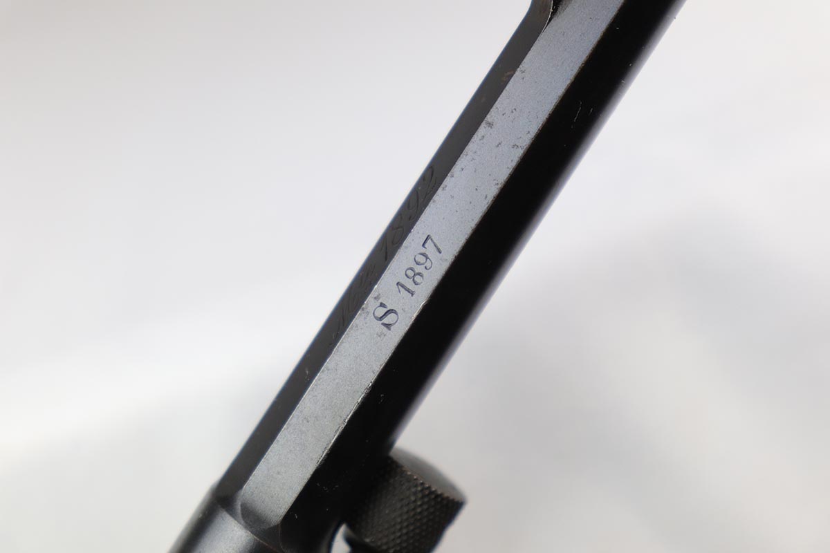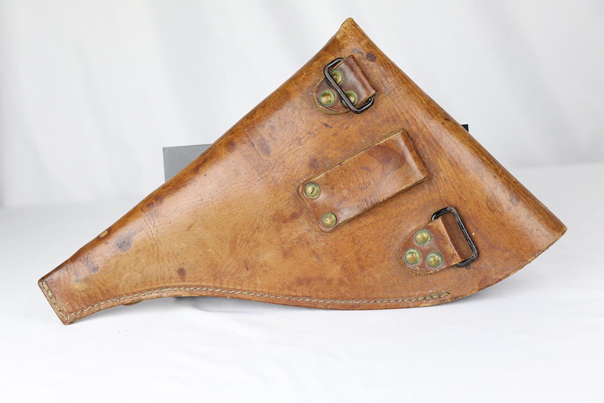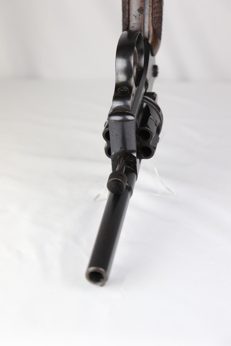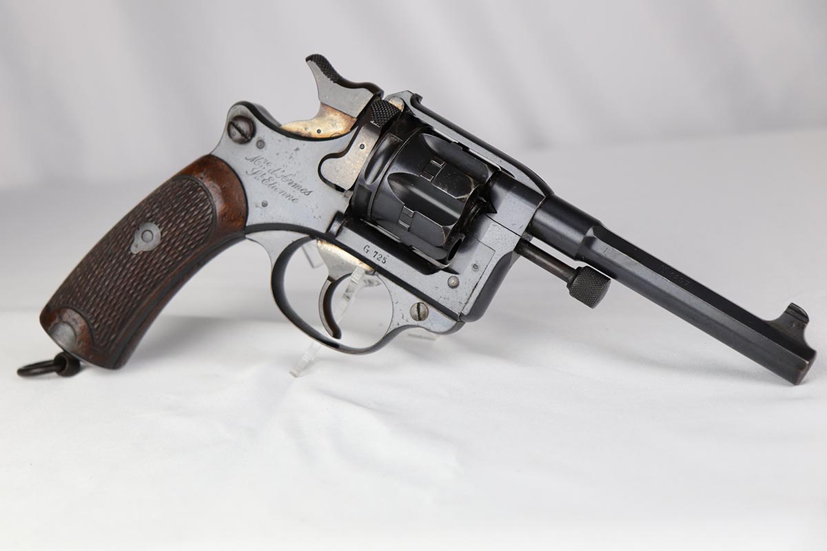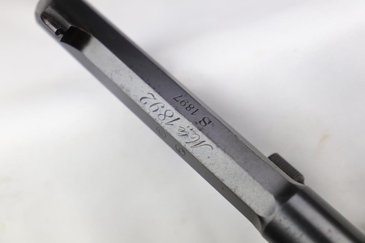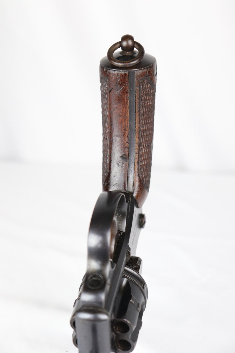 3/1/18 – This is a beautiful and early French “St. Entienne” revolver, made in 1897. It retains over 98% of its original blue with strong straw colors on the small parts. All matching with excellent bore and grips and an original leather holster with some markings inside the flap. Early rust blue finish is without any evidence of thinning with no rust or pitting. Antique!