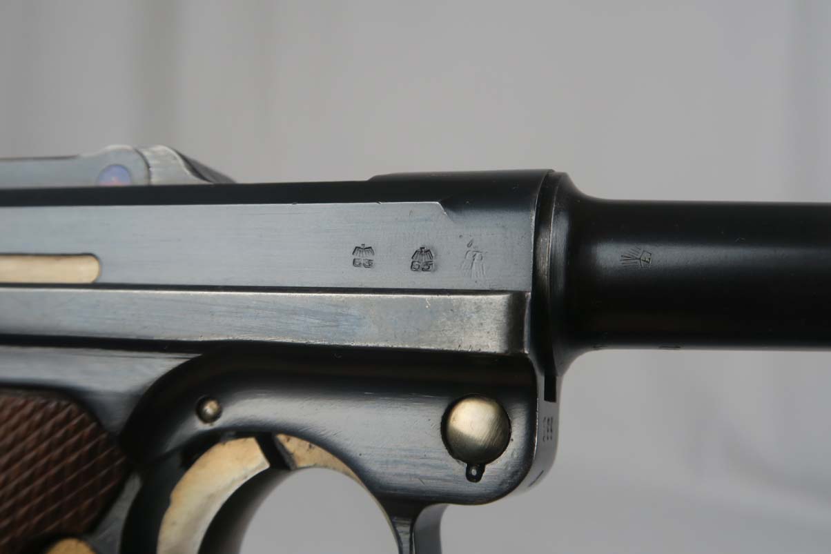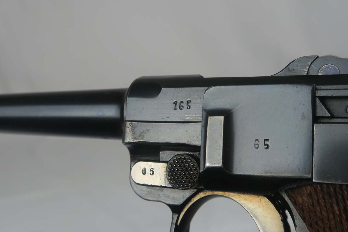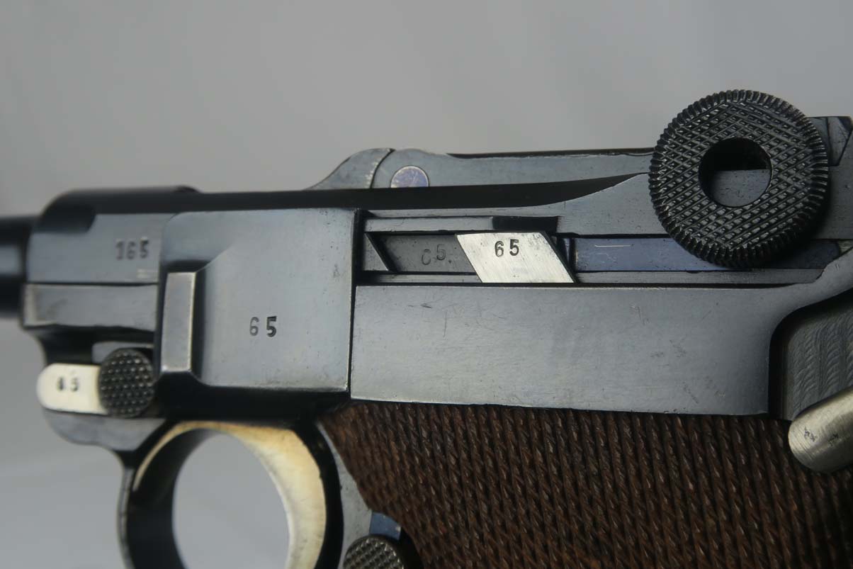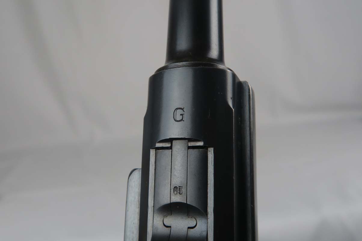 3/31/17 – This is a near mint Mauser luger, produced in 1935. At this time, the Germans were trying to hide production numbers so these early Mauser lugers were given letter codes rather than dates above the chamber. The original finish on this one is about 98%, with just some regularly found high edge wear. The straw is about 70%. It has the correct halos on the serial under the barrel, and all internal parts that should be unfinished are in the white. It is all matching aside from the magazine and grips. Only about 10% of G Date’s had numbered grips, so it’s likely these unnumbered grips are correct. The magazine is correct for a G Date, but numbered to another gun. The bore is strong and I would rate an 8 on a scale from 1 to 10. An excellent example of an early Mauser luger that survived the war in GREAT shape.