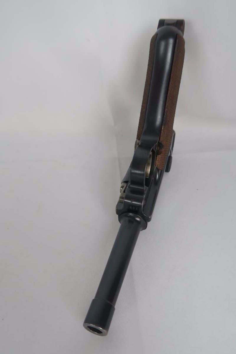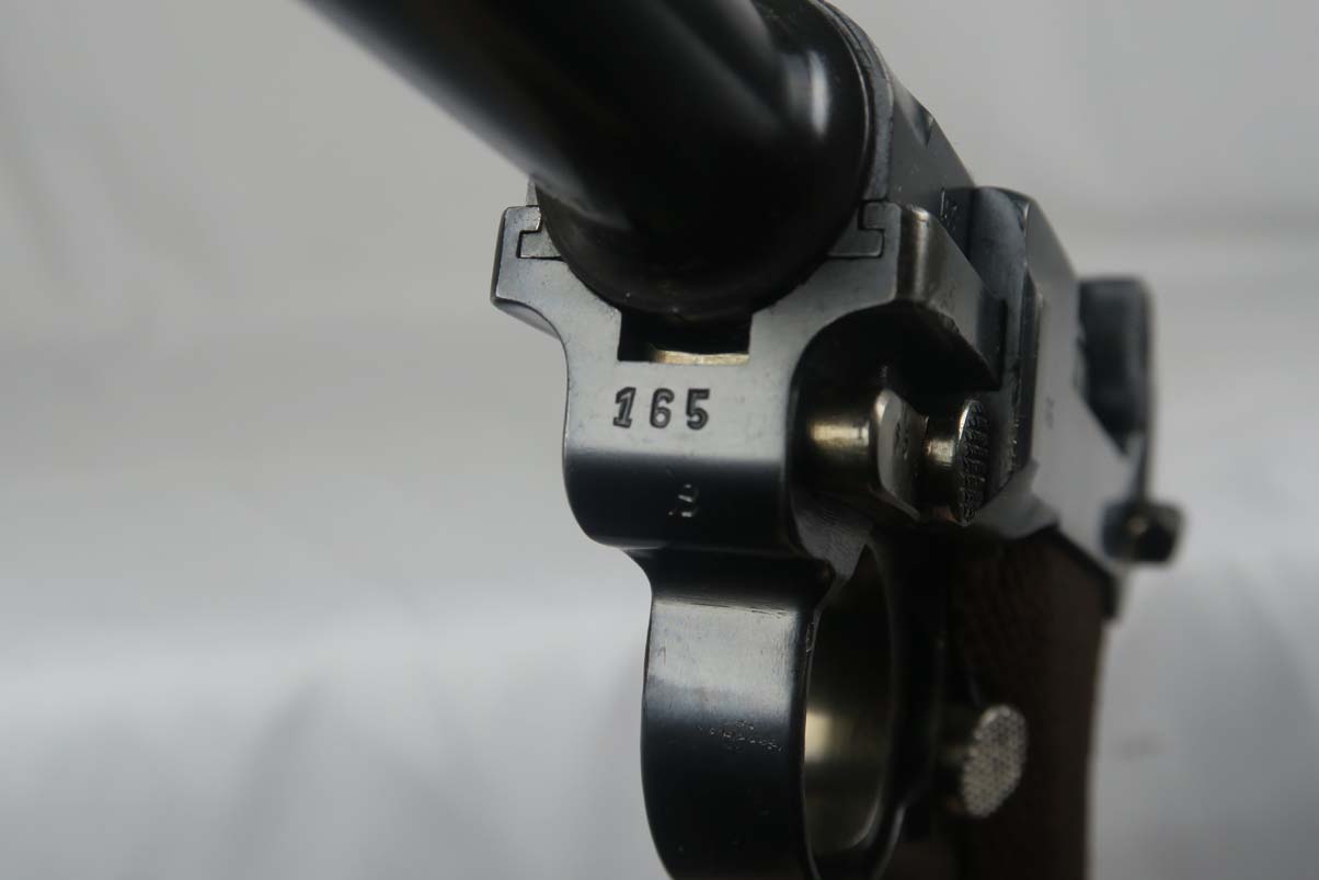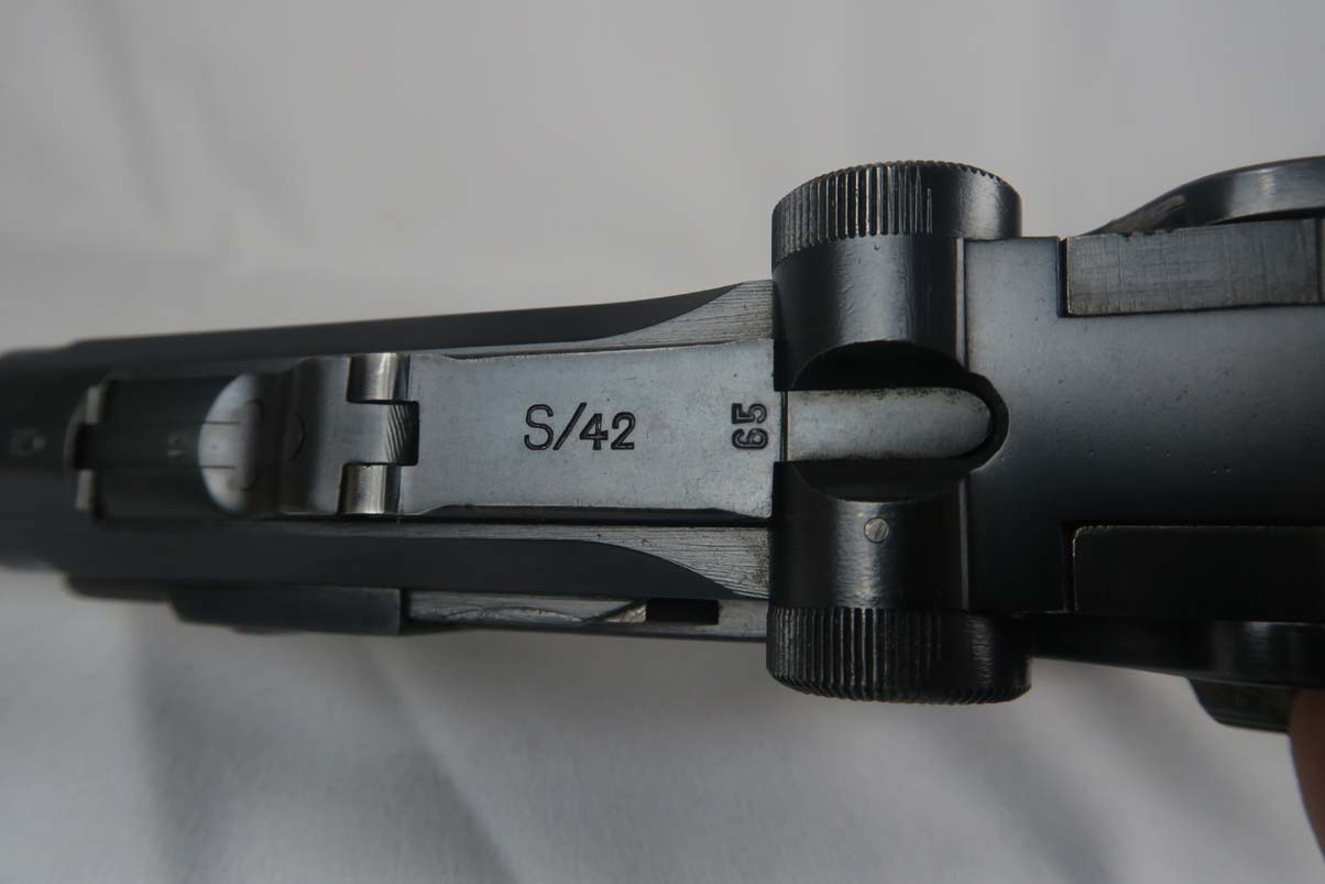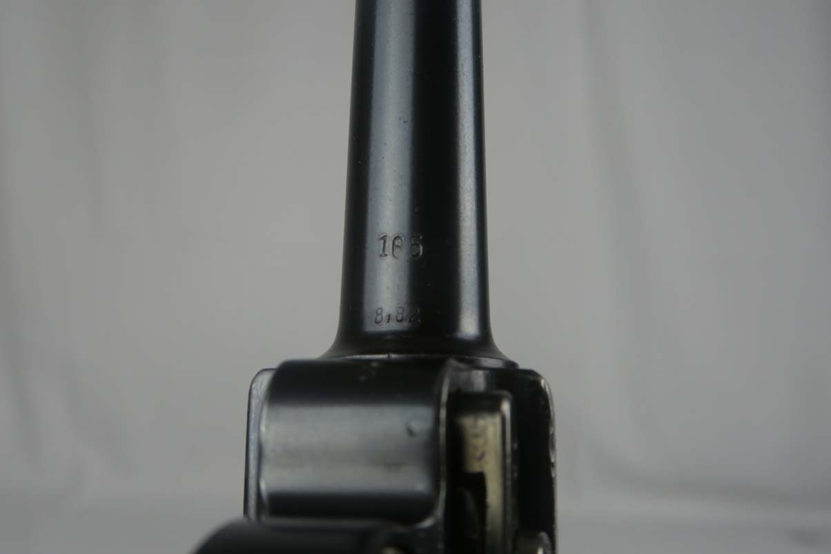 3/31/17 – This is a near mint Mauser luger, produced in 1935. At this time, the Germans were trying to hide production numbers so these early Mauser lugers were given letter codes rather than dates above the chamber. The original finish on this one is about 98%, with just some regularly found high edge wear. The straw is about 70%. It has the correct halos on the serial under the barrel, and all internal parts that should be unfinished are in the white. It is all matching aside from the magazine and grips. Only about 10% of G Date’s had numbered grips, so it’s likely these unnumbered grips are correct. The magazine is correct for a G Date, but numbered to another gun. The bore is strong and I would rate an 8 on a scale from 1 to 10. An excellent example of an early Mauser luger that survived the war in GREAT shape.