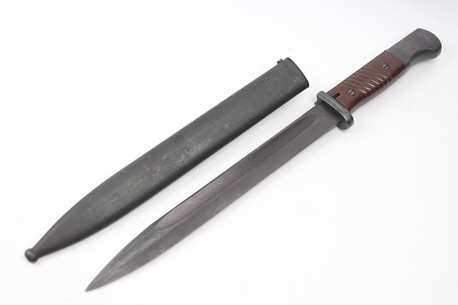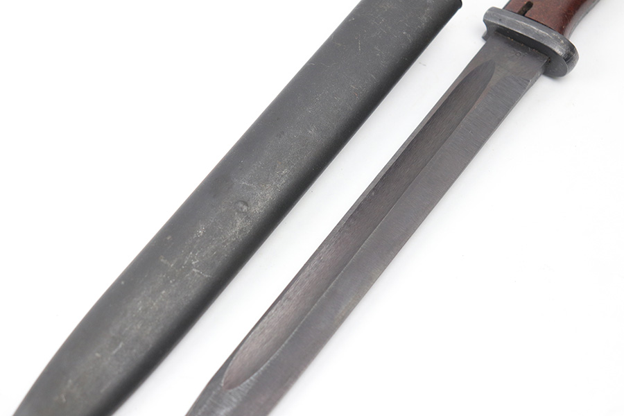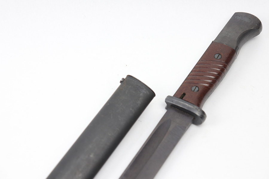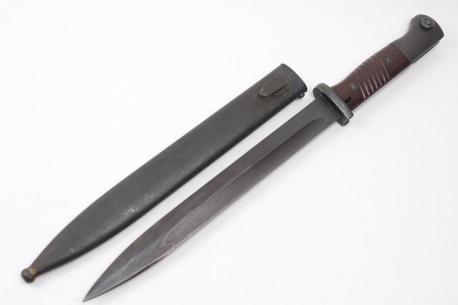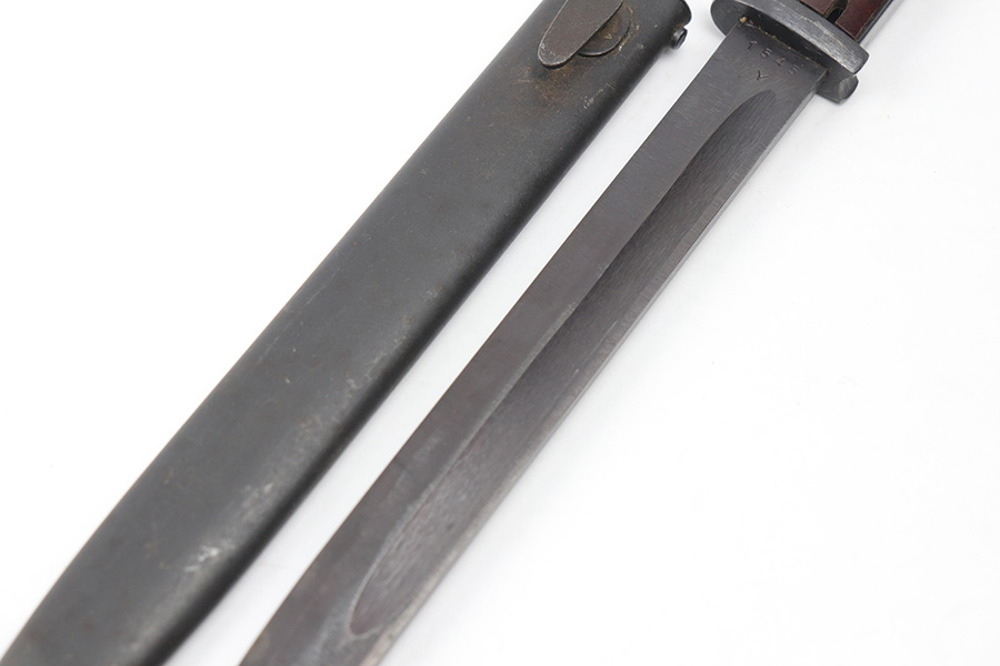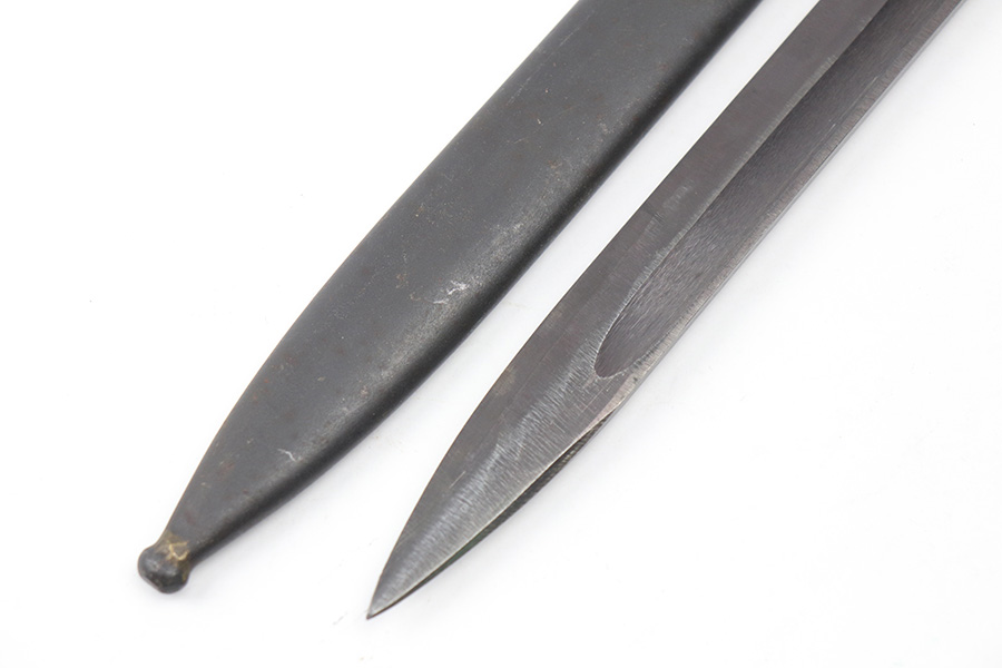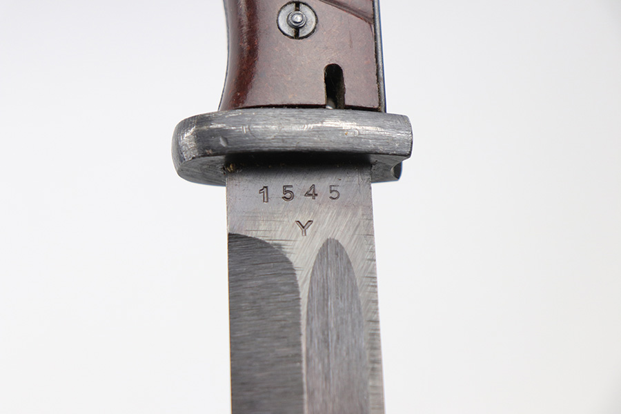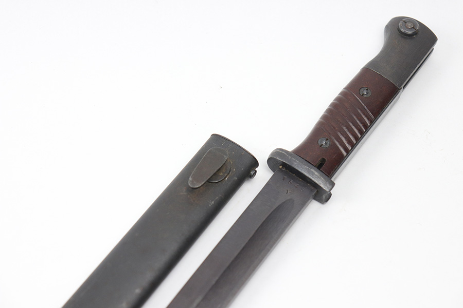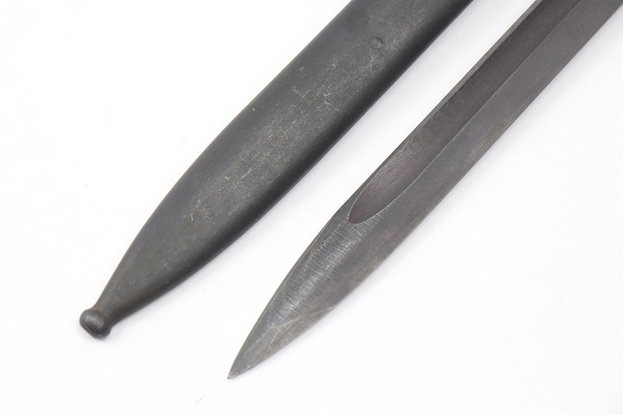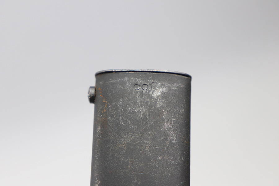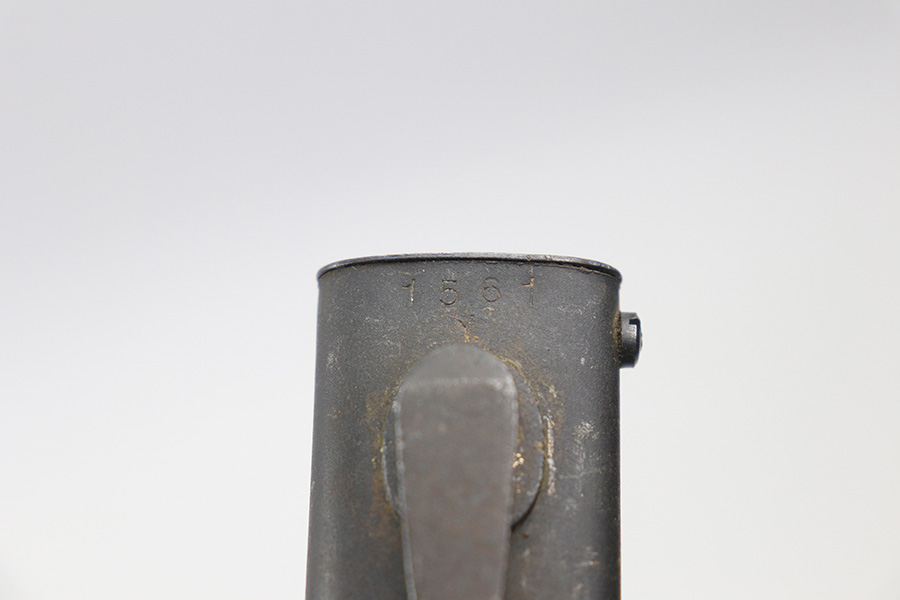 10/27/21 – This is an original 1944 K98 bayonet with a closely numbered, but non-matching scabbard. Both the blade and the scabbard are “cof” maker stamped with a “44” date stamp. The serial number on the blade is 1545Y, and the scabbard is numbered 1561Y. So they’re very close, but non matching. Excellent finish throughout the blade and the scabbard.